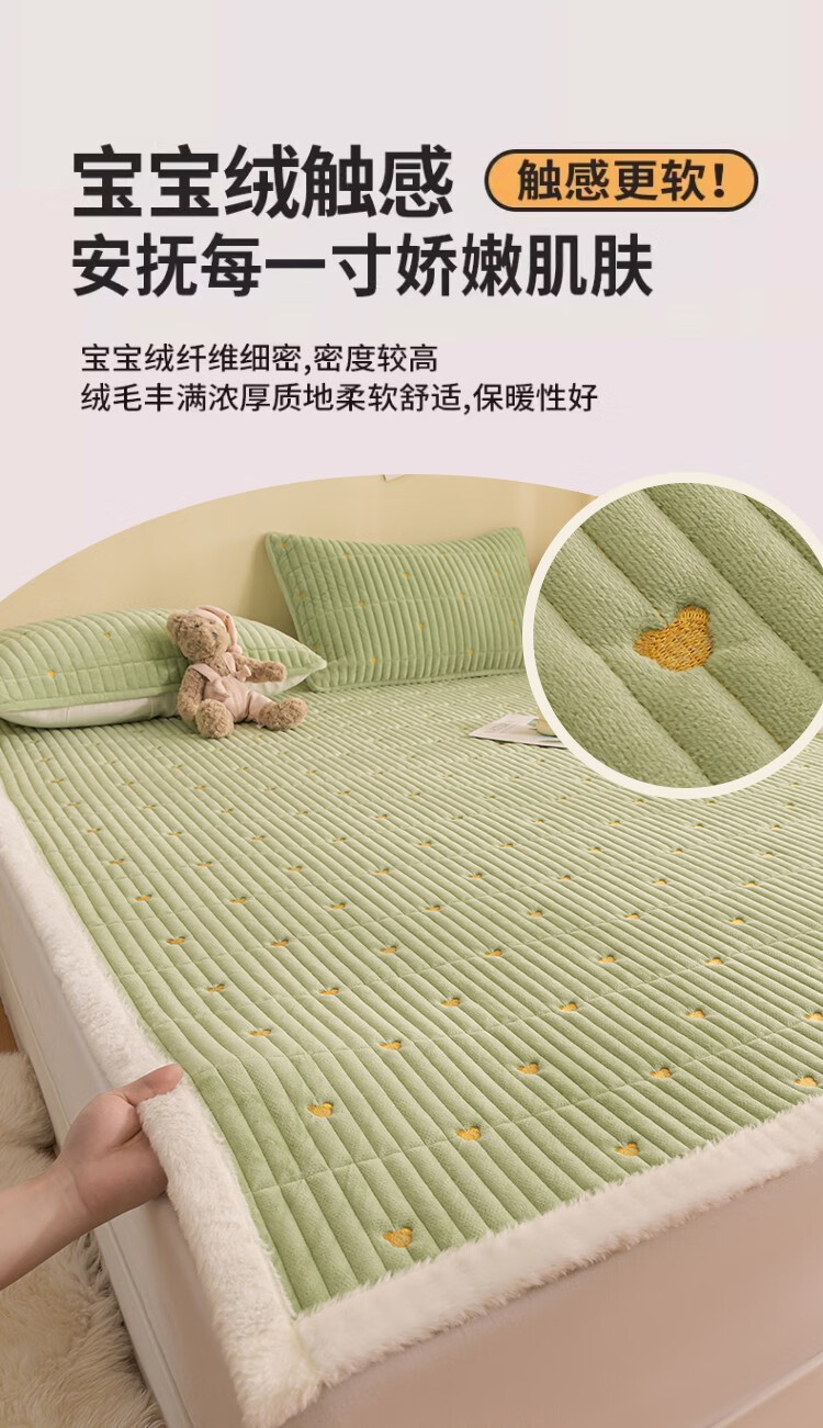 红蜻蜓(RED DRAGONFLY)牛奶绒床垫褥子冬季加厚毛毯垫被家用单双人床褥垫子1.5米x2米 熊熊-温暖绿【贴肤柔软 不易掉毛】 单床褥-150x200cm【防滑 不位移】