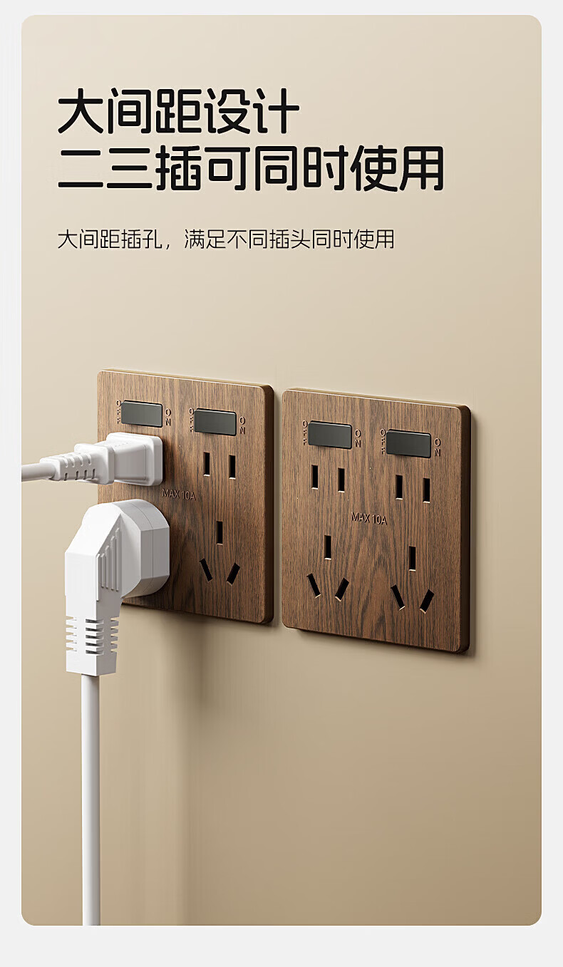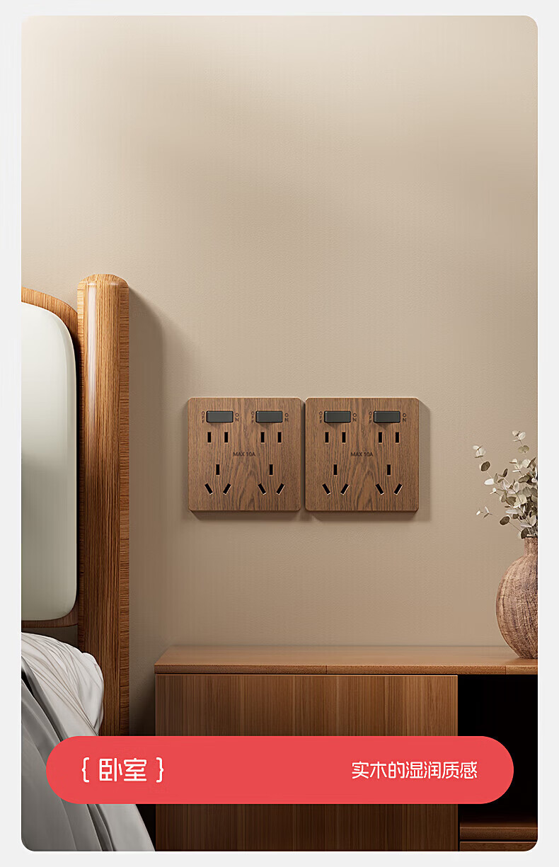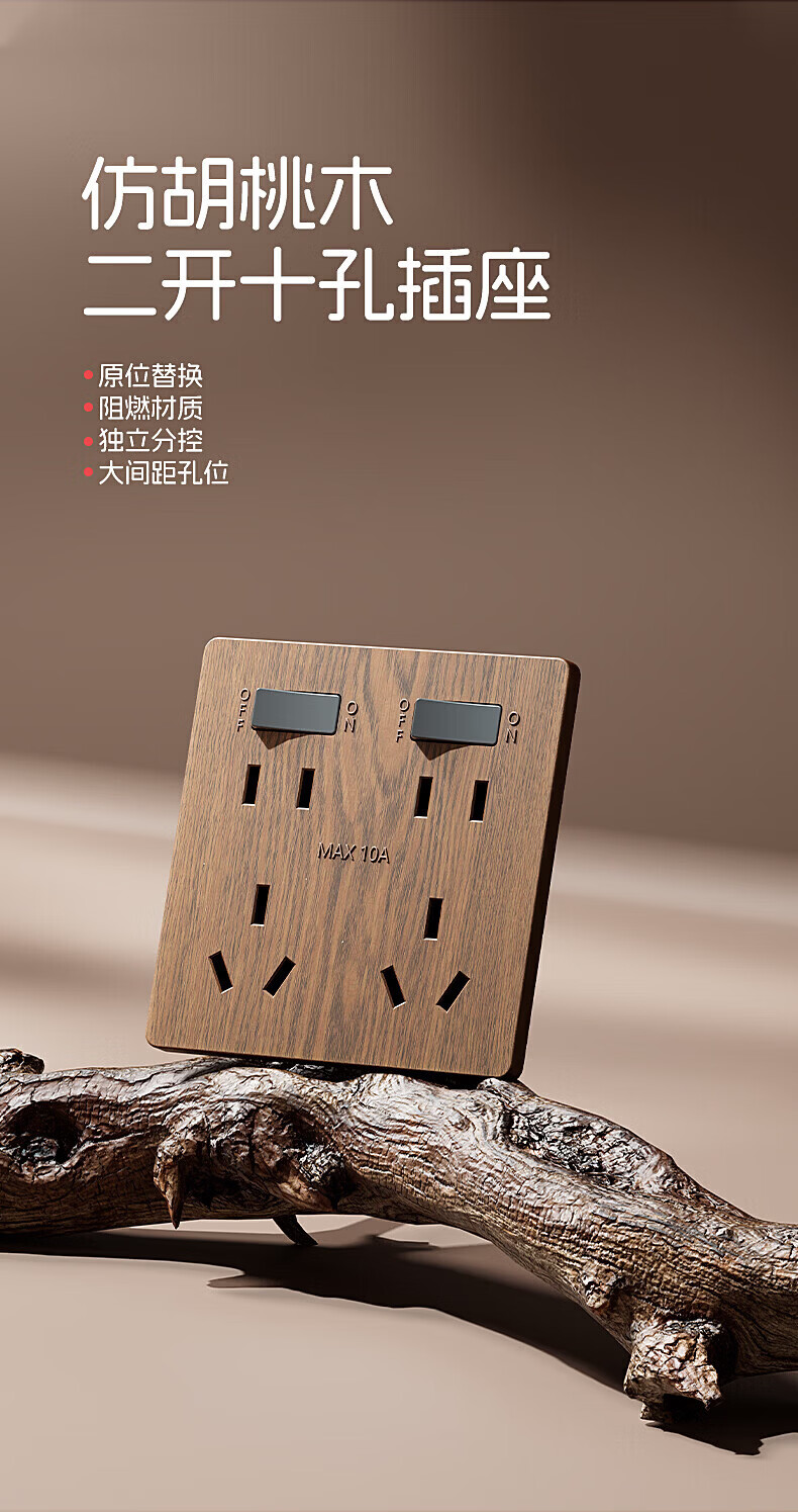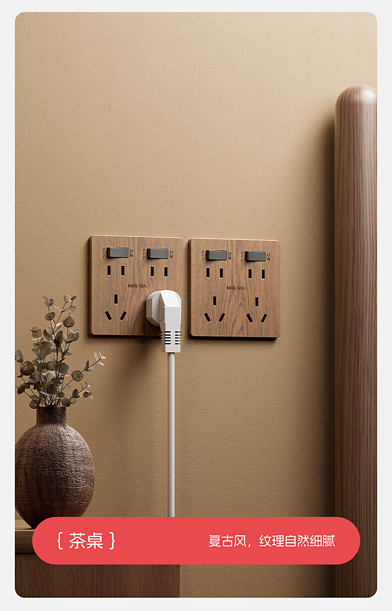 国际电工复古新中式木纹开关面板家用墙壁暗装86型民宿仿古风插座二开十孔 中古风木纹【二开十孔】