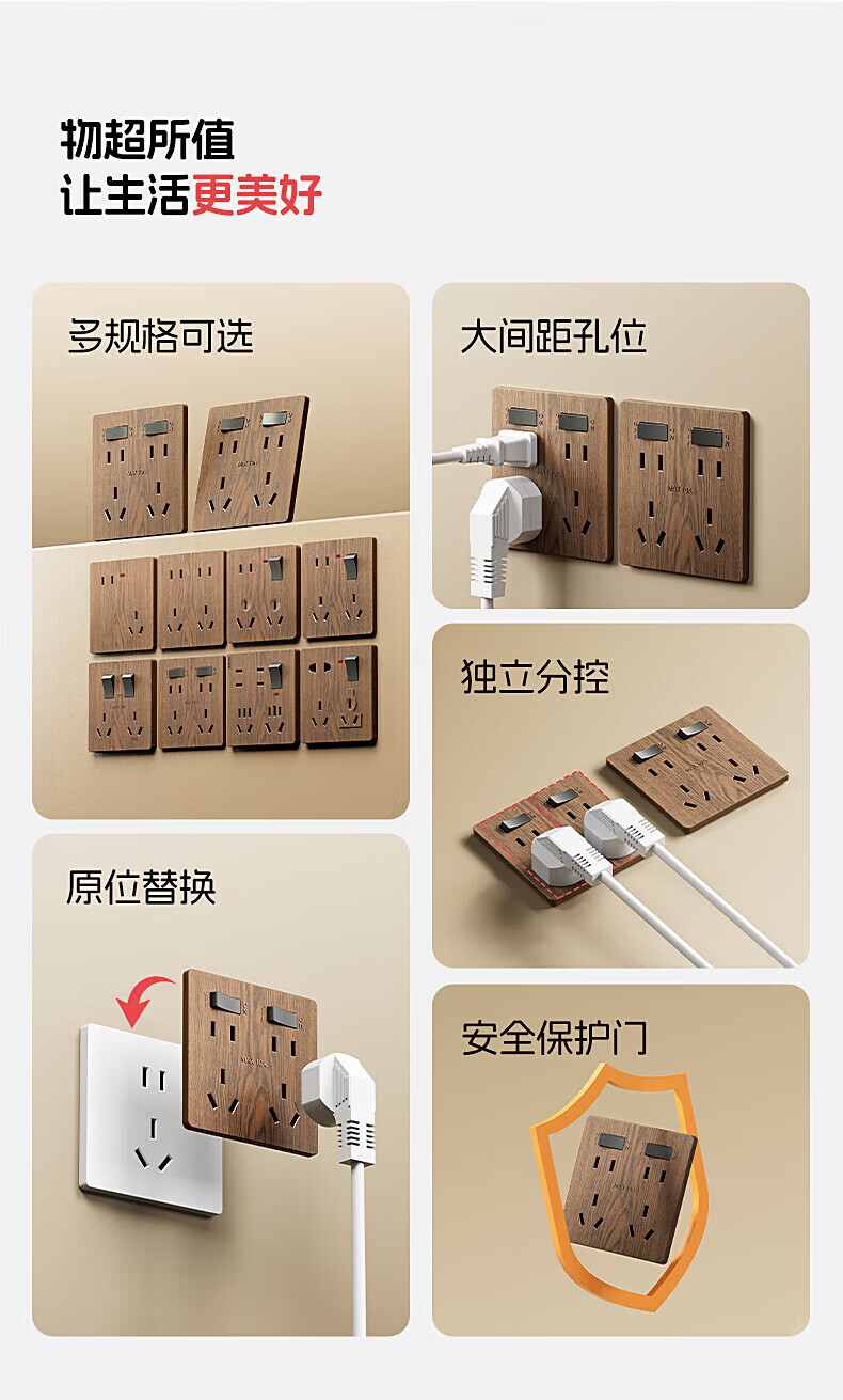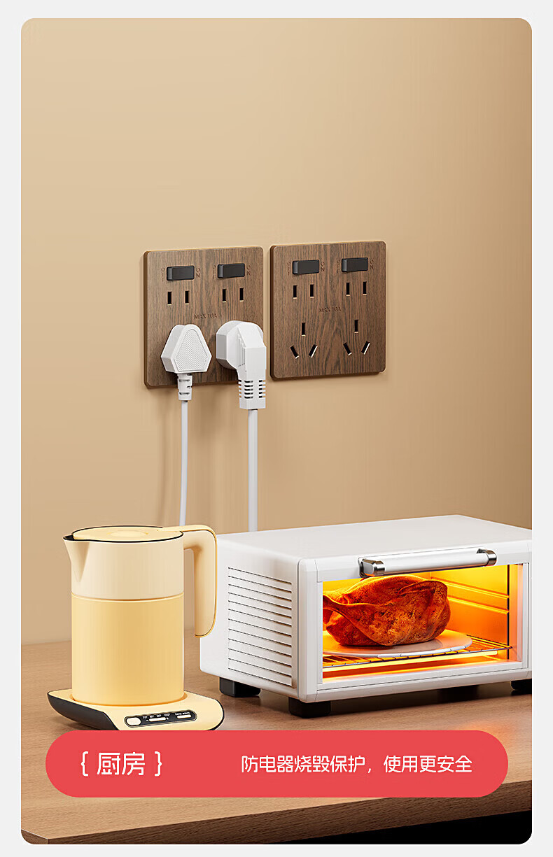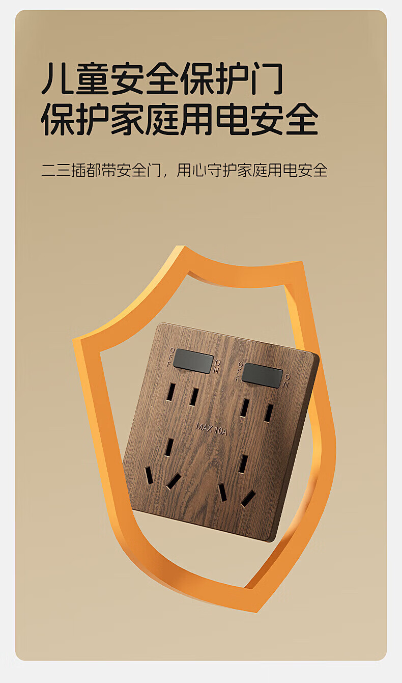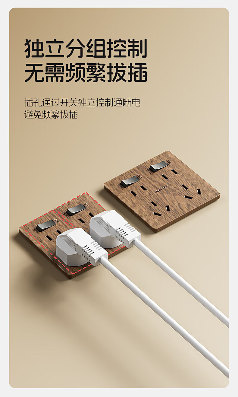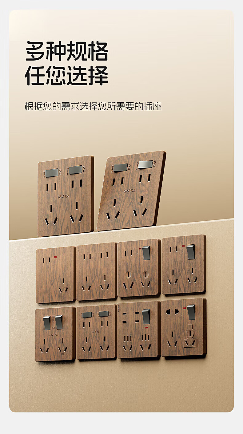 国际电工复古新中式木纹开关面板家用墙壁暗装86型民宿仿古风插座二开十孔 中古风木纹【二开十孔】