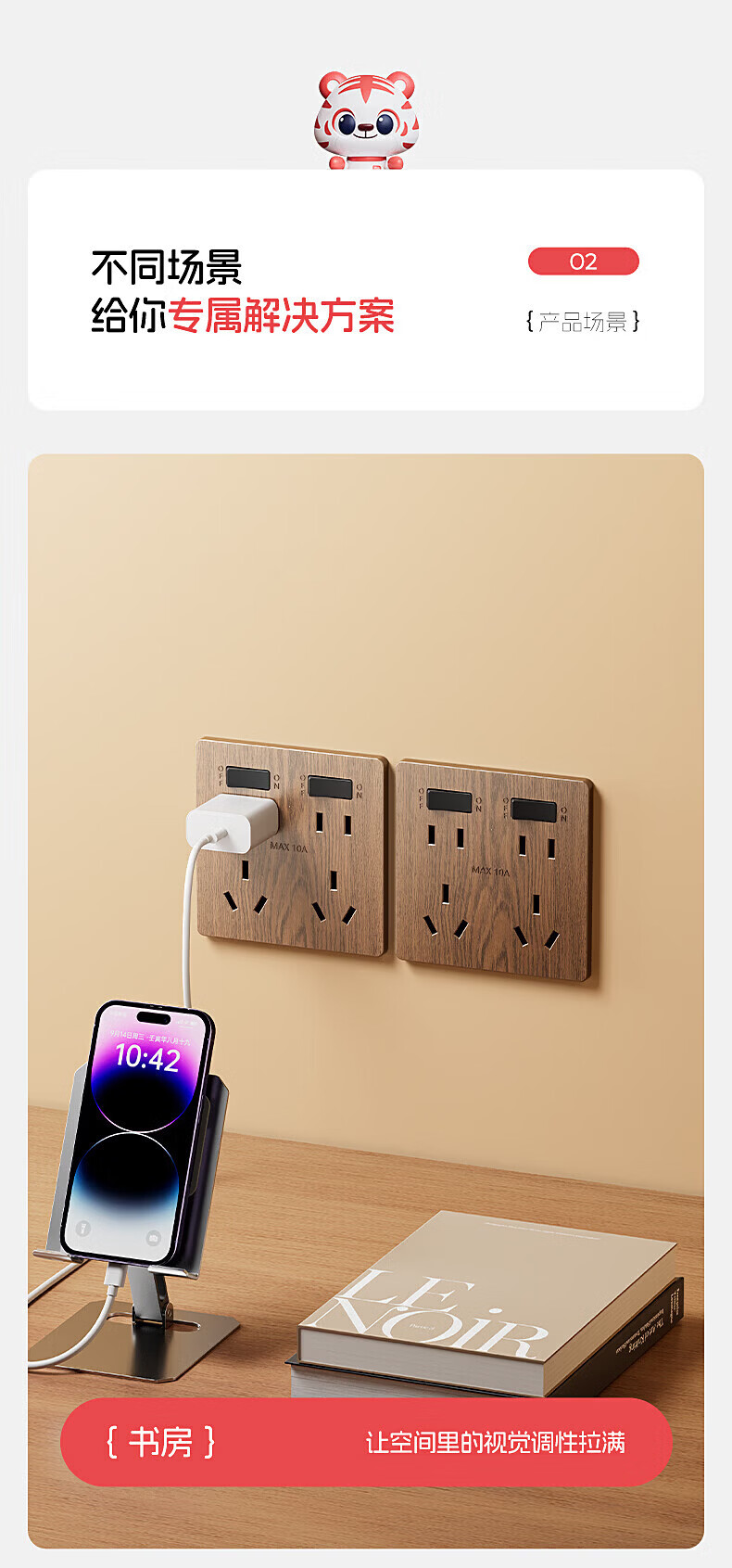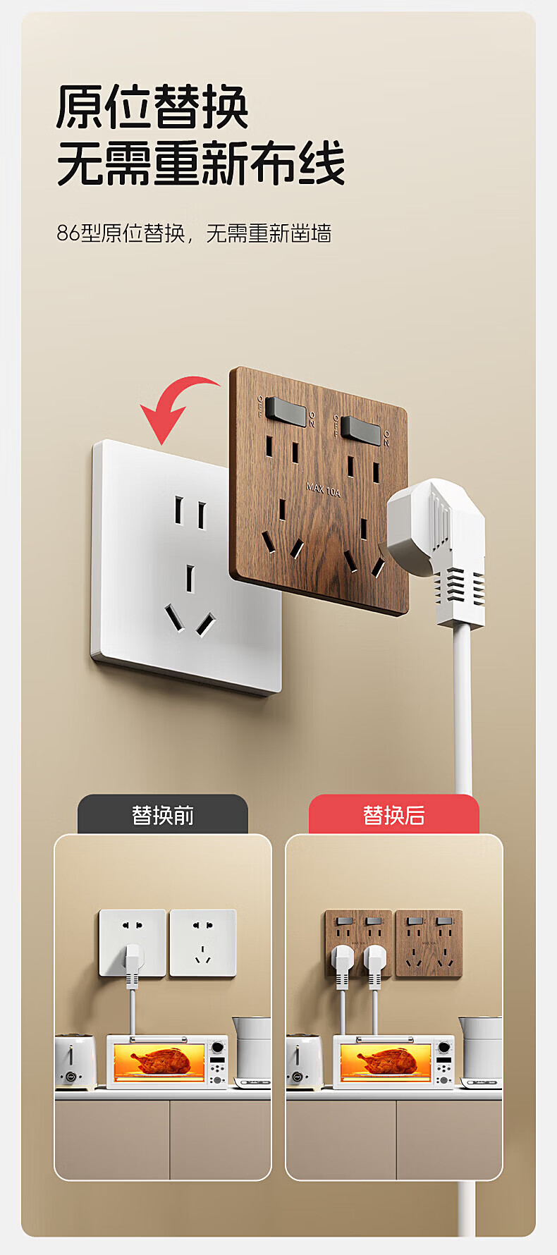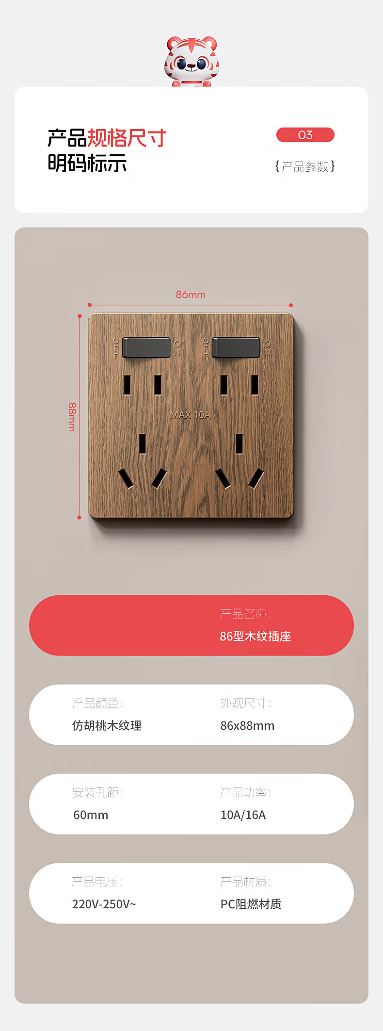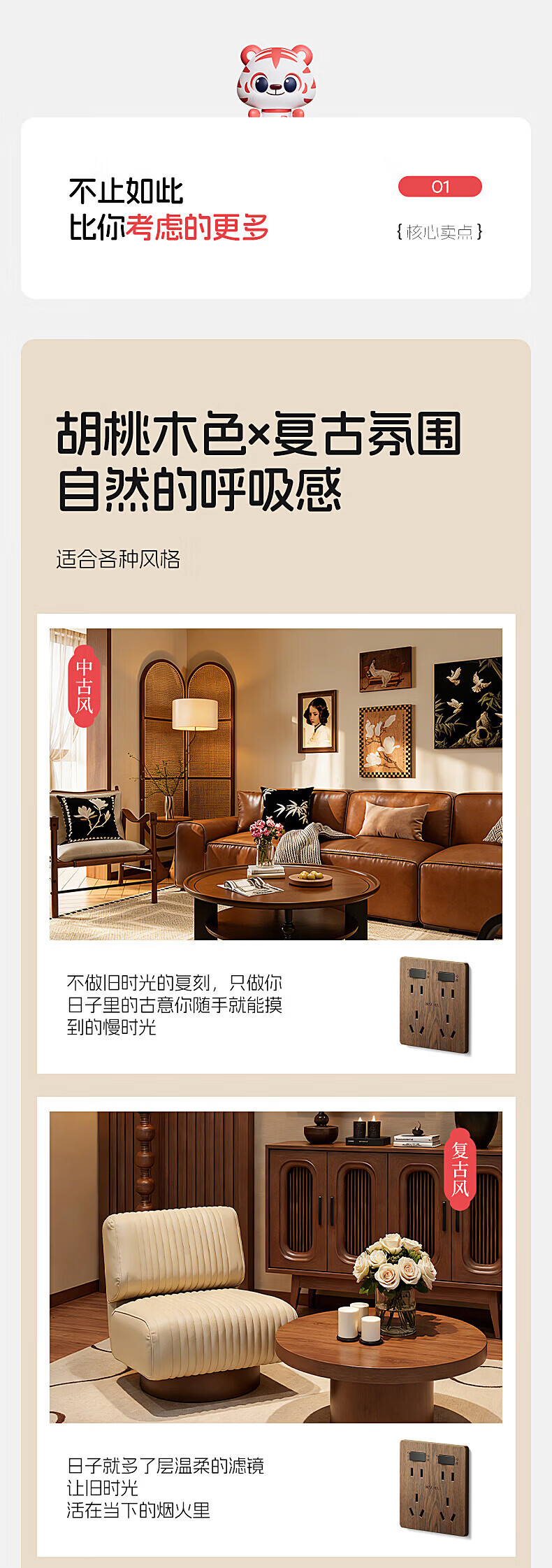 国际电工复古新中式木纹开关面板家用墙壁暗装86型民宿仿古风插座二开十孔 中古风木纹【二开十孔】