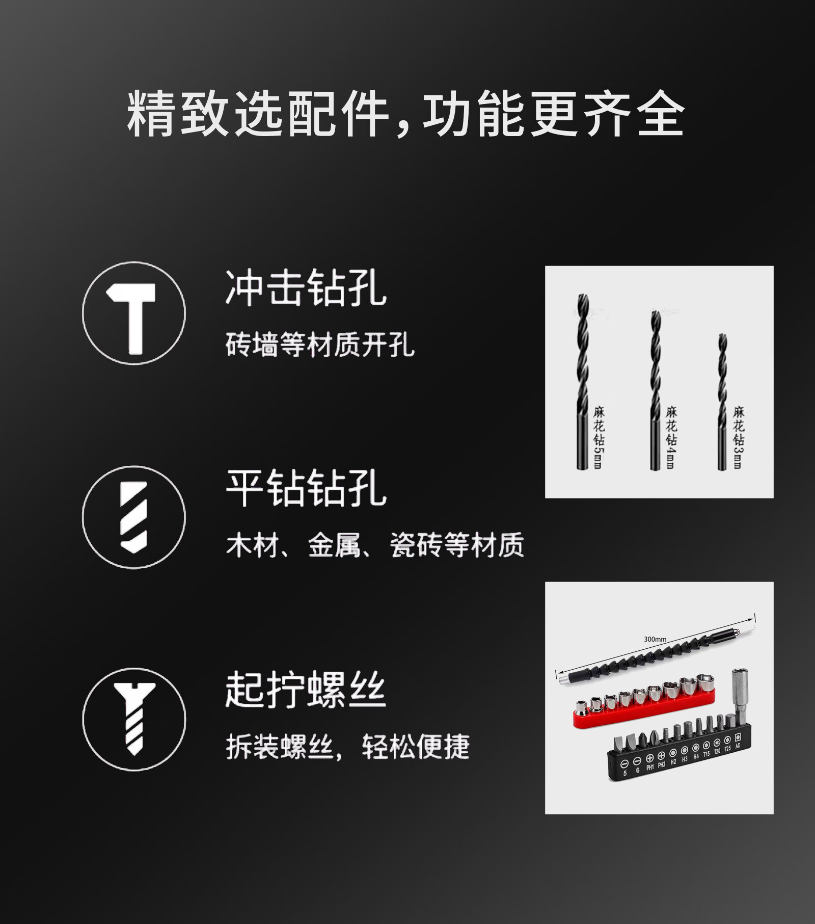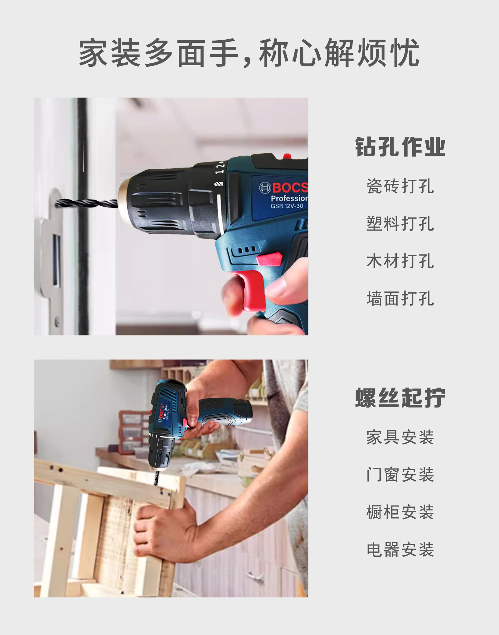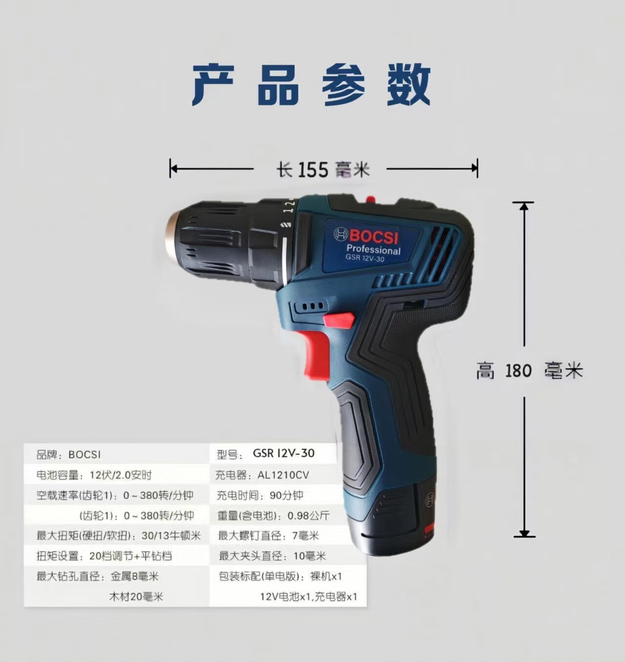 BOCSI原装GSR12V-30无刷锂电钻三用家用充电钻电动螺丝刀起子机手电钻 2.0Ah两电一充【配件组合】