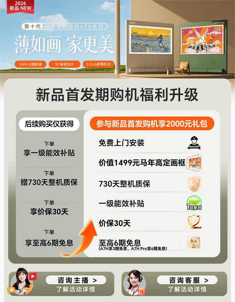 创维电视65A7H Pro 65英寸【送装一体-伸缩挂架】艺术壁纸电视Mini LED 超薄平板电视机 家电补贴