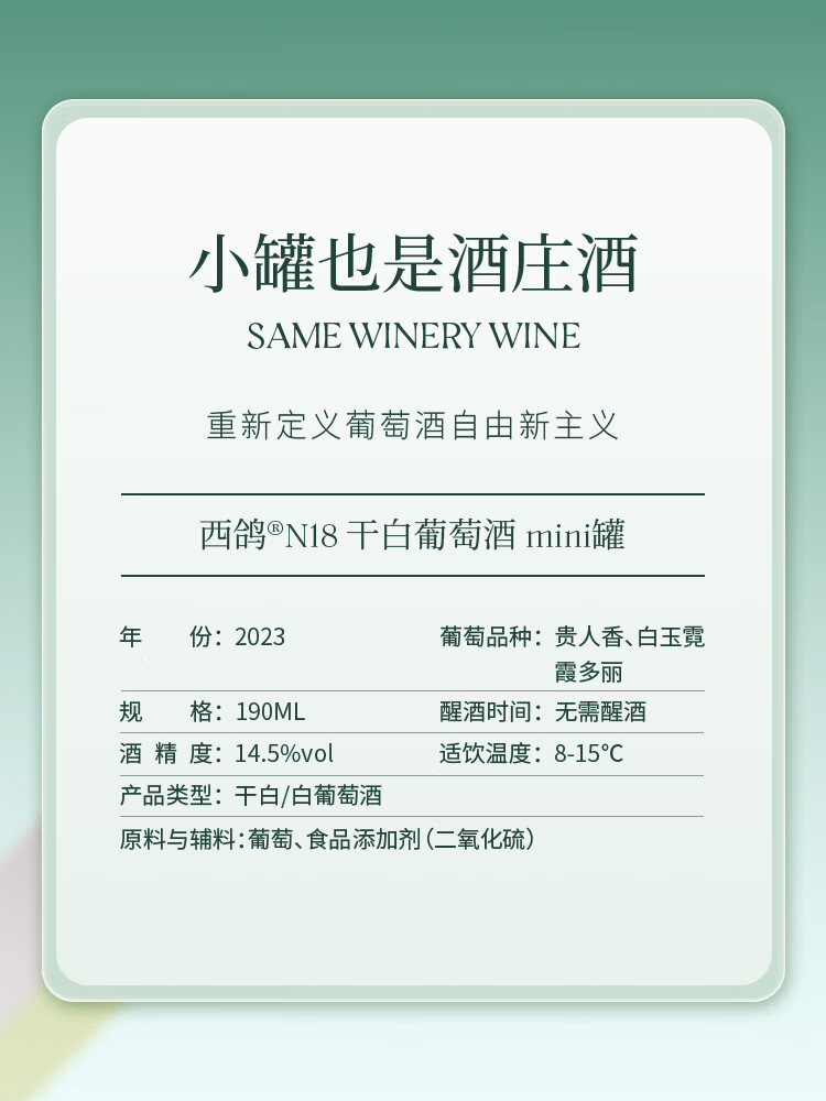 西鸽酒庄N18小罐装葡萄酒宁夏红酒贺兰山东麗国产干红干白葡萄酒 西鸽N18干白葡萄酒190ml*4罐