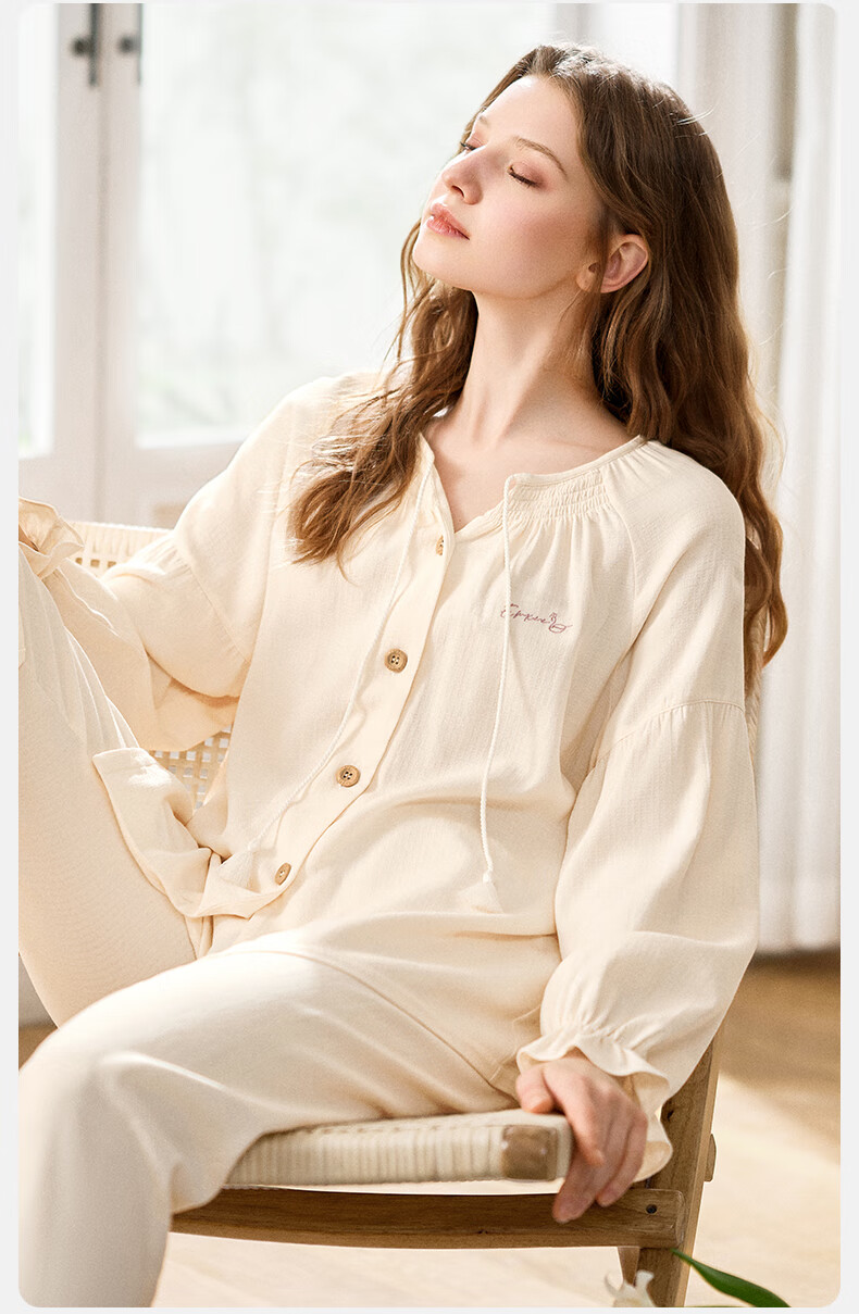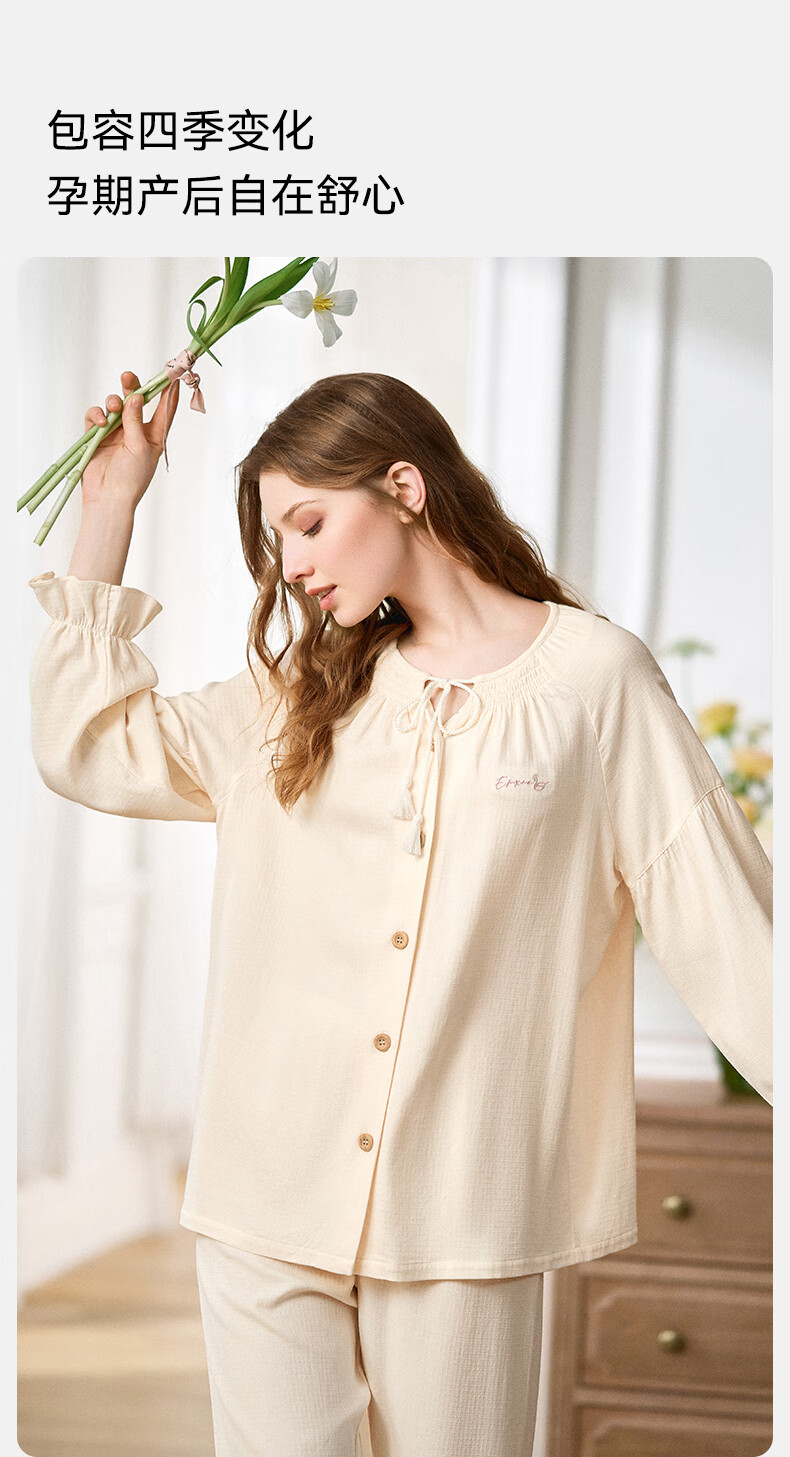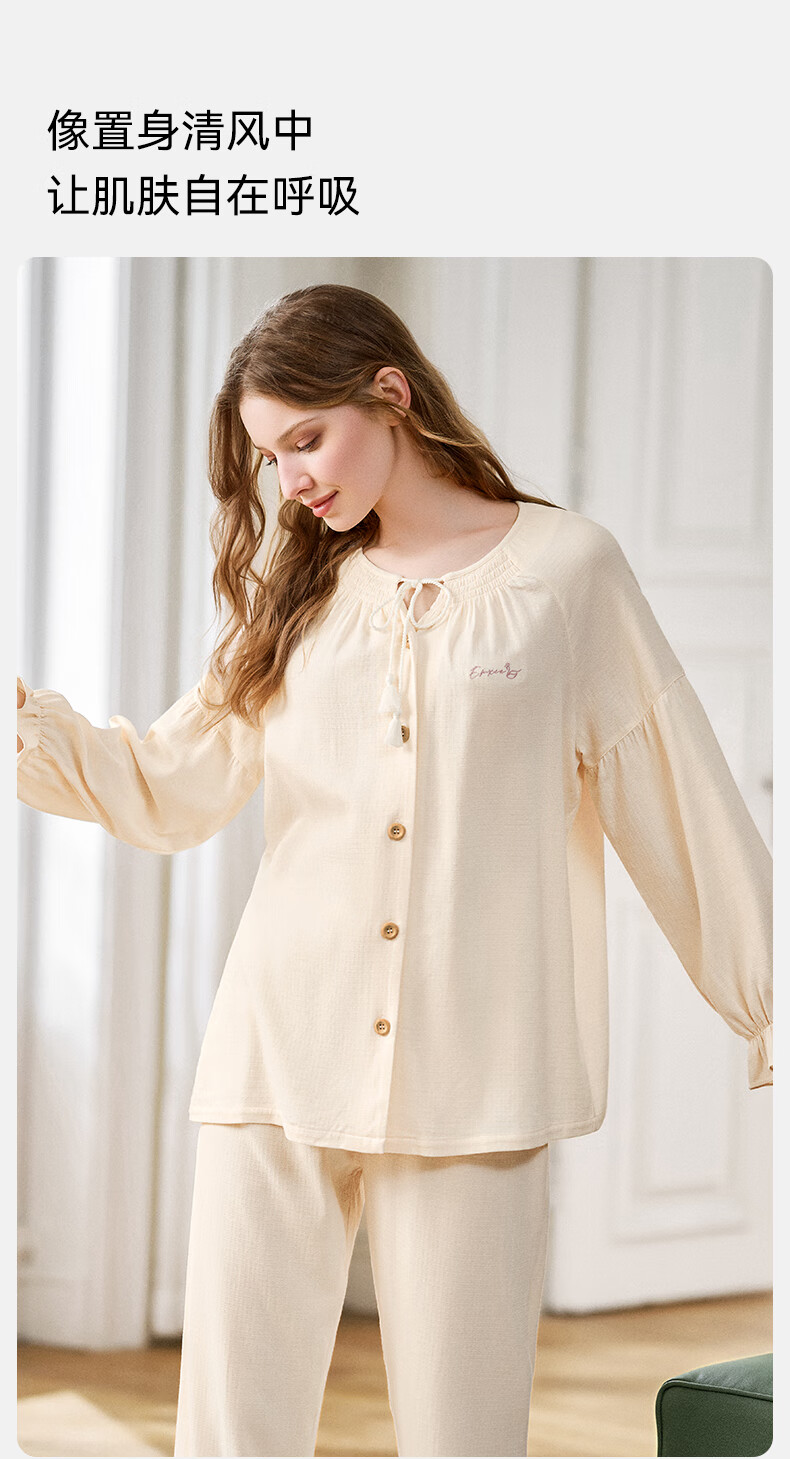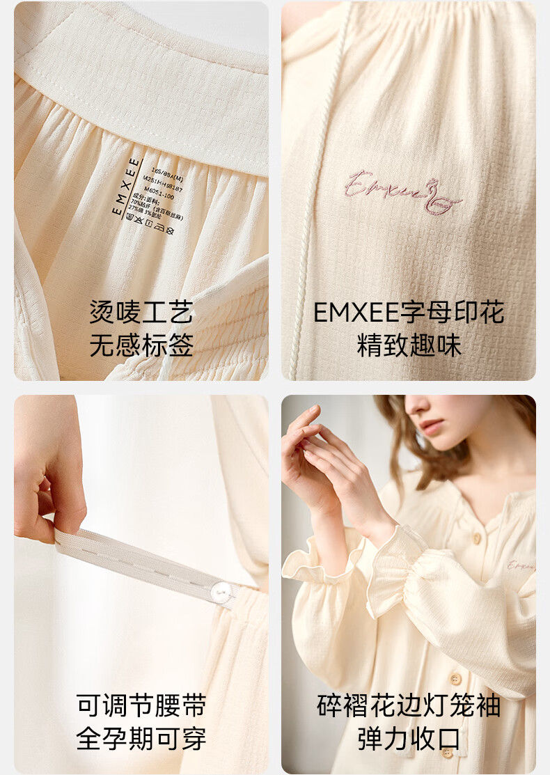 嫚熙(EMXEE)春夏季孕妇丝麻棉哺乳睡衣产妇产后月子服家居服套装 香草白 XL