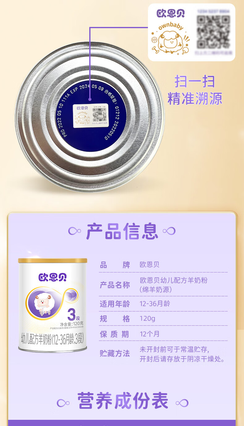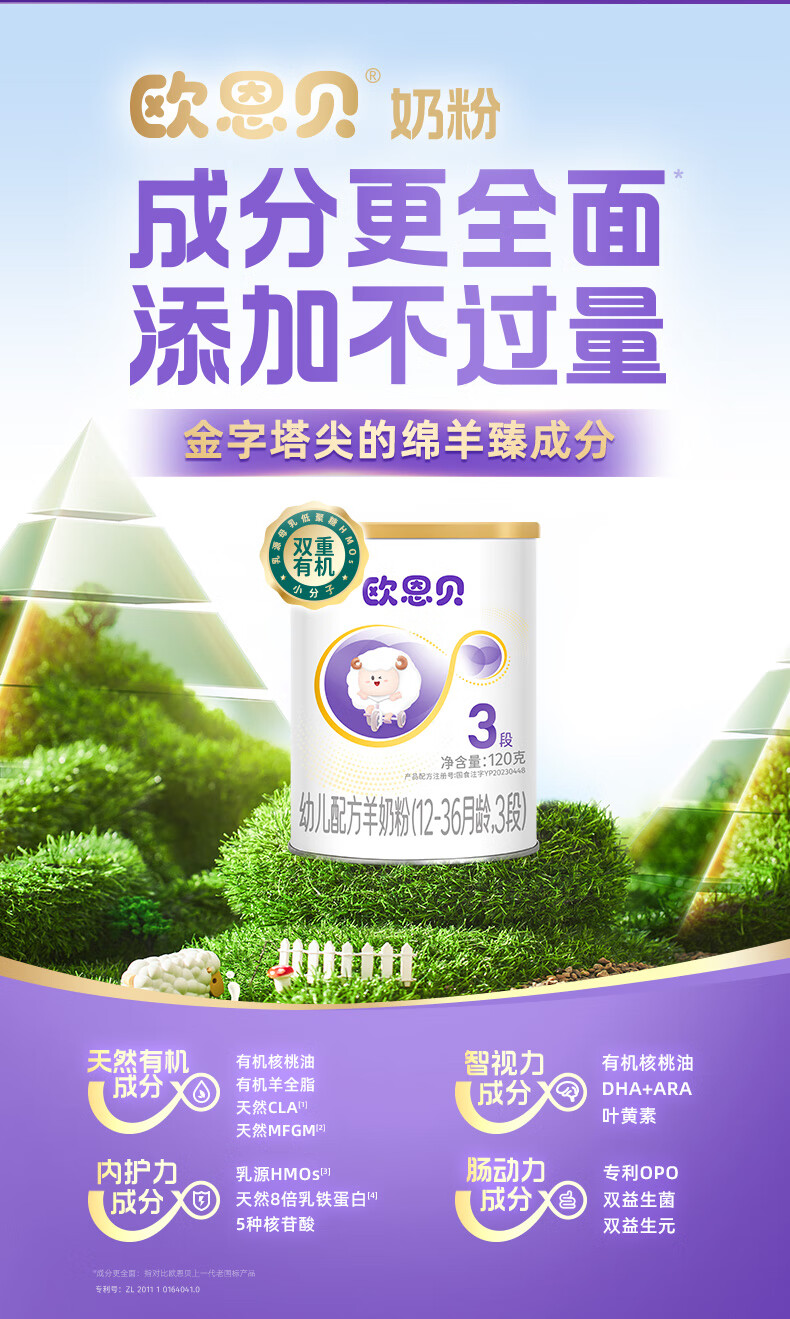 欧恩贝绵羊奶粉3段120g*2罐幼儿配方奶粉试用装小罐适用于12-36个月 2罐