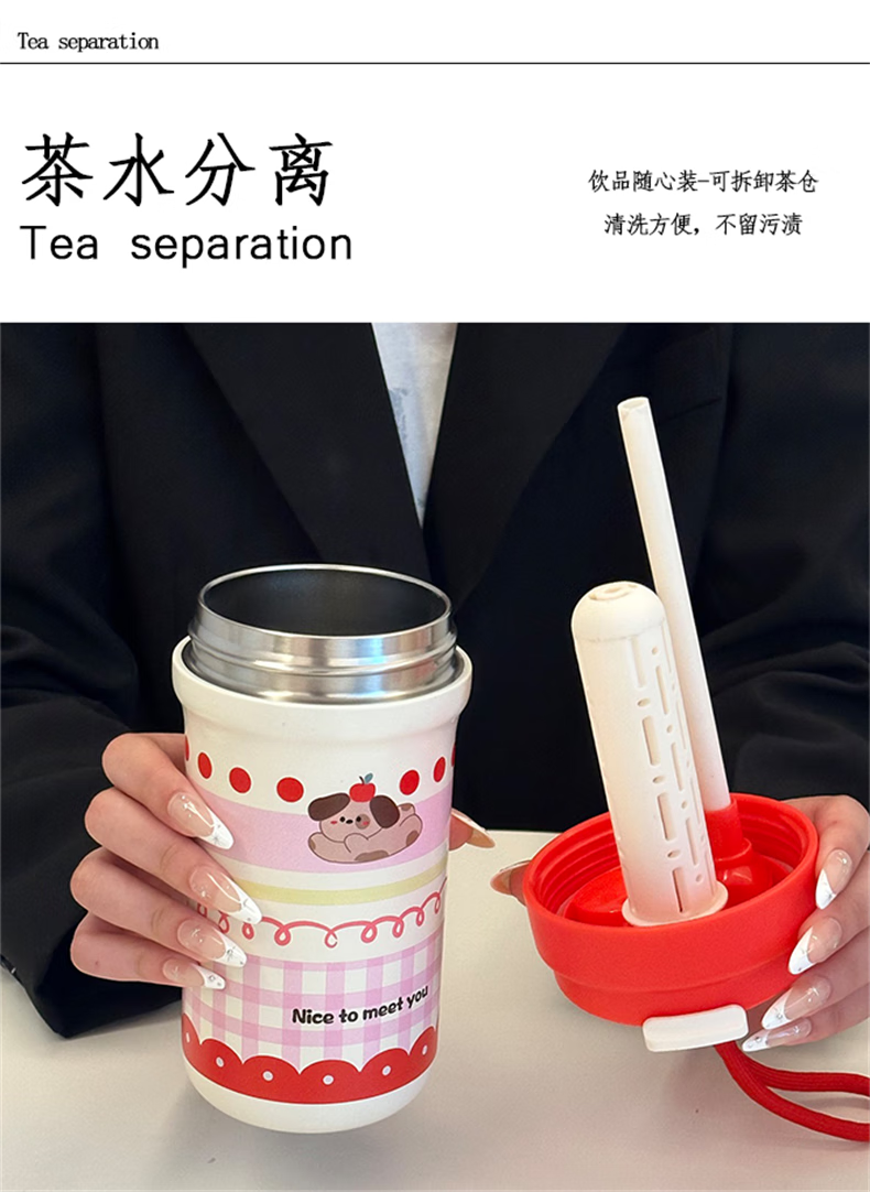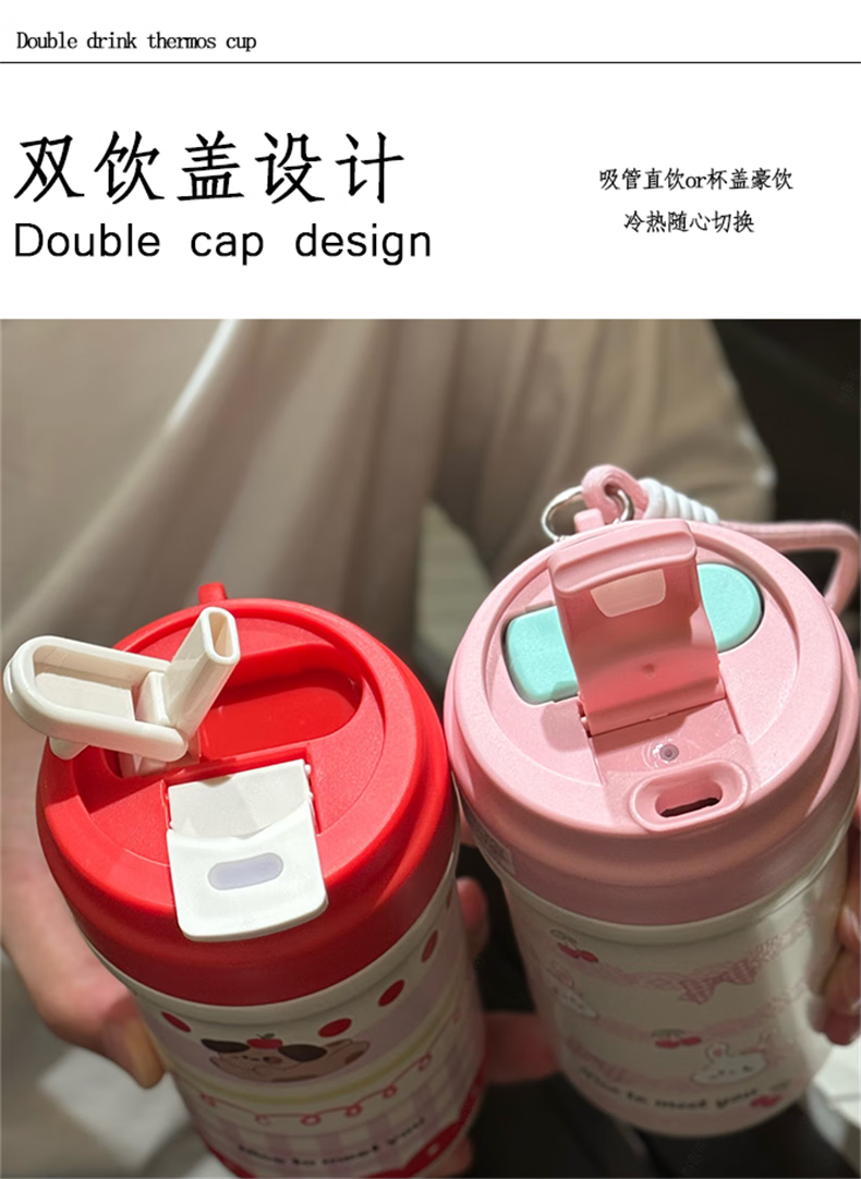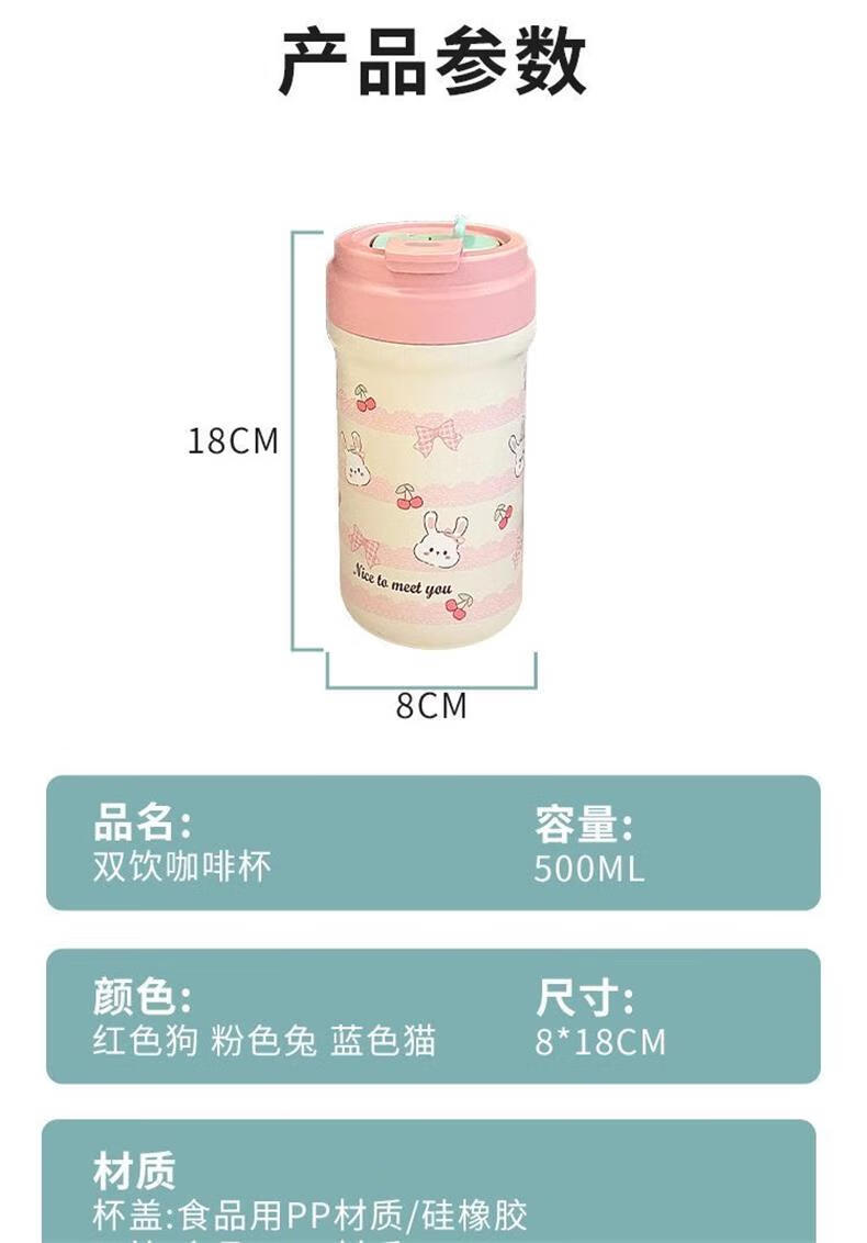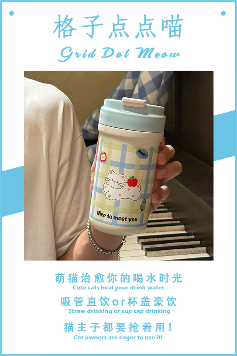 鸿迪卡通双饮保温杯女生高颜值316不锈钢便携咖啡杯吸管学生水杯子 蓝色格子喵 500ml 双饮+茶仓