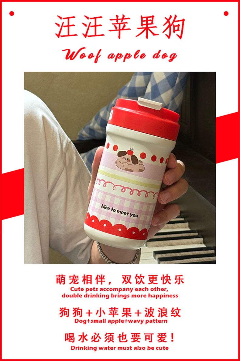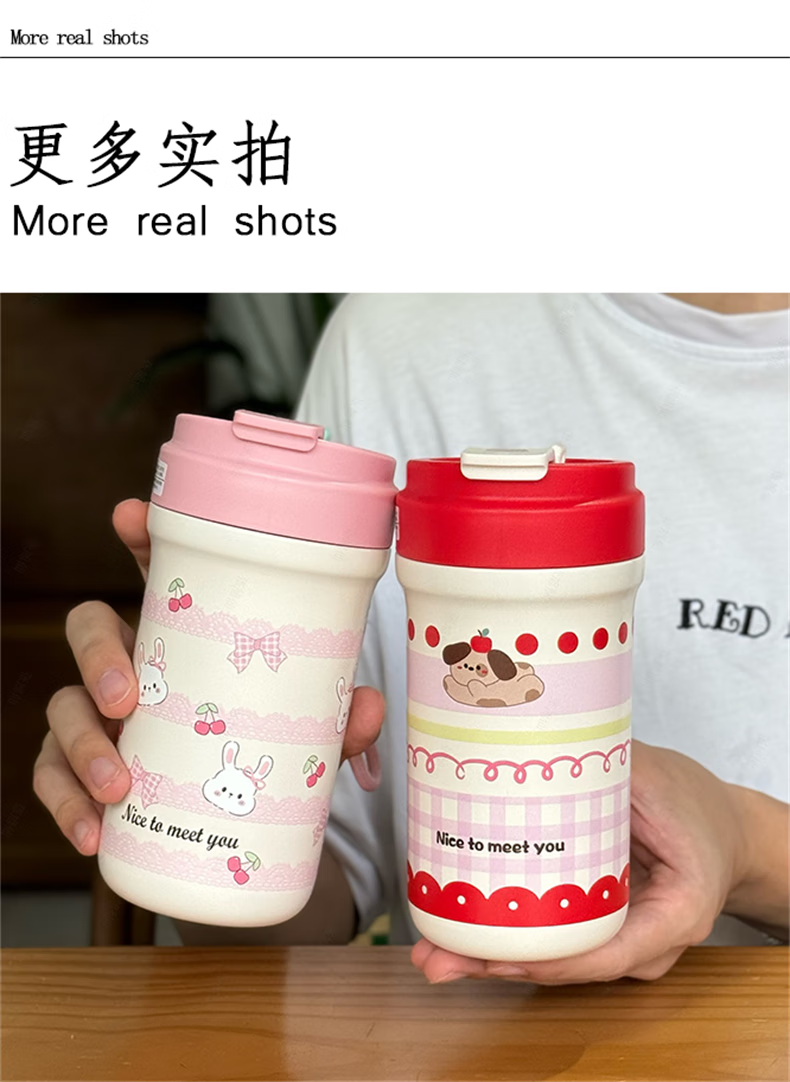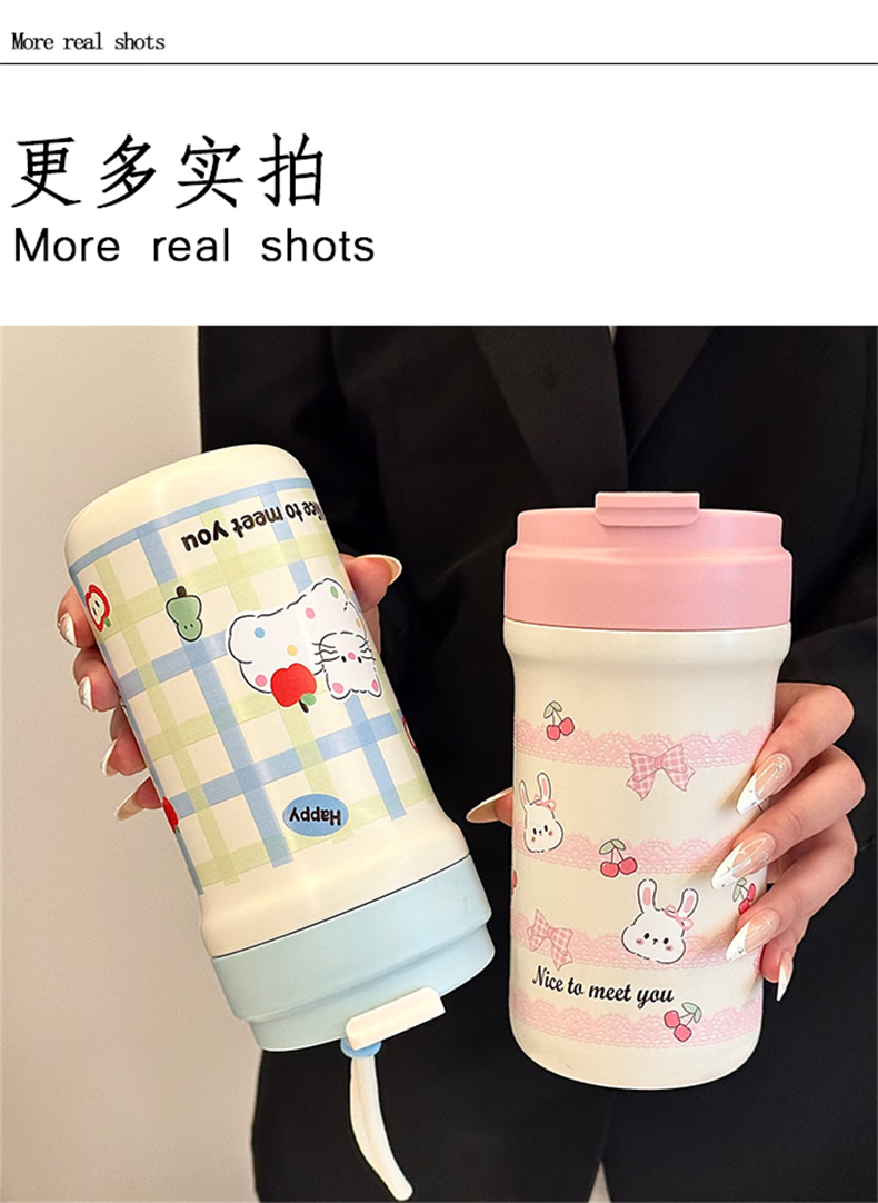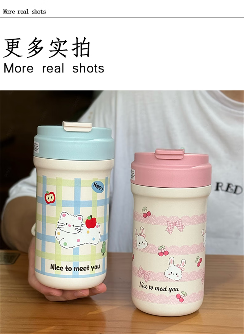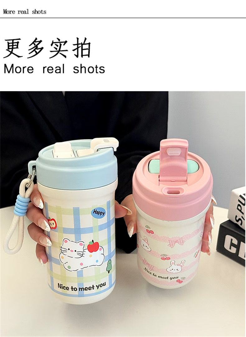 鸿迪卡通双饮保温杯女生高颜值316不锈钢便携咖啡杯吸管学生水杯子 蓝色格子喵 500ml 双饮+茶仓
