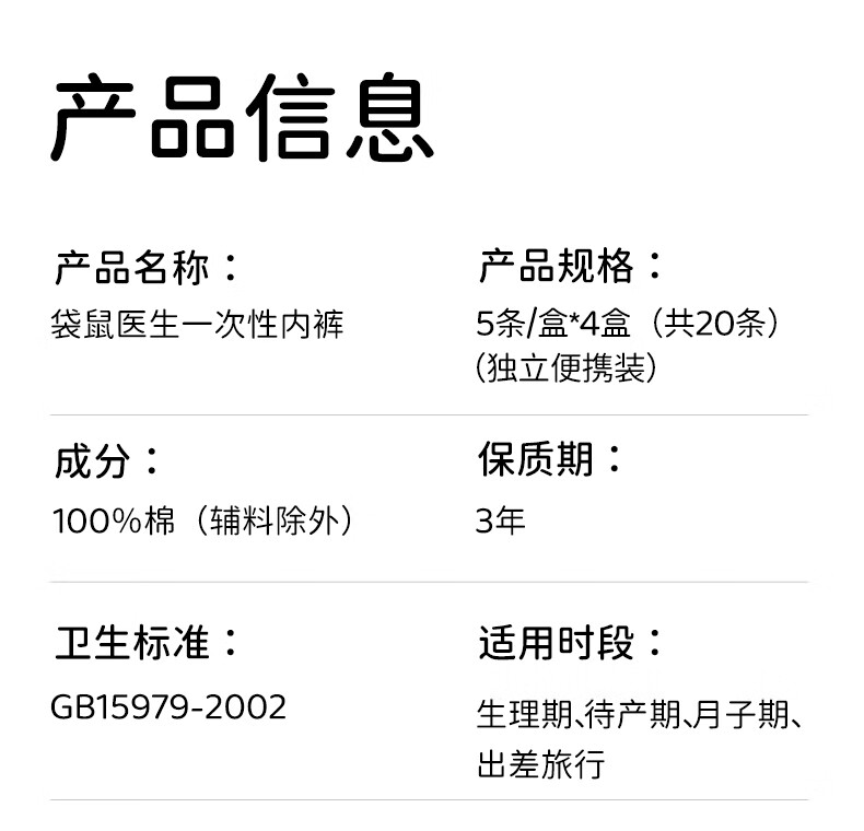 袋鼠医生一次性内裤女纯棉孕产妇坐月子旅行便携内裤20条装L码【110斤内】