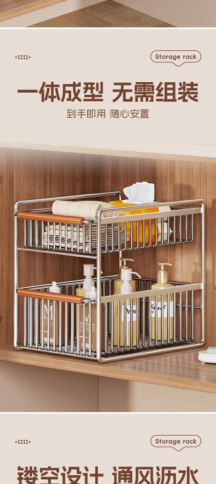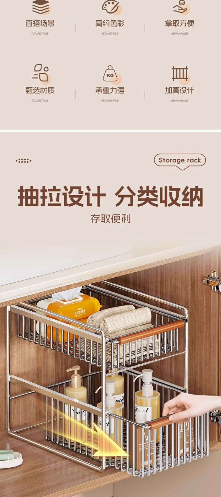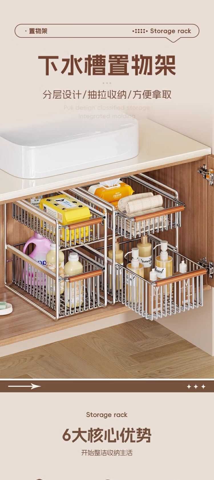 尔思家下水槽置物架浴室柜下收纳柜抽拉式柜内分层架卫生间洗手台下拉篮 小号