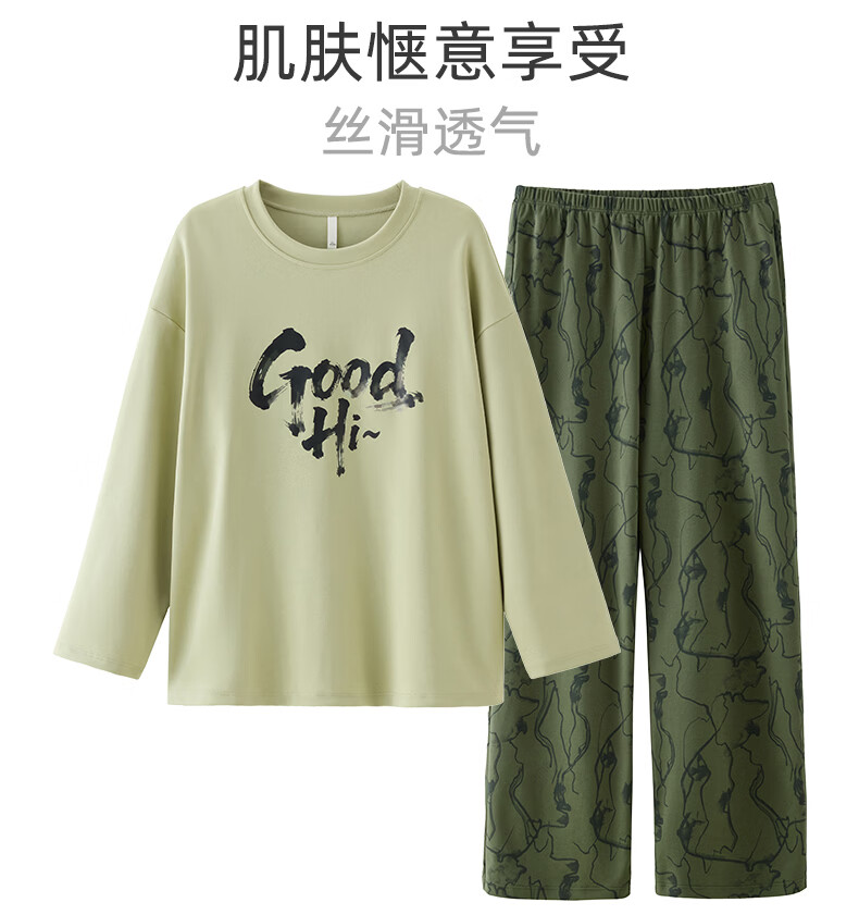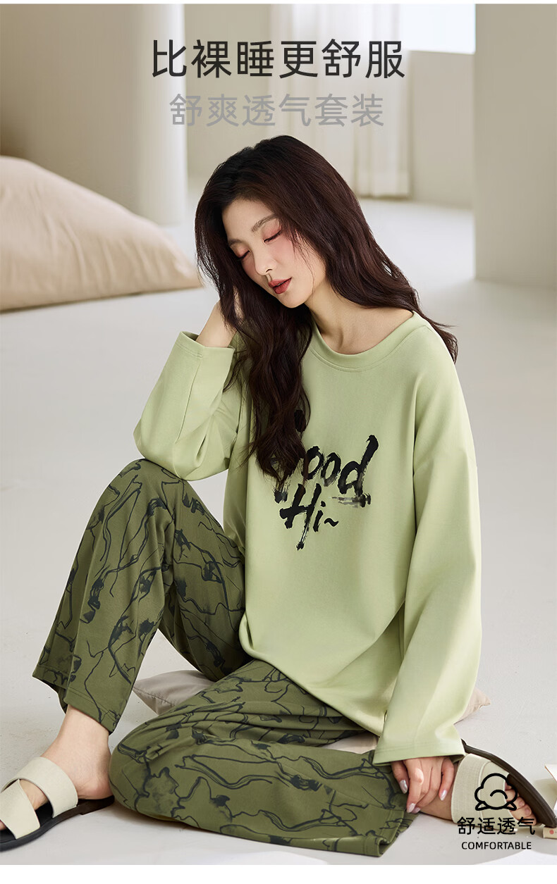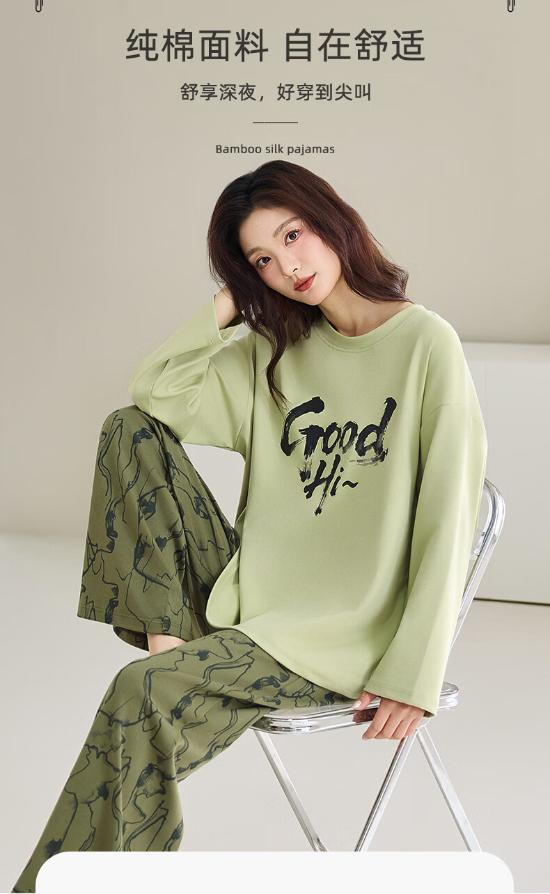 都市丽人纯棉女士睡衣女2026年新款圆领长袖长裤家居服套装可外穿 100%纯棉女士家居服-抹茶绿 M (建议80-100斤)