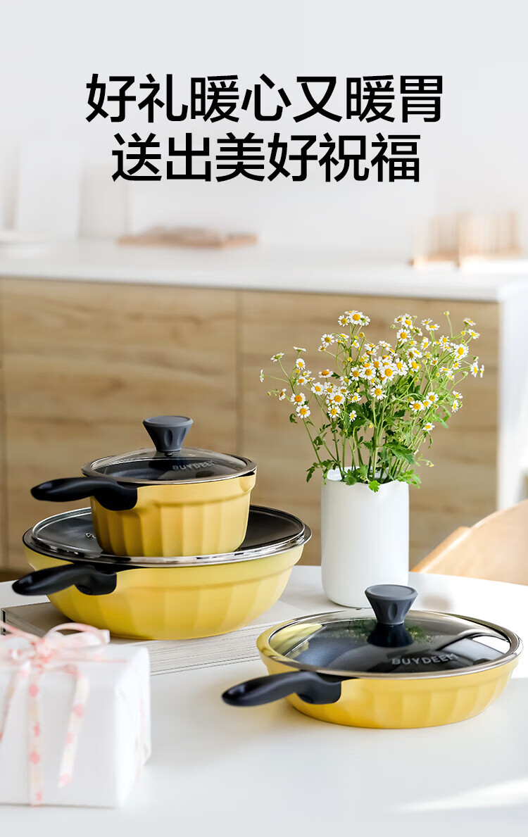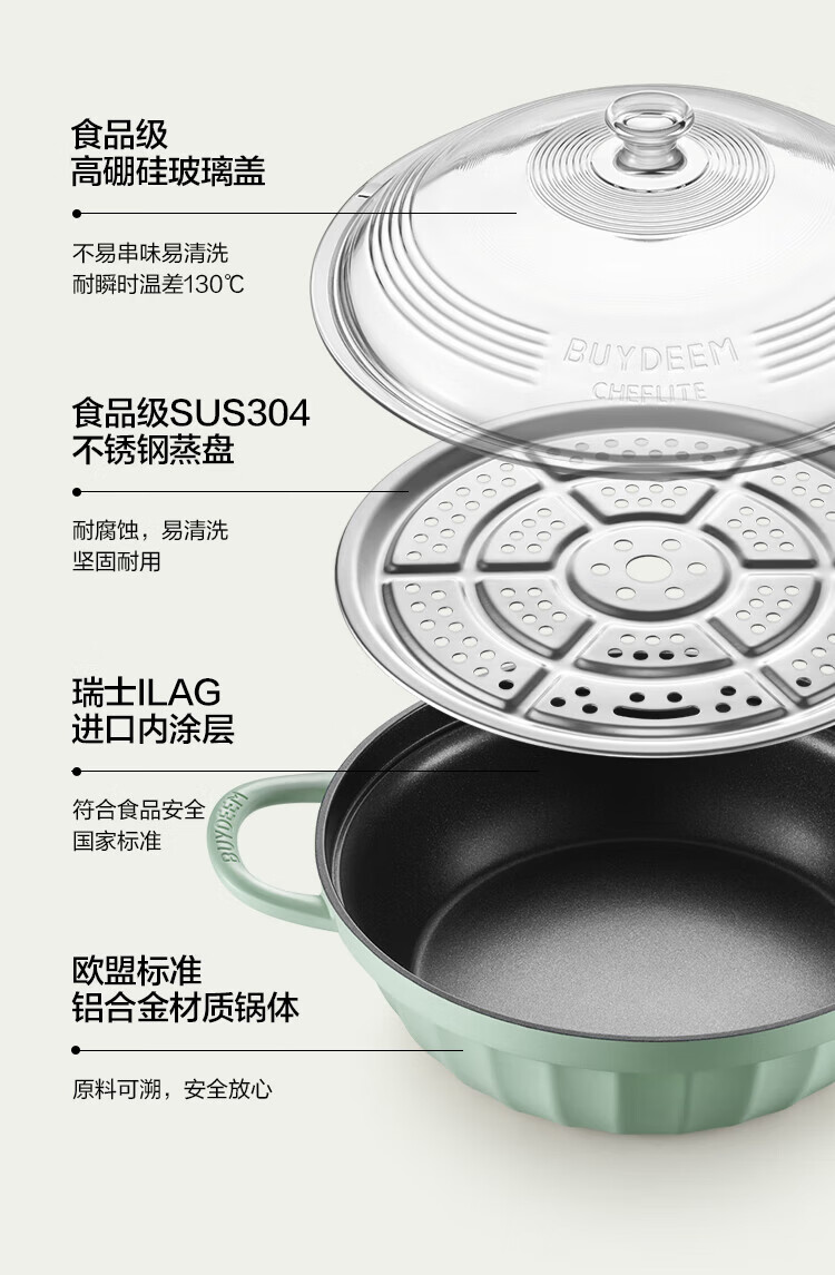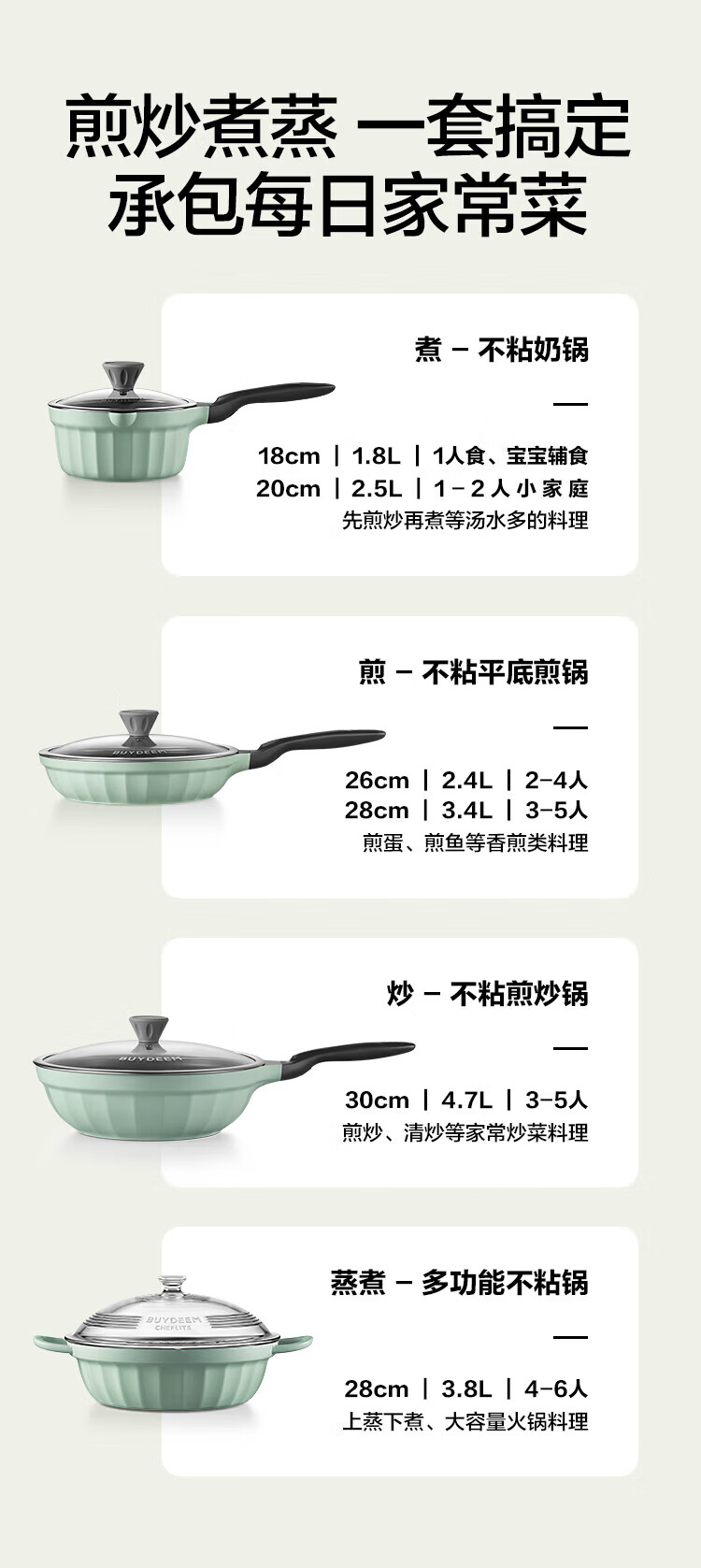 北鼎(Buydeem)烹饪锅具套装家用平底不粘锅厨具套装炒菜锅煎锅奶锅汤锅火锅套锅 【浅杉绿4件套】18cm奶锅+26cm煎锅+30cm炒锅+28cm火锅