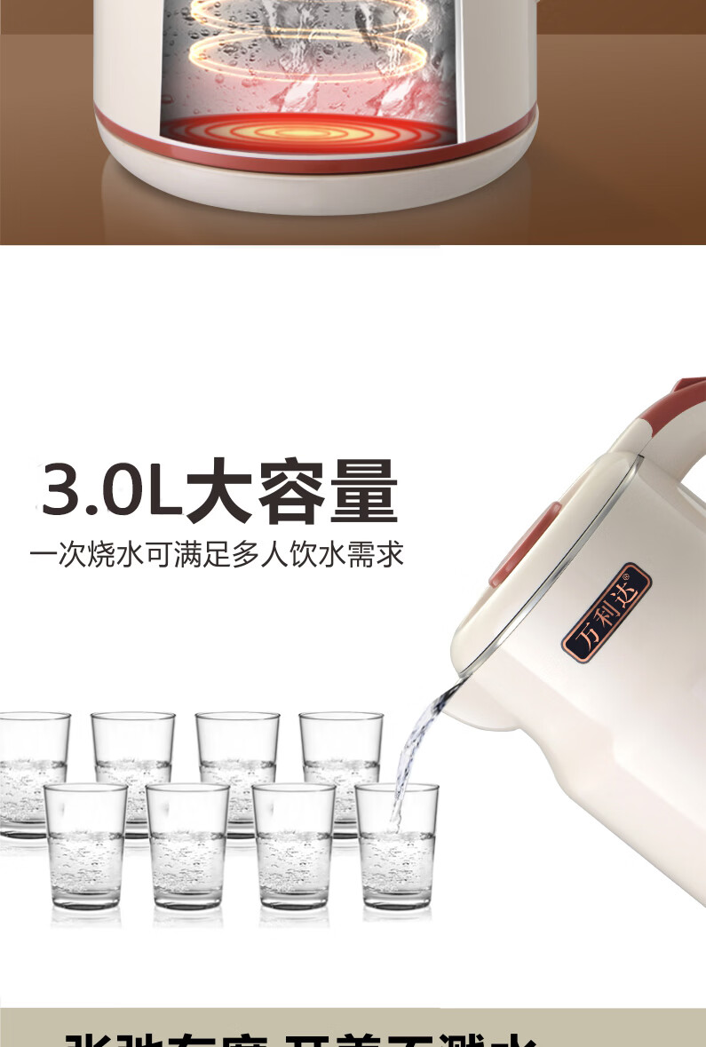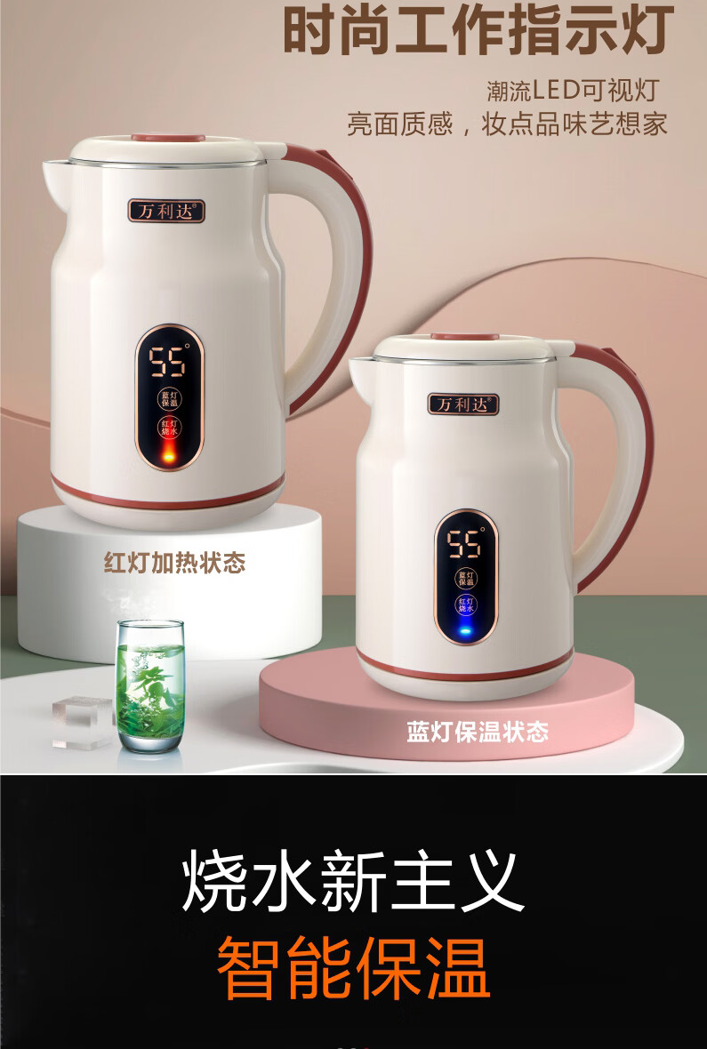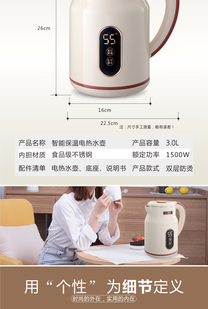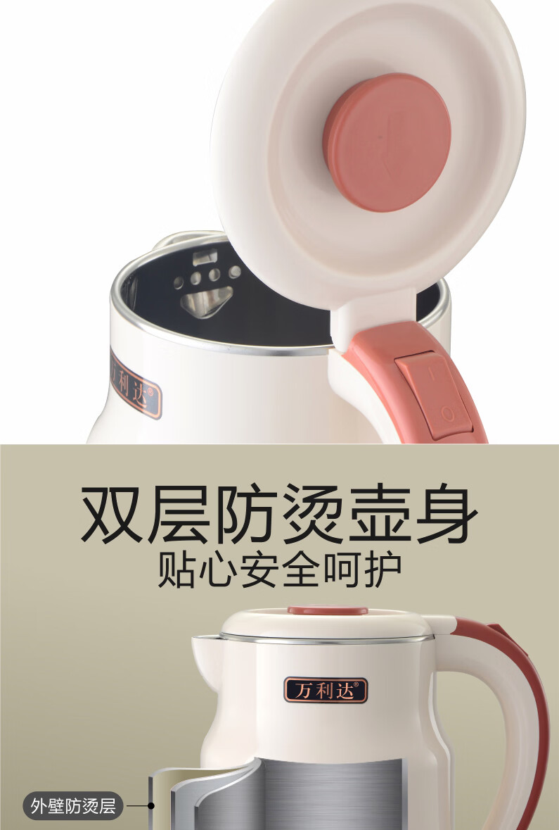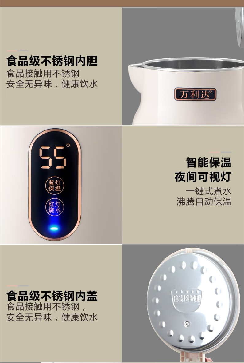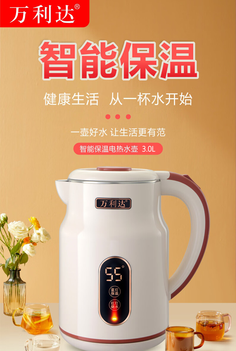 万利达(Malata)烧水壶电热水壶电水壶便携家用全自动小不锈钢大容量双层防烫自动断电 3L 米白色智能保温