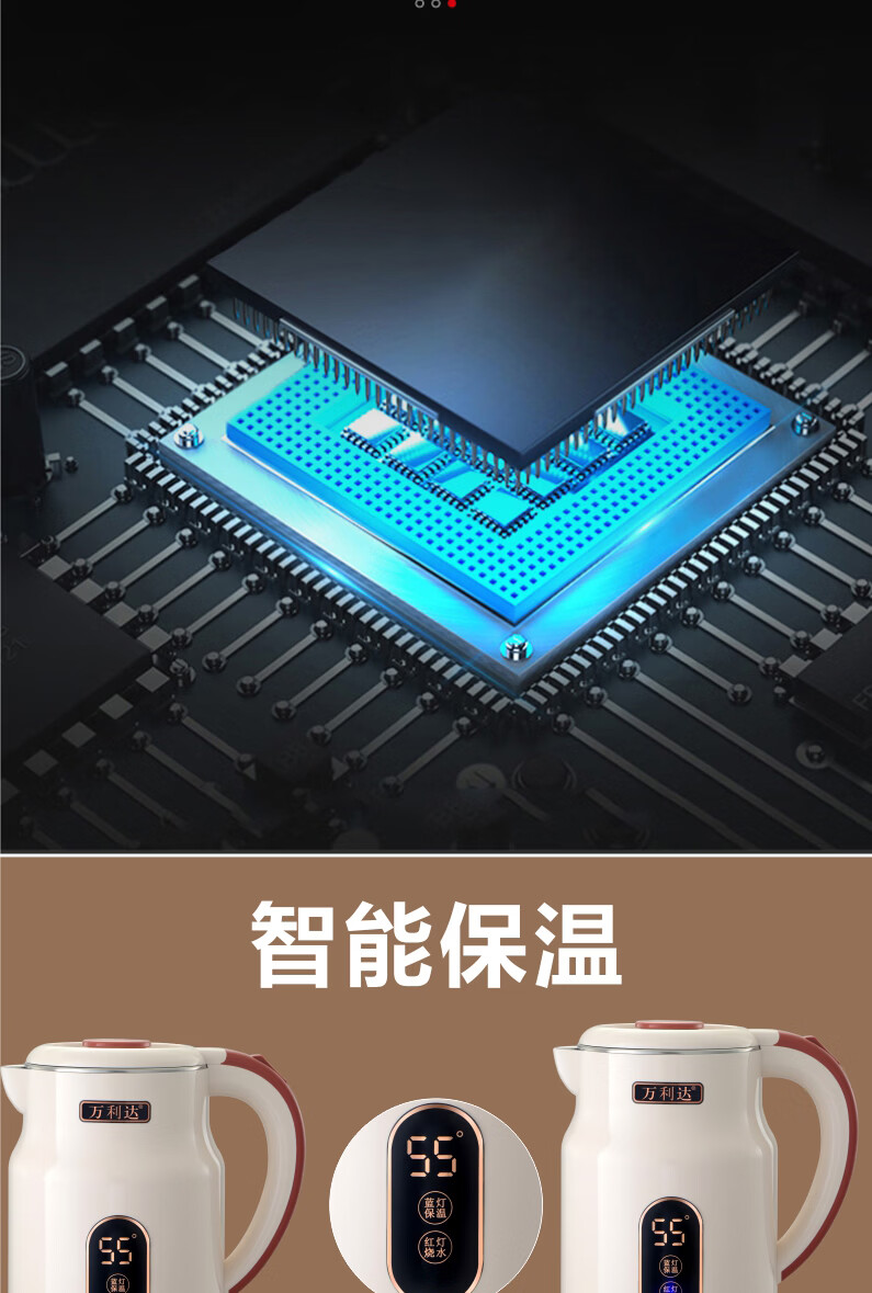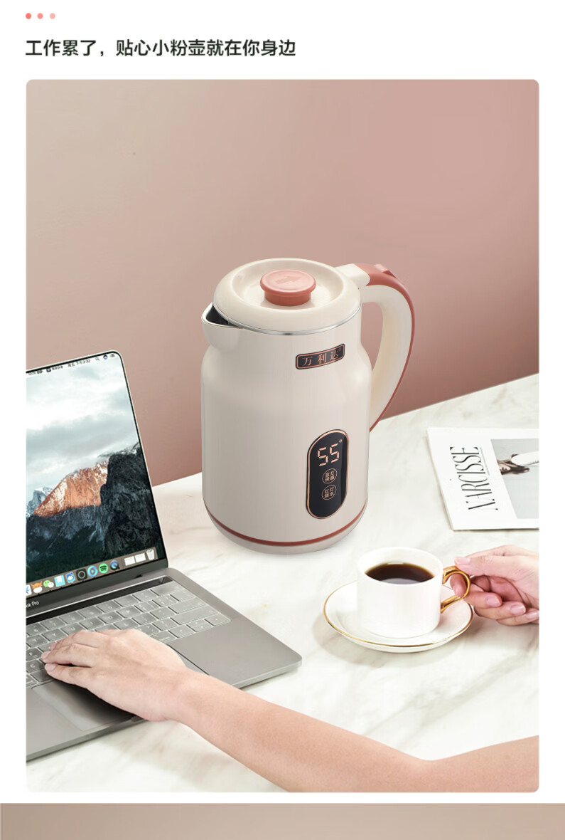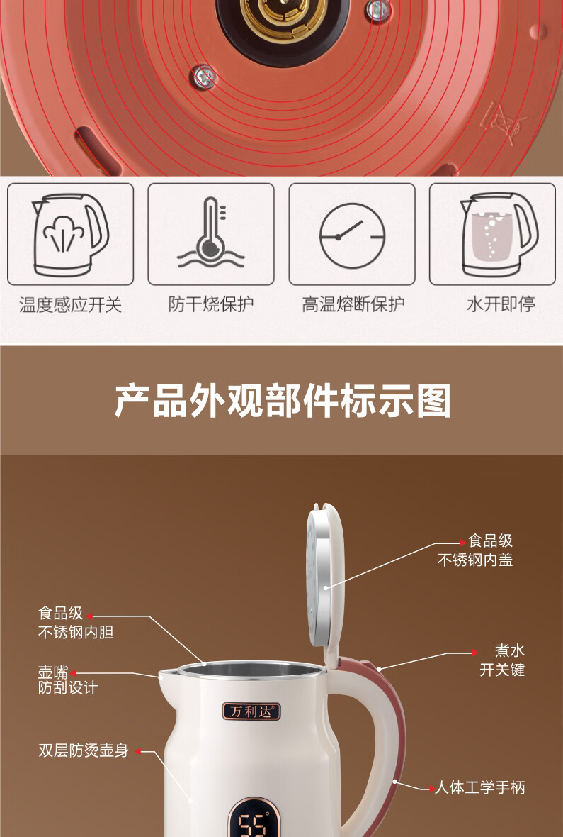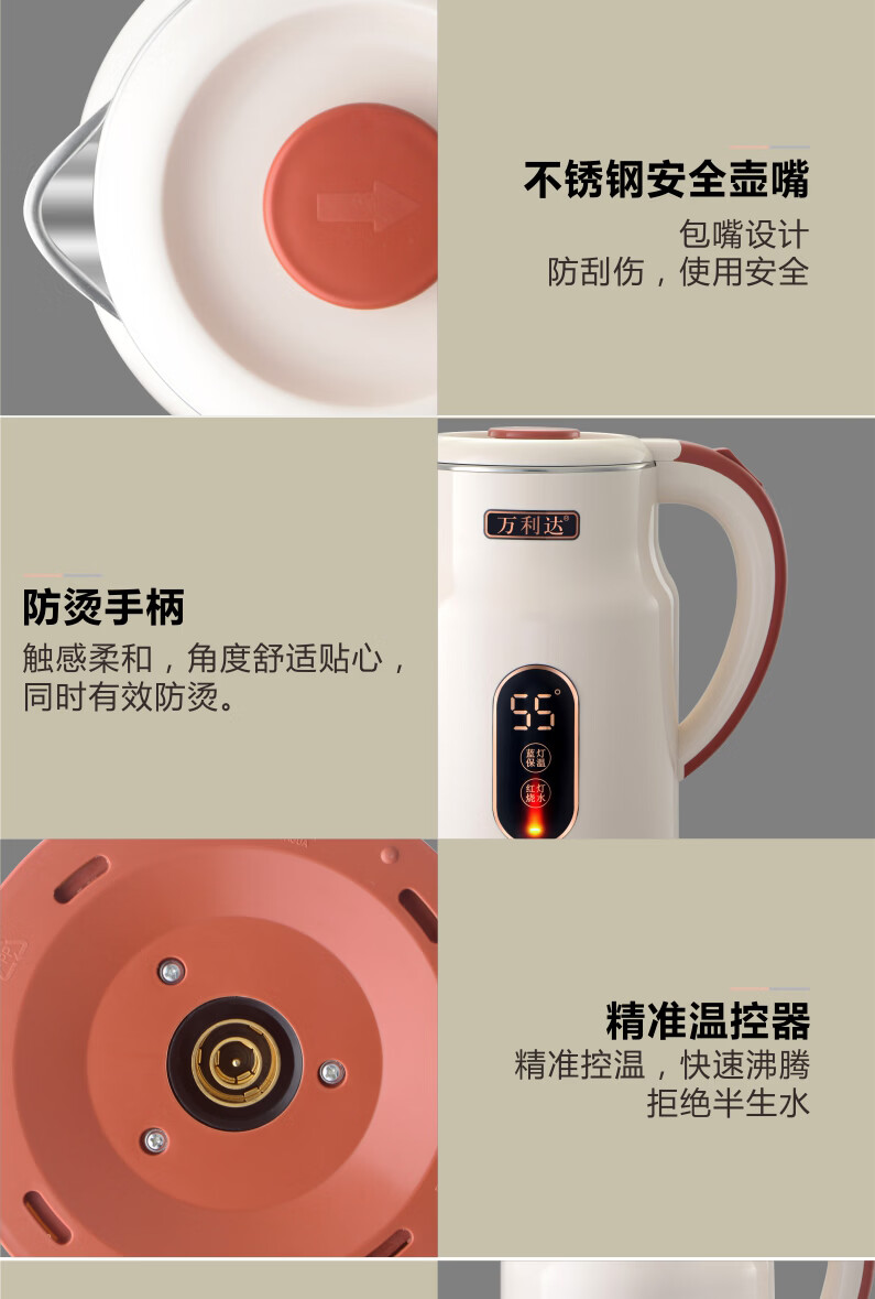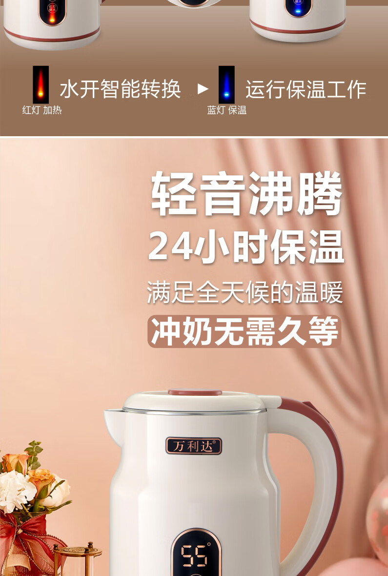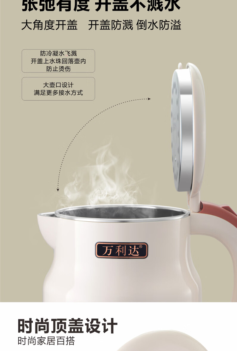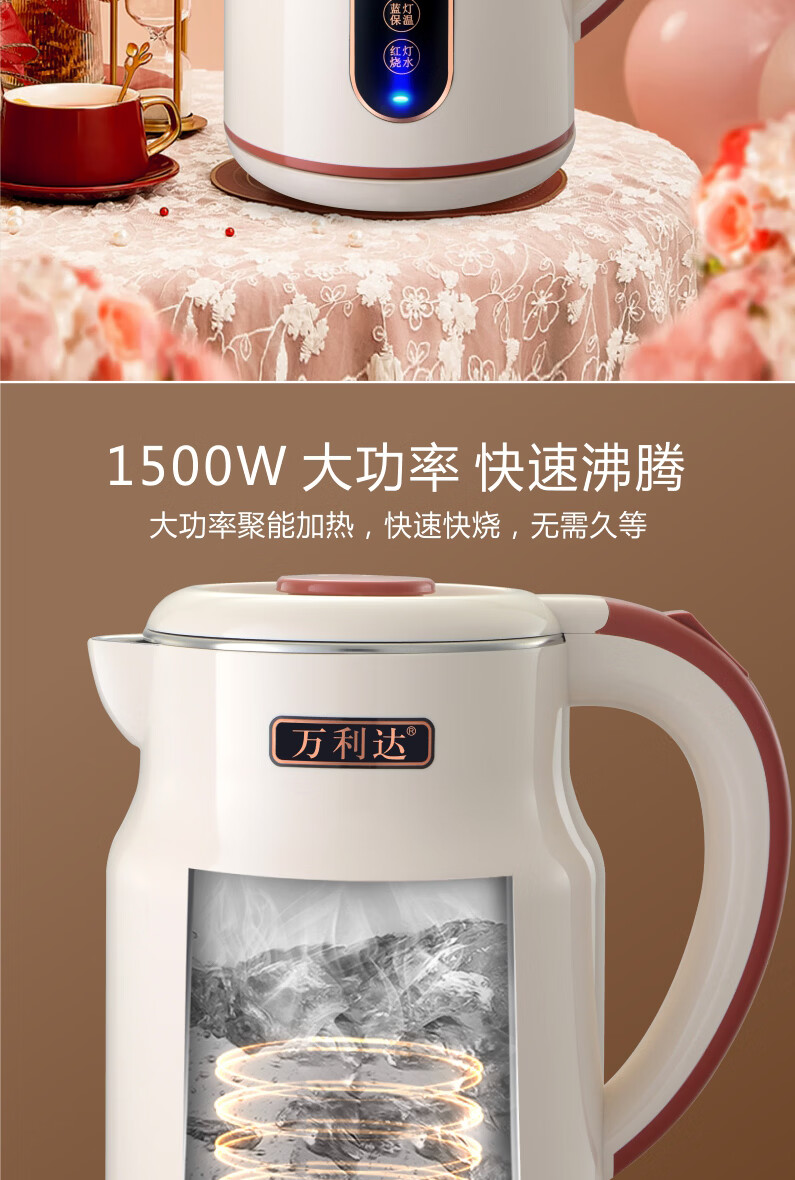 万利达(Malata)烧水壶电热水壶电水壶便携家用全自动小不锈钢大容量双层防烫自动断电 3L 米白色智能保温