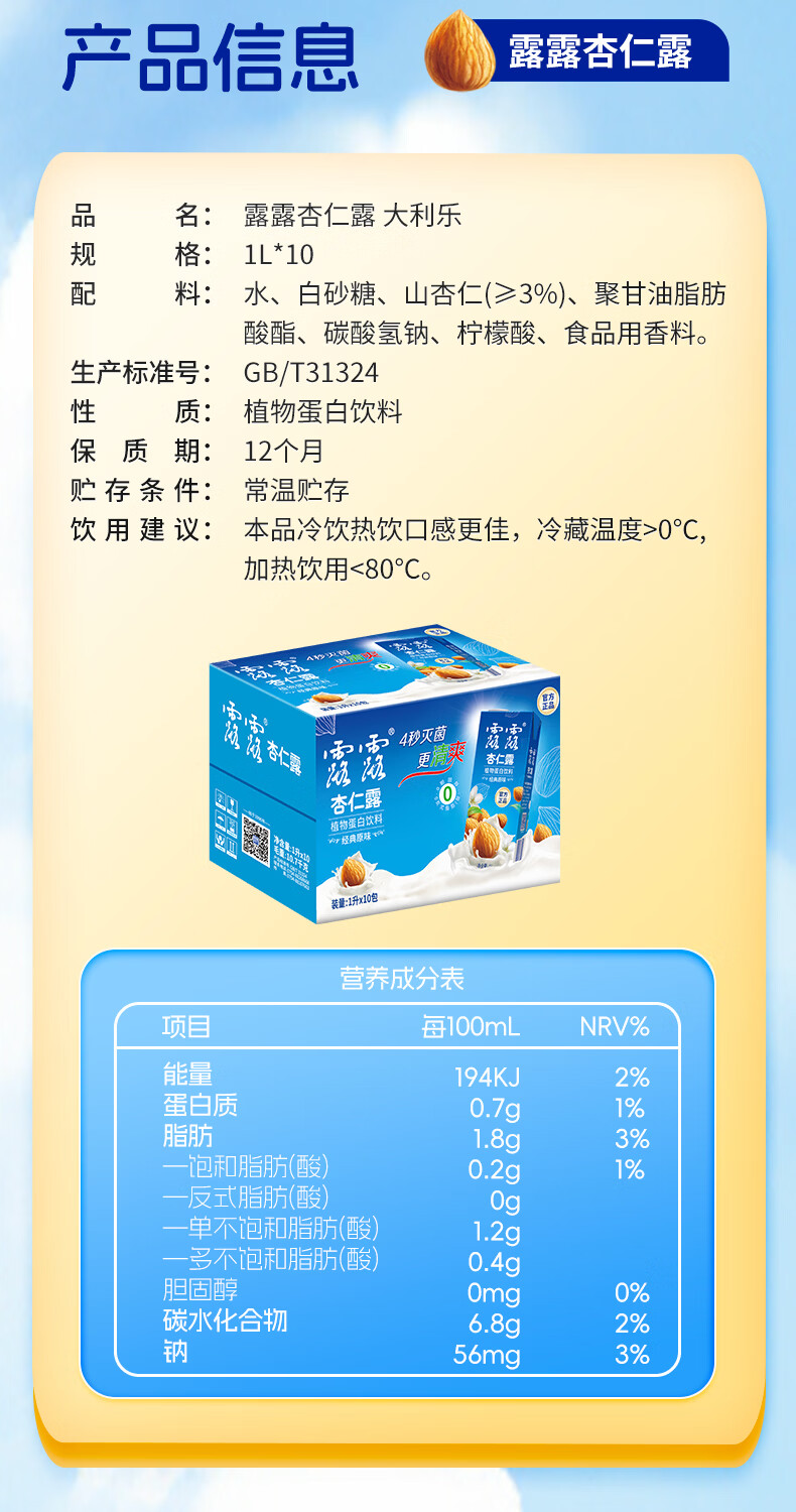 露露杏仁露经典大利乐1L*10盒囤货杏仁植物蛋白盒装年货送礼官方正品 1L*10