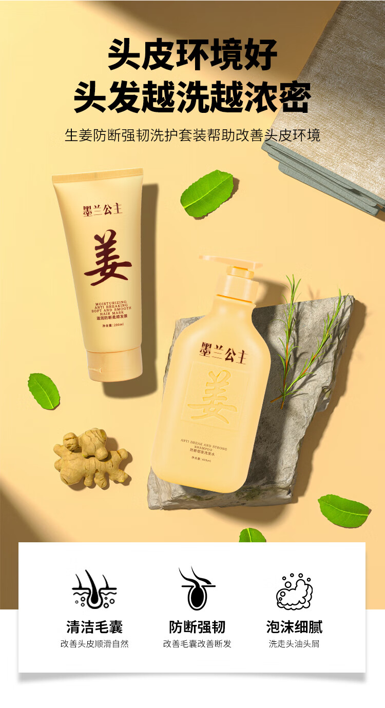 墨兰公主生姜防断强韧洗发水洗发露清洁毛囊洗头膏护发素沙龙级养护套装 生姜洗护套装 600ml*2瓶 -1套装