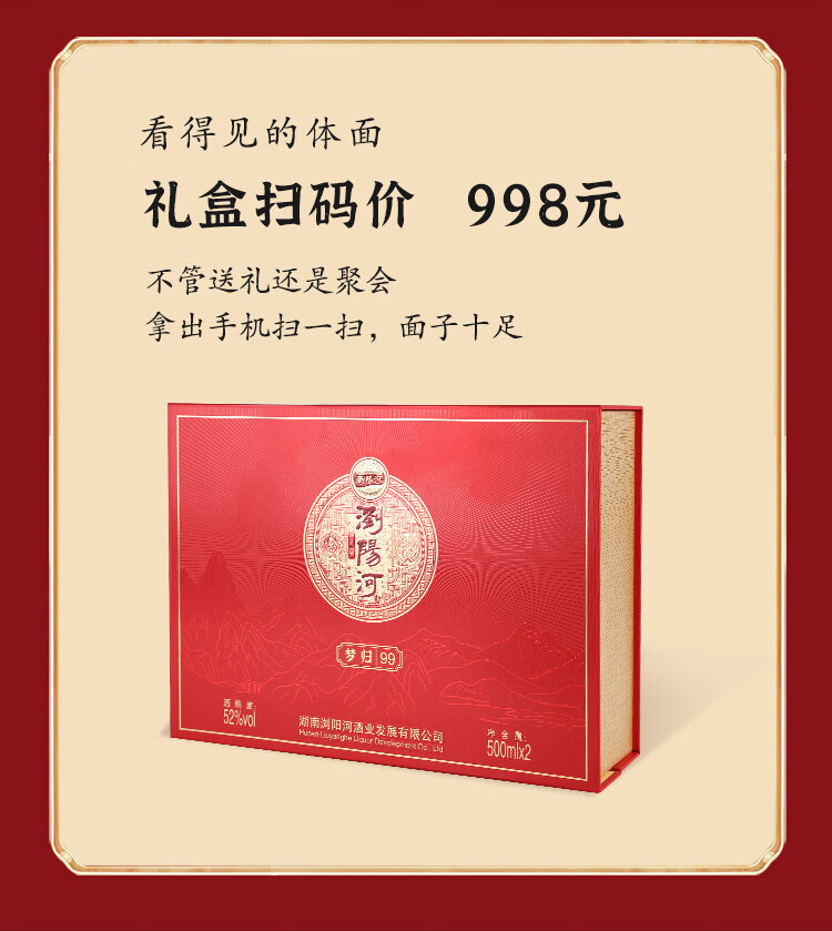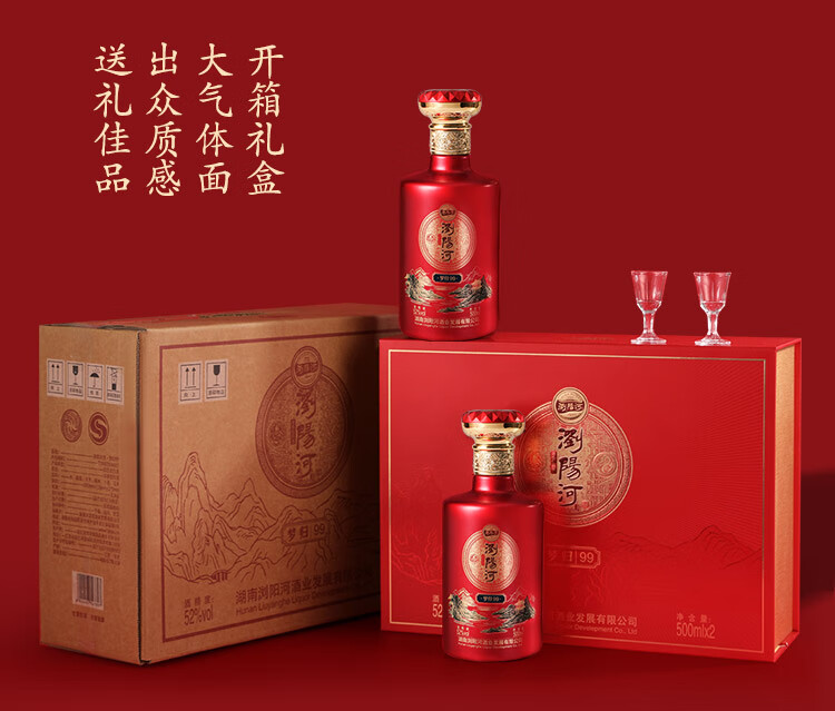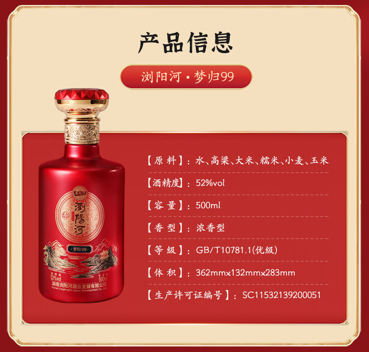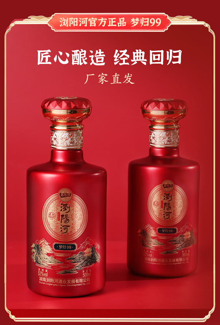 瀏陽河酒浏阳河酒梦归99礼盒装白酒浓香型52度2瓶送礼自饮浏阳河官方正品 52%vol 500mL 2瓶