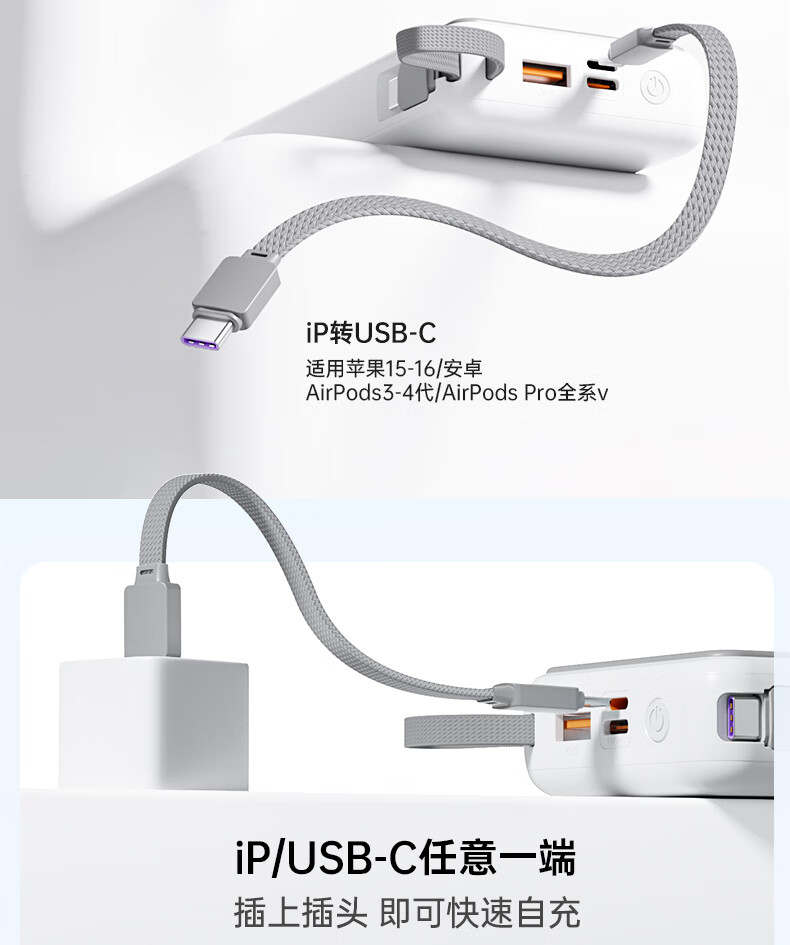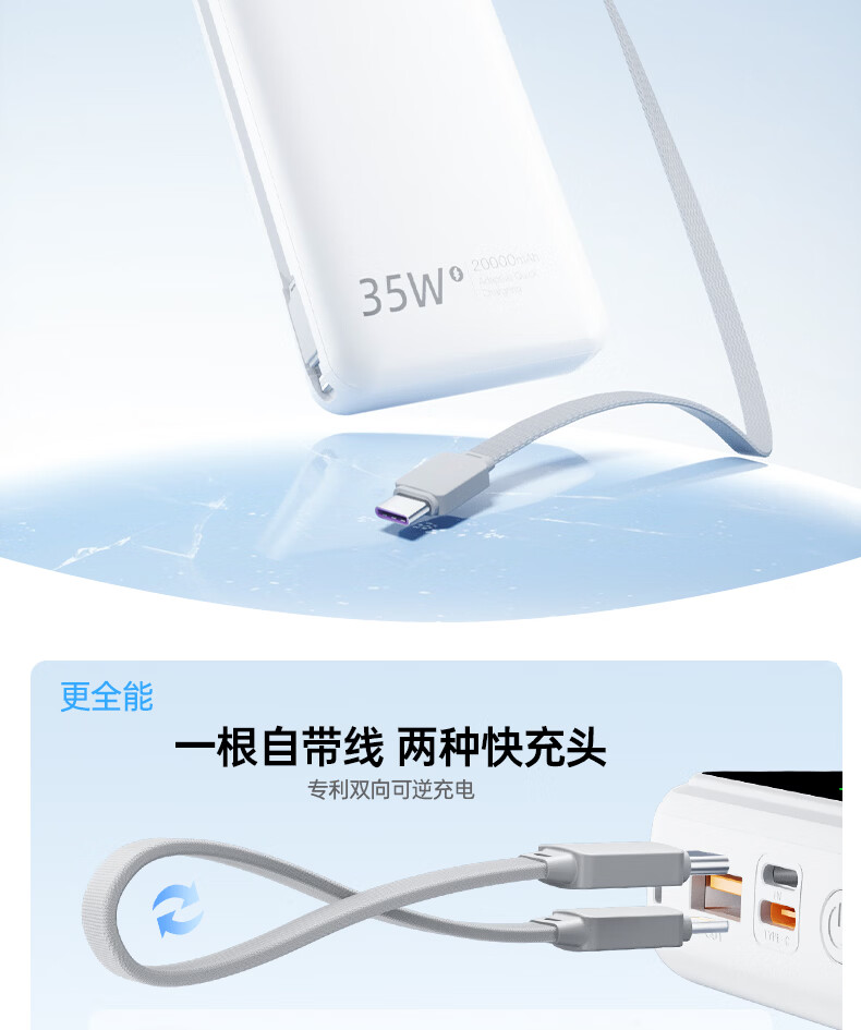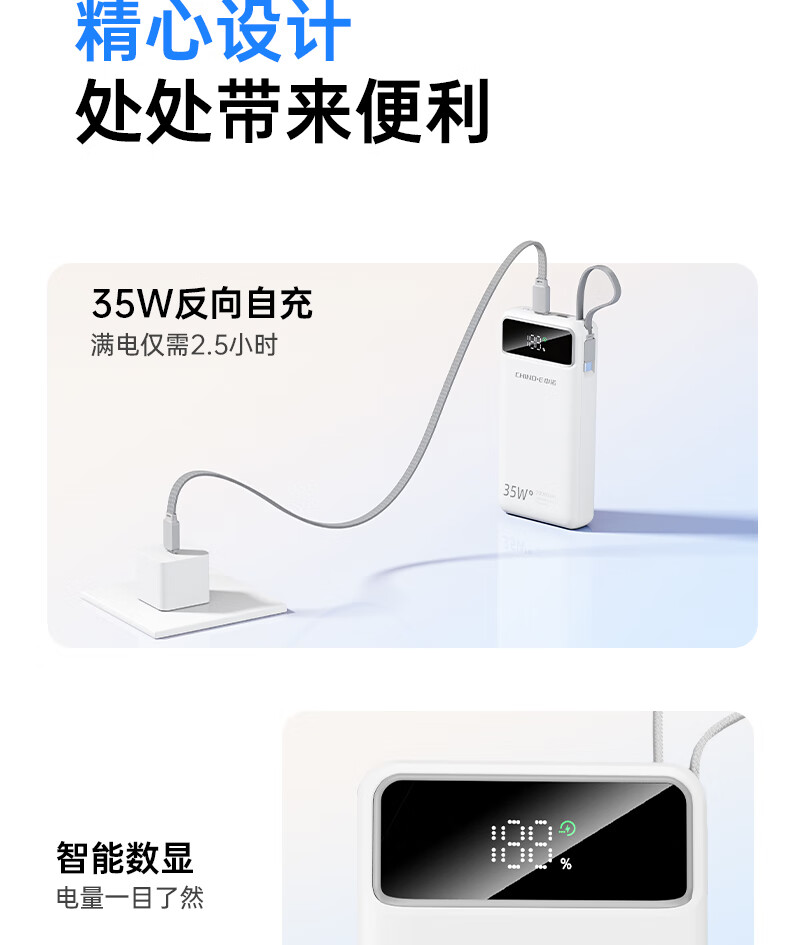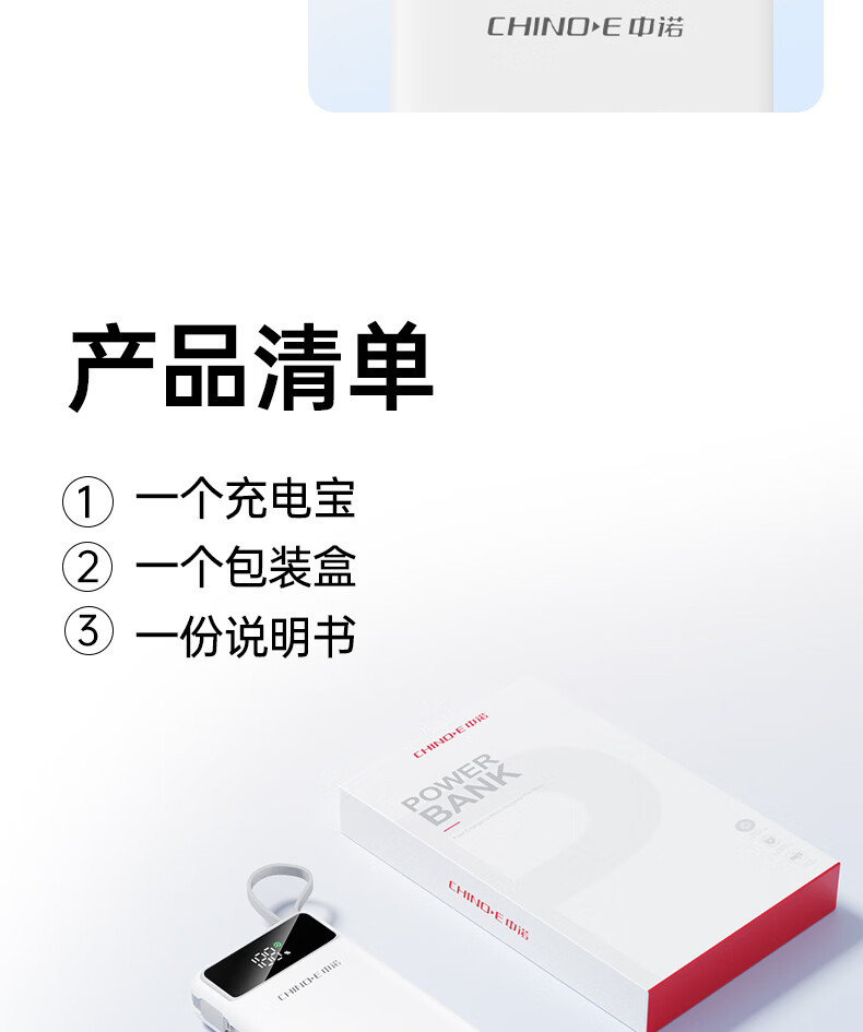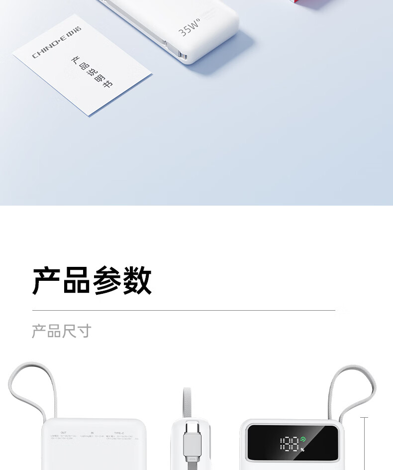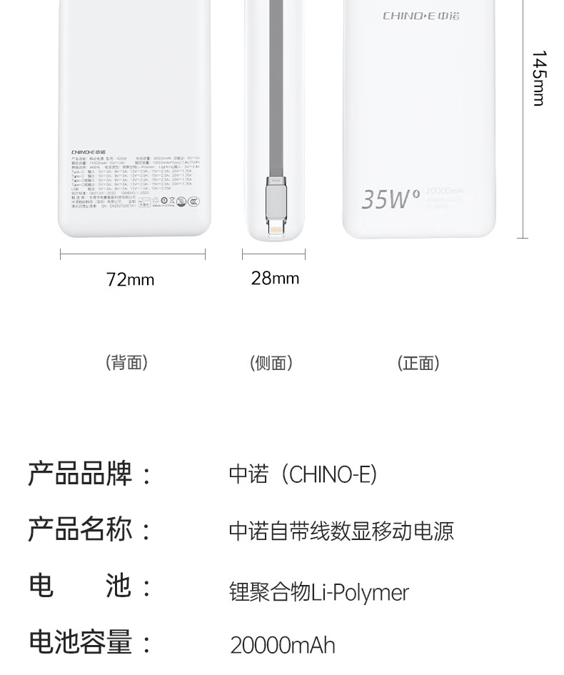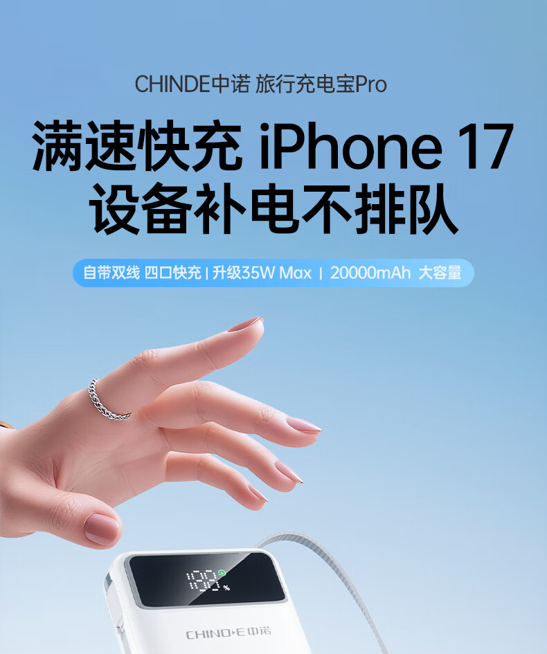 中诺(CHINO-E)【3C认证 可上飞机 35W快充】充电宝20000毫安自带线移动电源可充笔记本/苹果/15/16/iphone17安卓 【35W超级快充 | 2万毫安】标准版