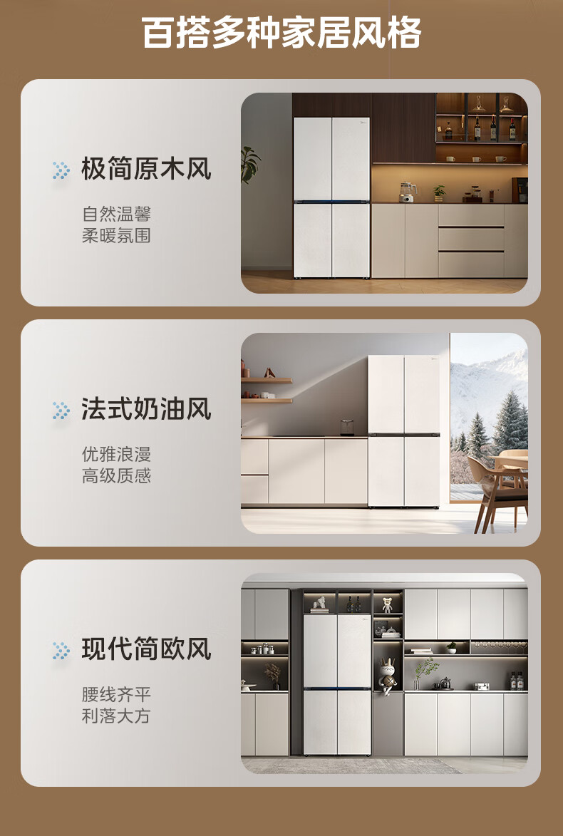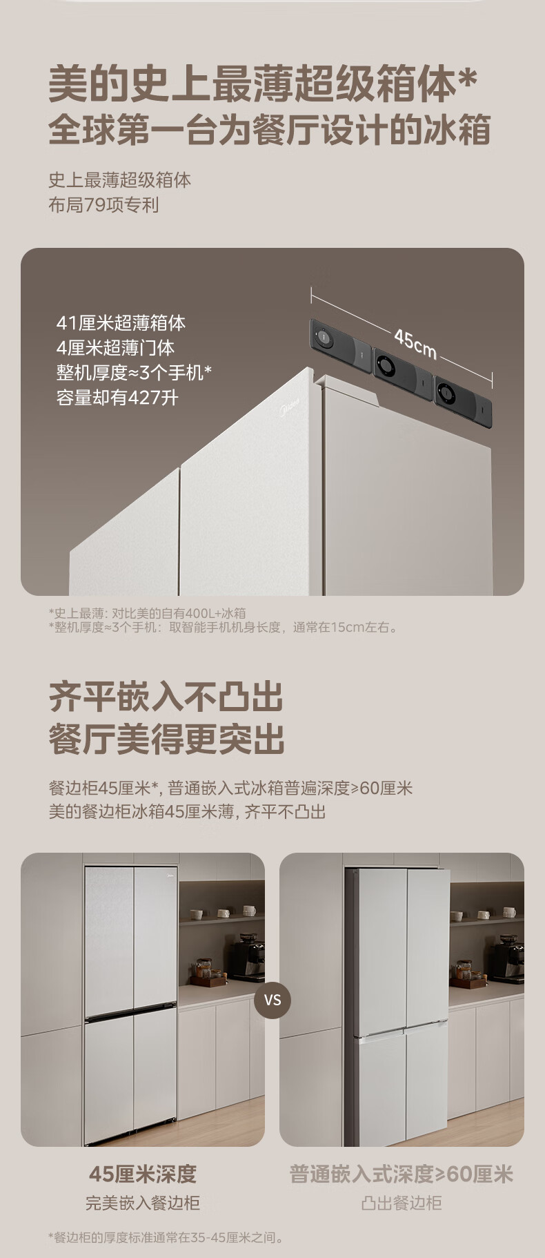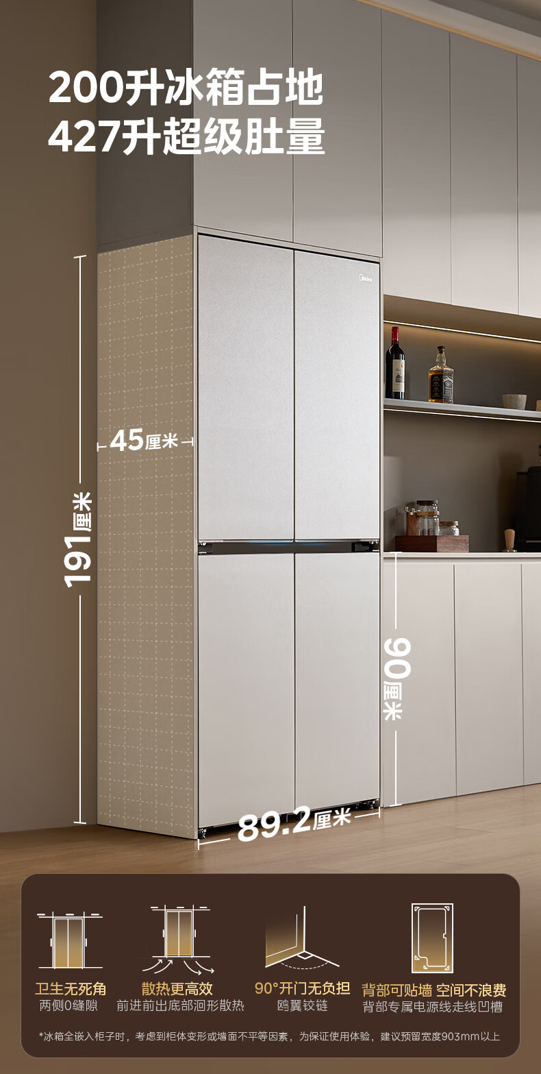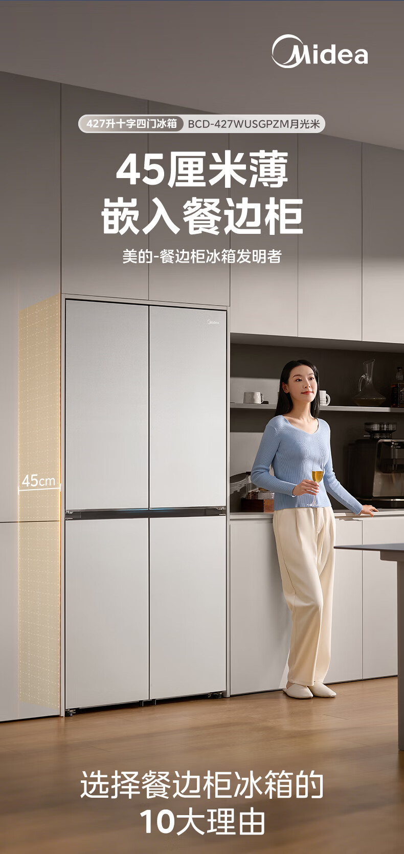 美的(Midea)餐边柜系列427L十字门45厘米薄嵌左餐右厨三循环一级能效风冷无霜以旧换新BCD-427WUSGPZM国家补贴