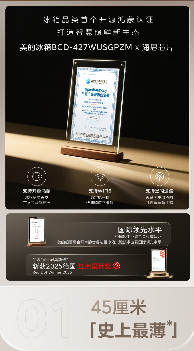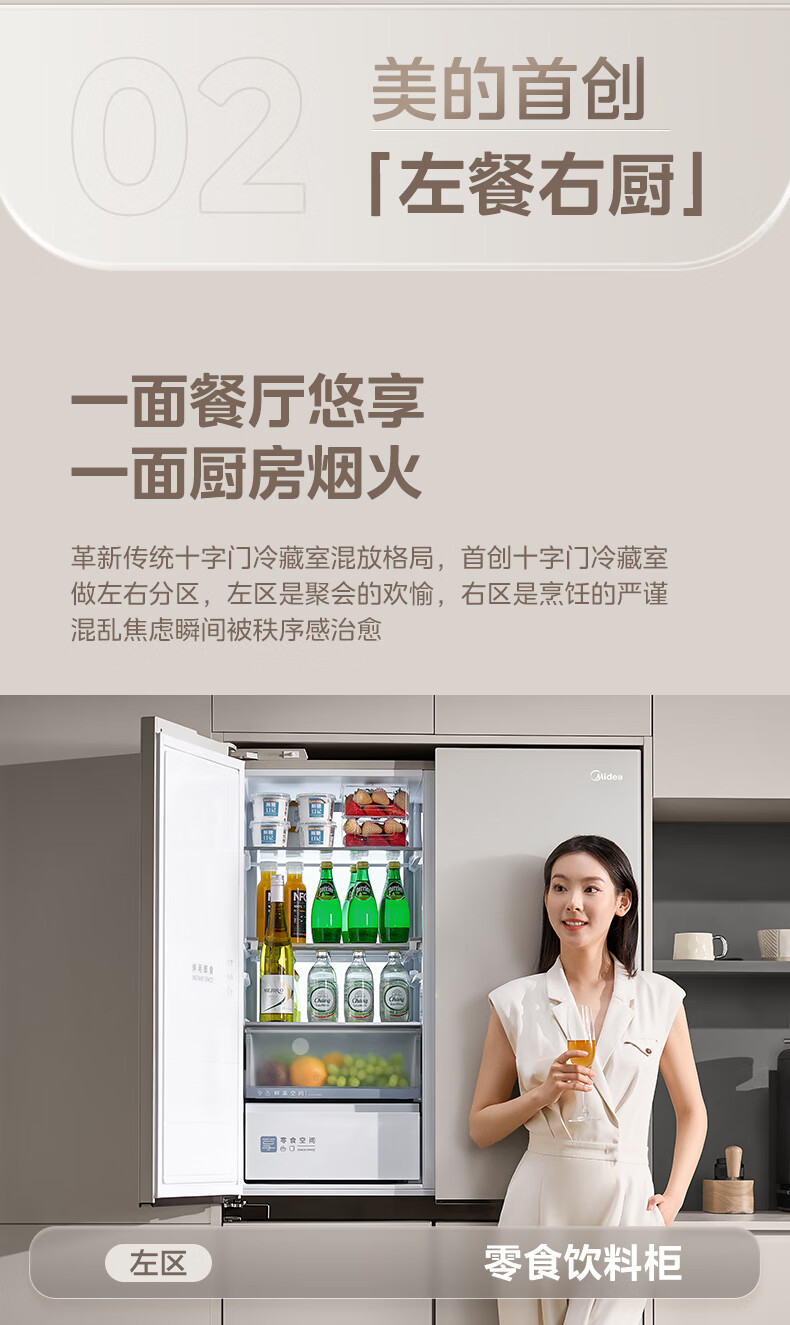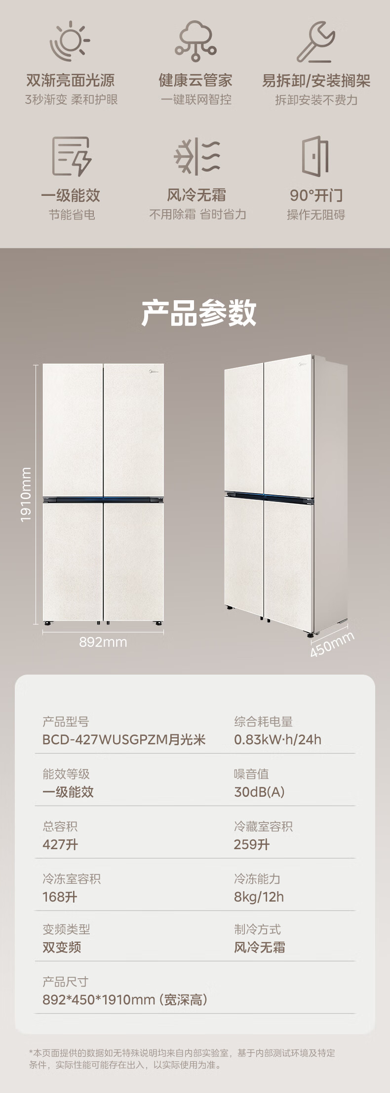 美的(Midea)餐边柜系列427L十字门45厘米薄嵌左餐右厨三循环一级能效风冷无霜以旧换新BCD-427WUSGPZM国家补贴