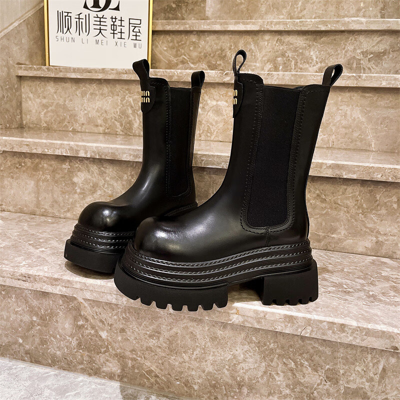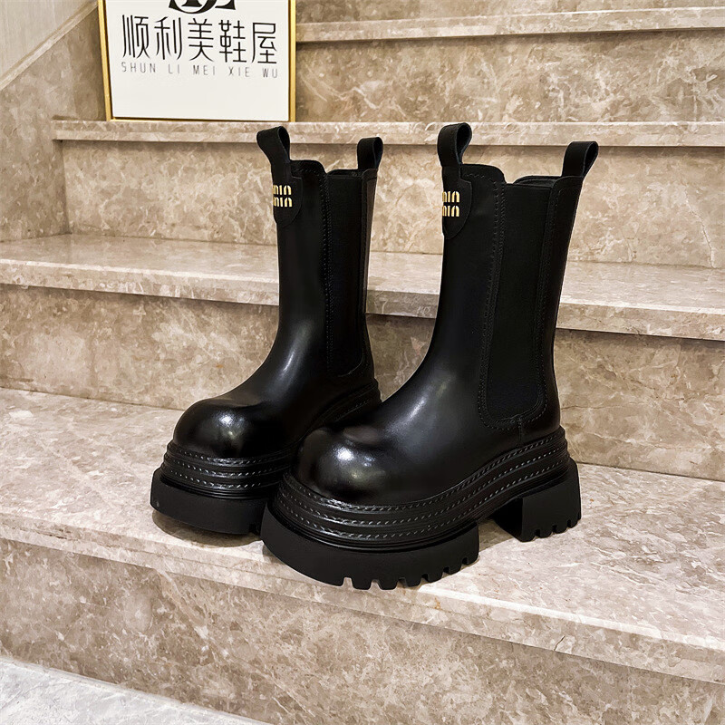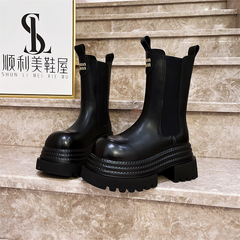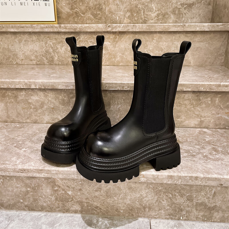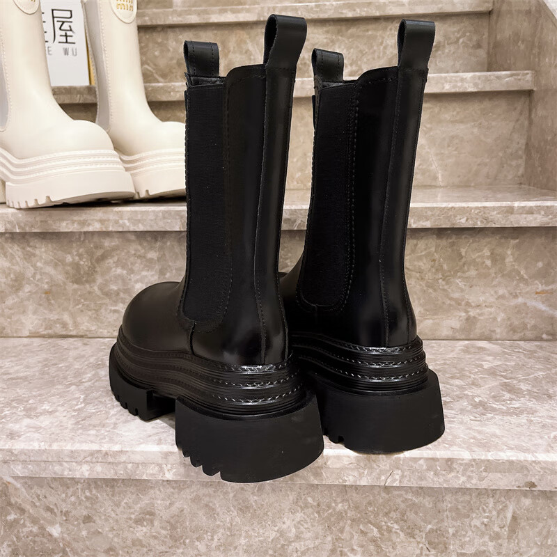 稻草人(MEXICAN)真皮字母厚底松糕小个子马丁靴三层底增高烟筒靴切尔西靴加绒短靴 黑色单里 35