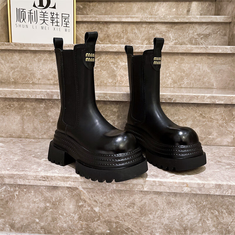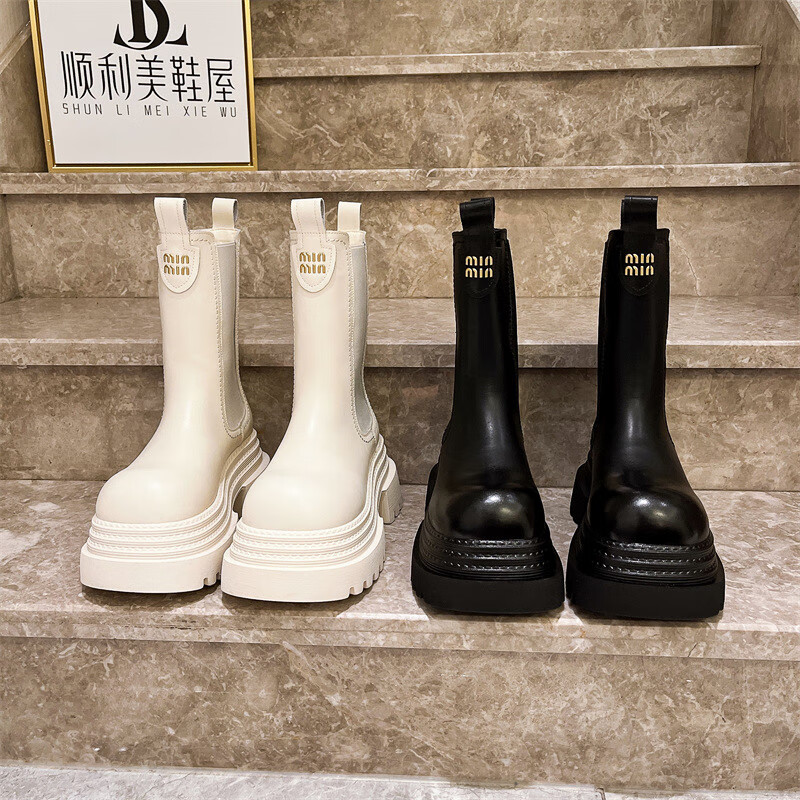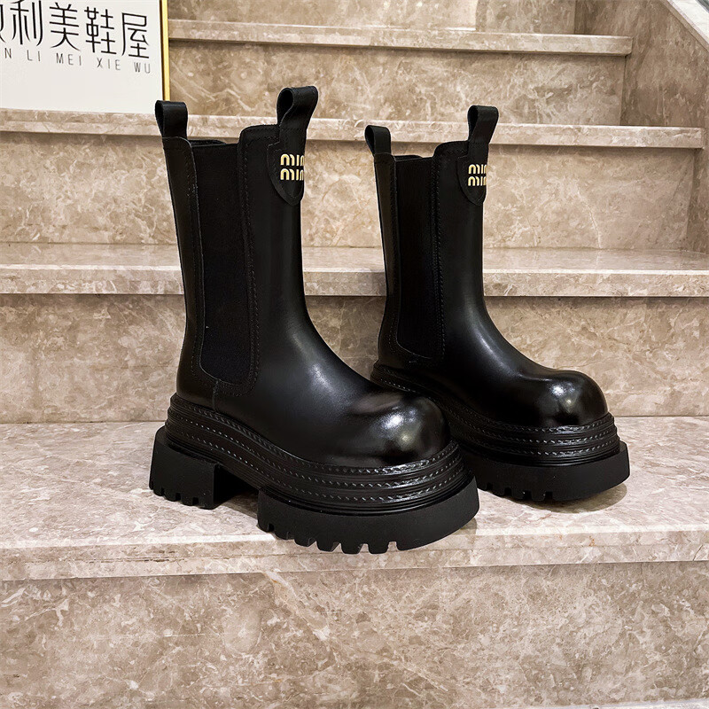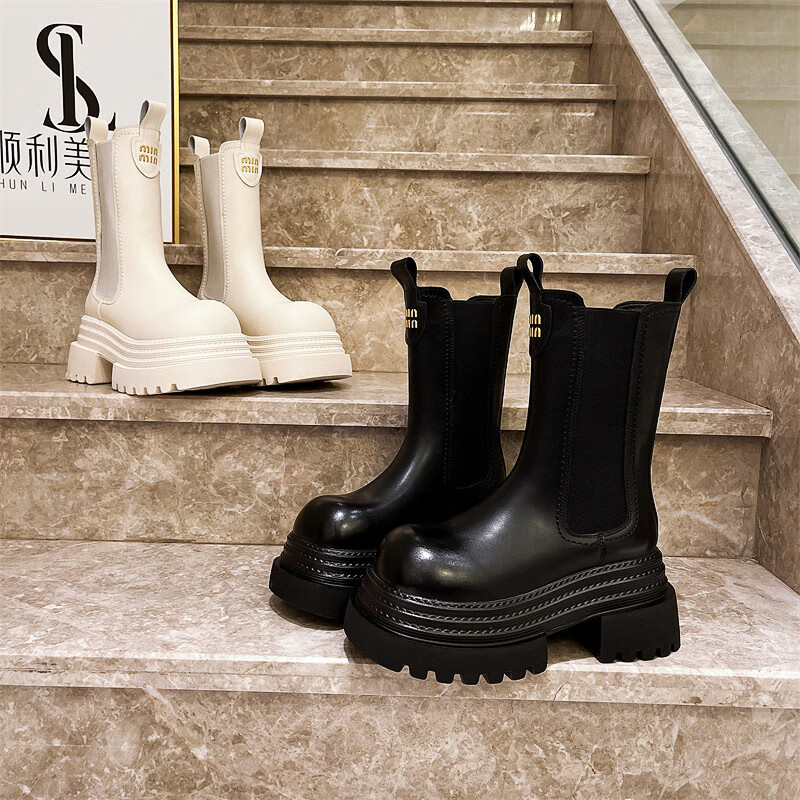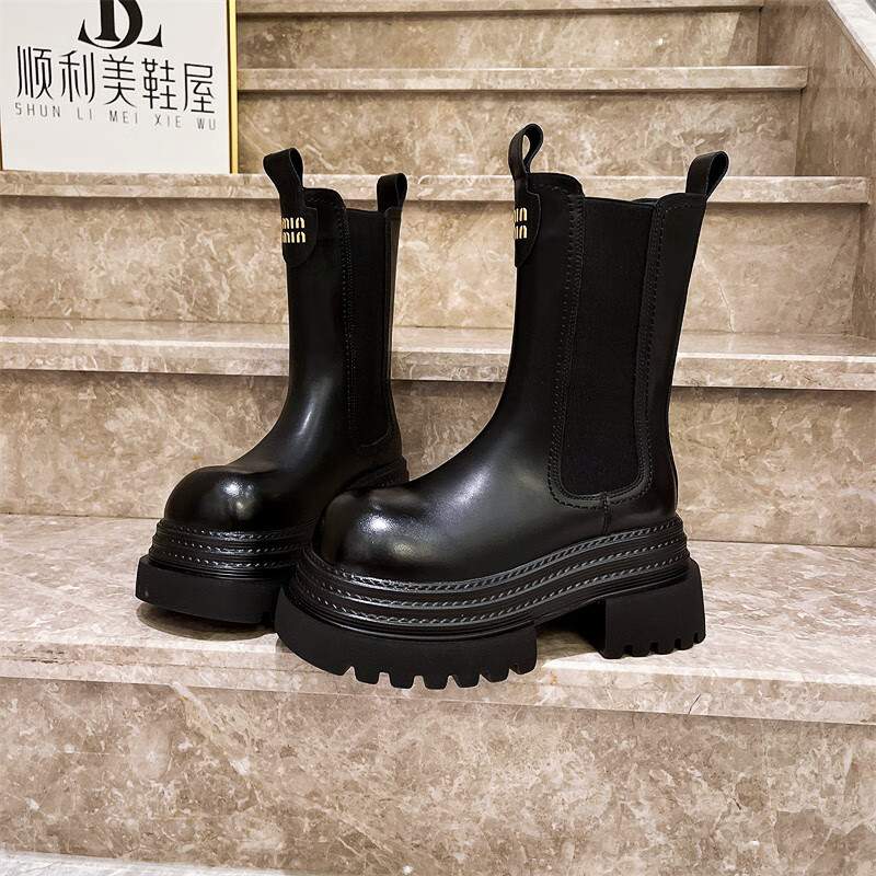 稻草人(MEXICAN)真皮字母厚底松糕小个子马丁靴三层底增高烟筒靴切尔西靴加绒短靴 黑色单里 35
