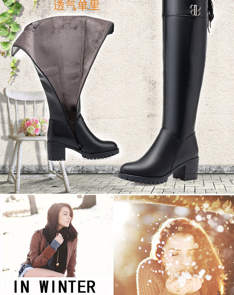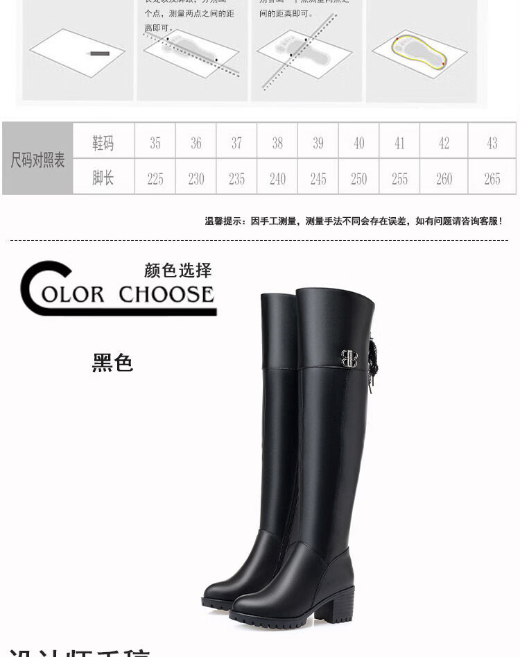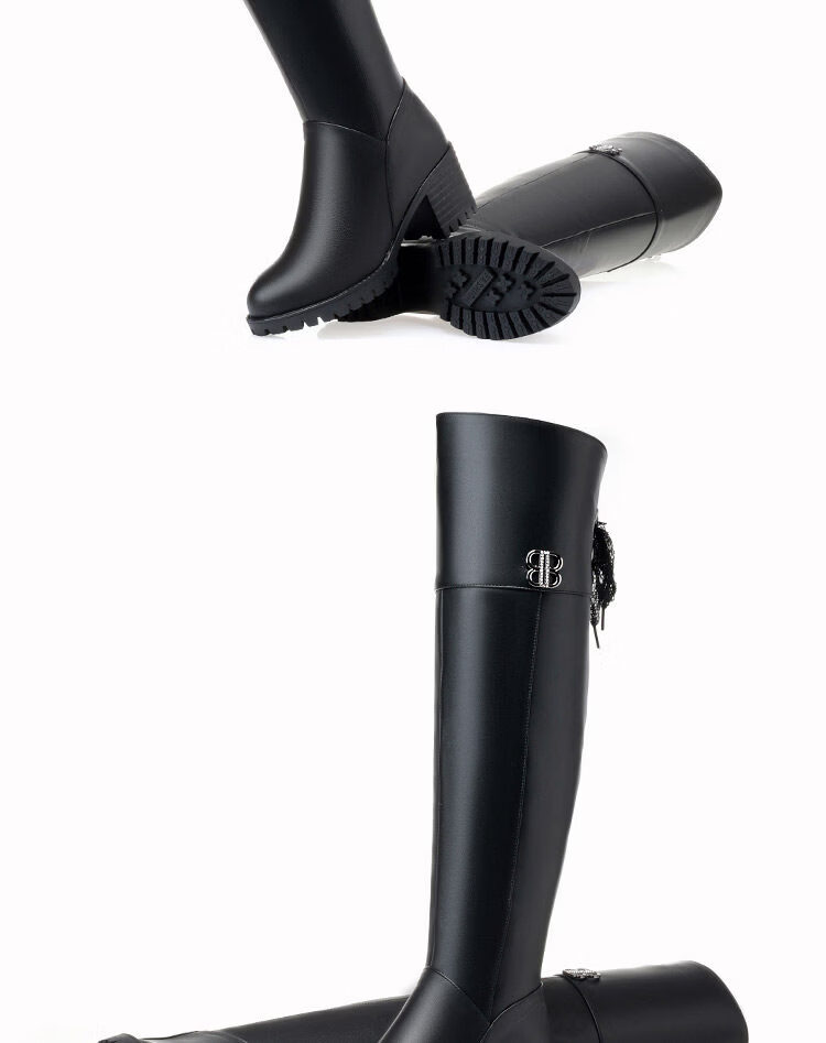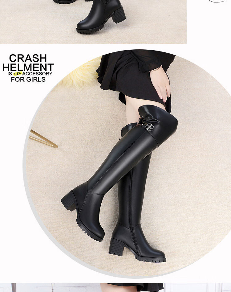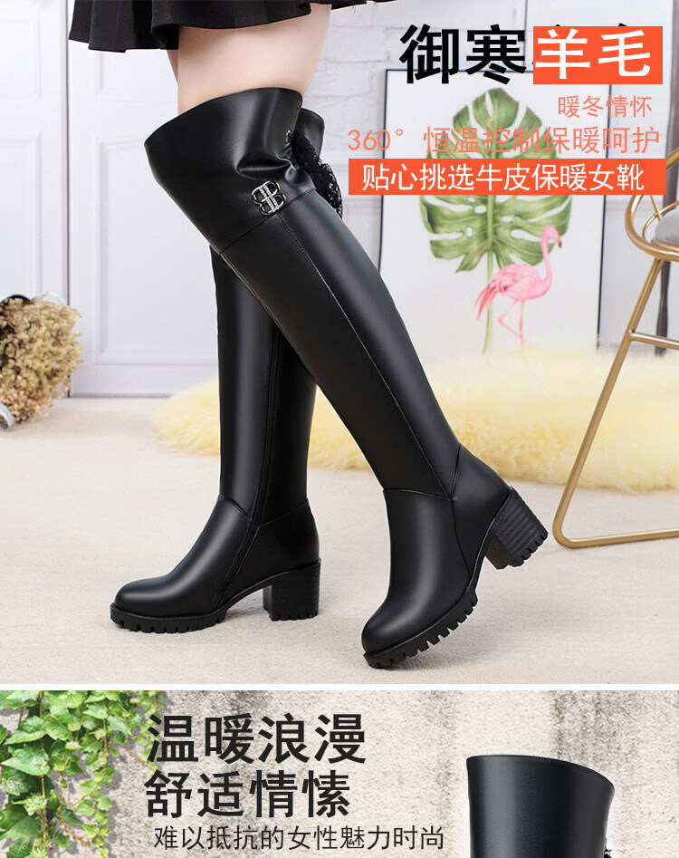稻草人(MEXICAN)全牛皮真皮过膝靴女加绒冬季长靴中跟高筒羊毛长筒靴粗跟加厚靴子 黑色中跟【绒毛里】 35