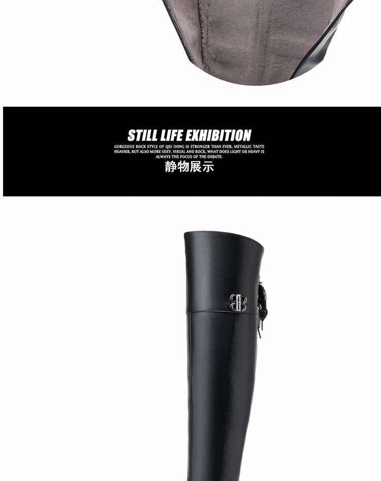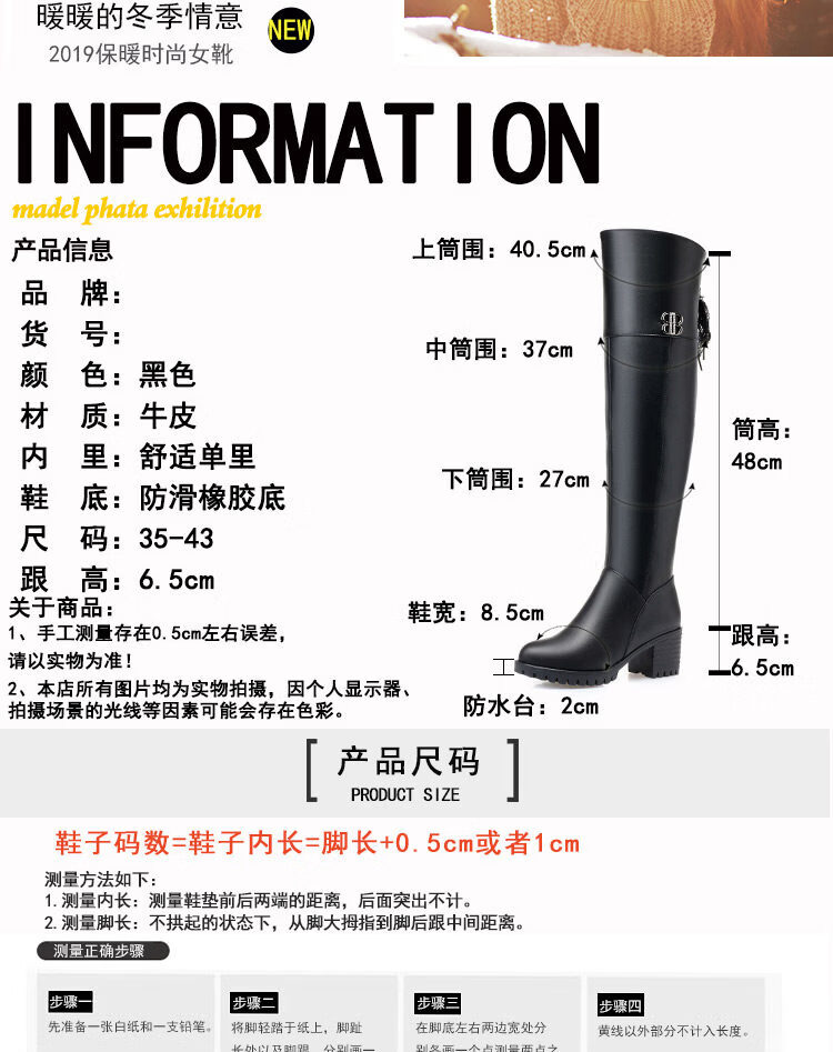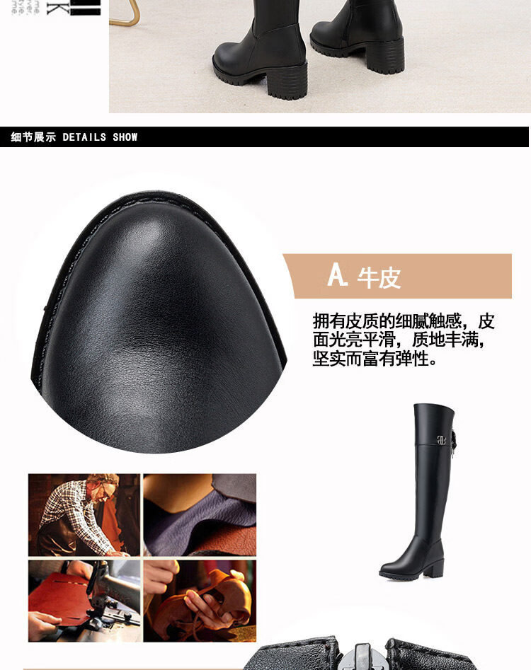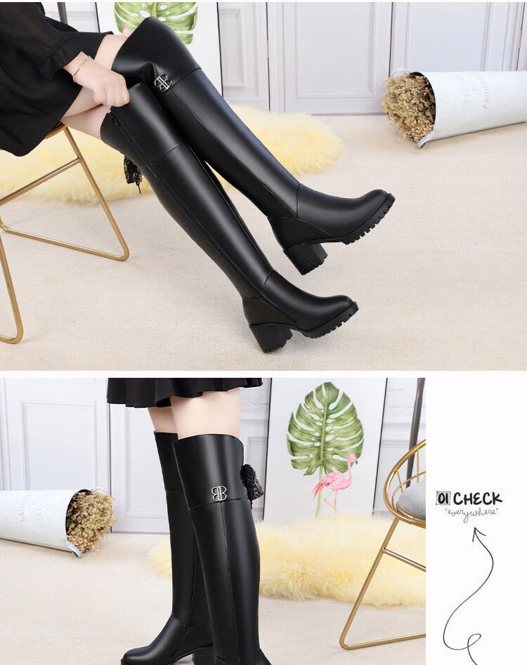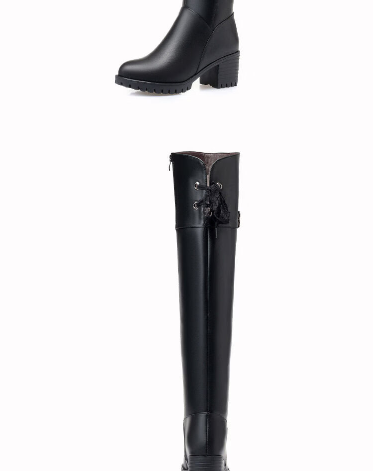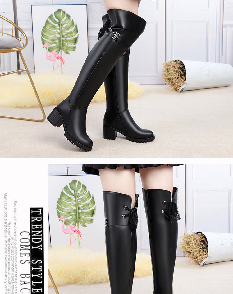 稻草人(MEXICAN)全牛皮真皮过膝靴女加绒冬季长靴中跟高筒羊毛长筒靴粗跟加厚靴子 黑色中跟【绒毛里】 35