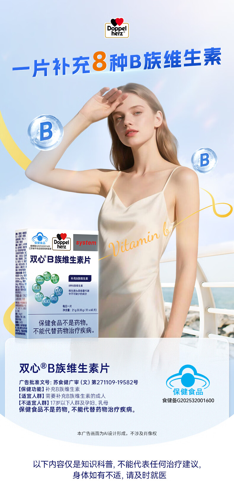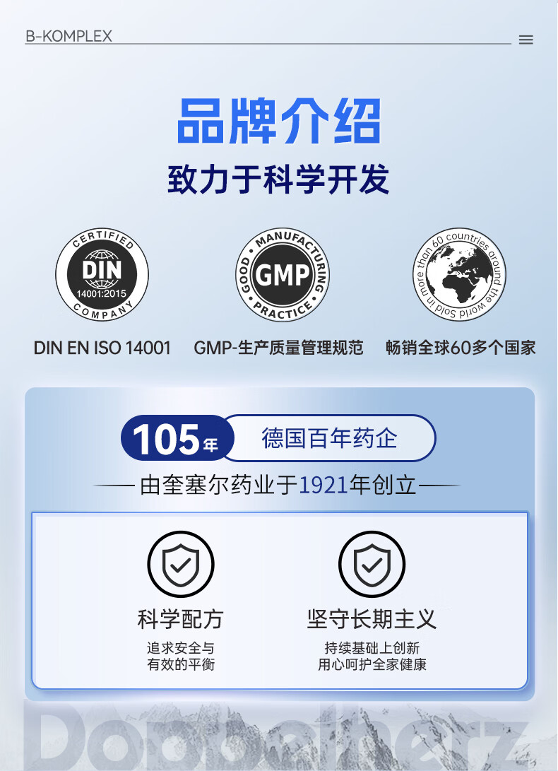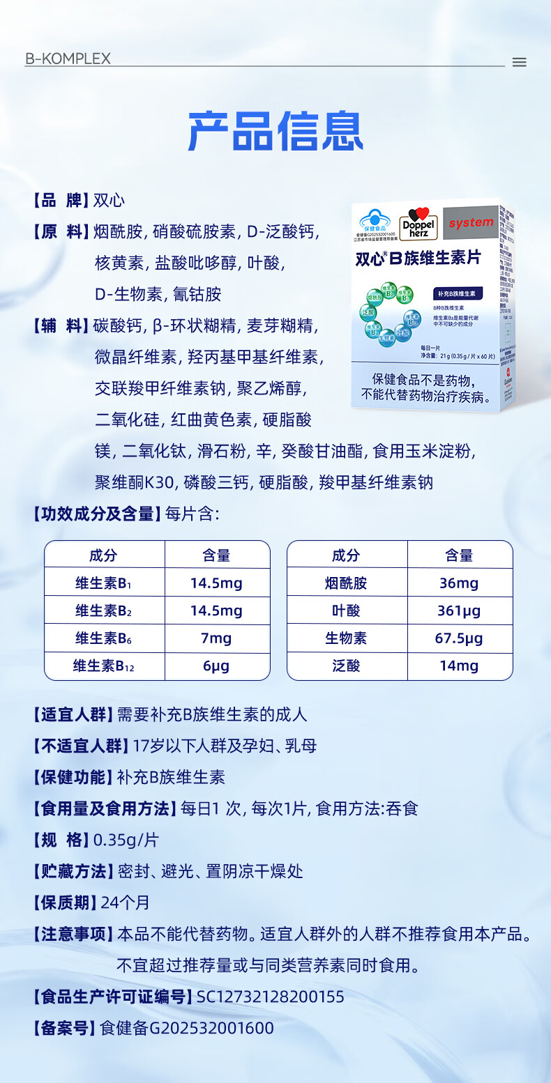 双心(Doppel herz)复合维生素B族8大B族成分B1B2生物素B6烟酰胺B12叶酸口腔溃疡 【复合维B】 60粒*3盒 半年巩固