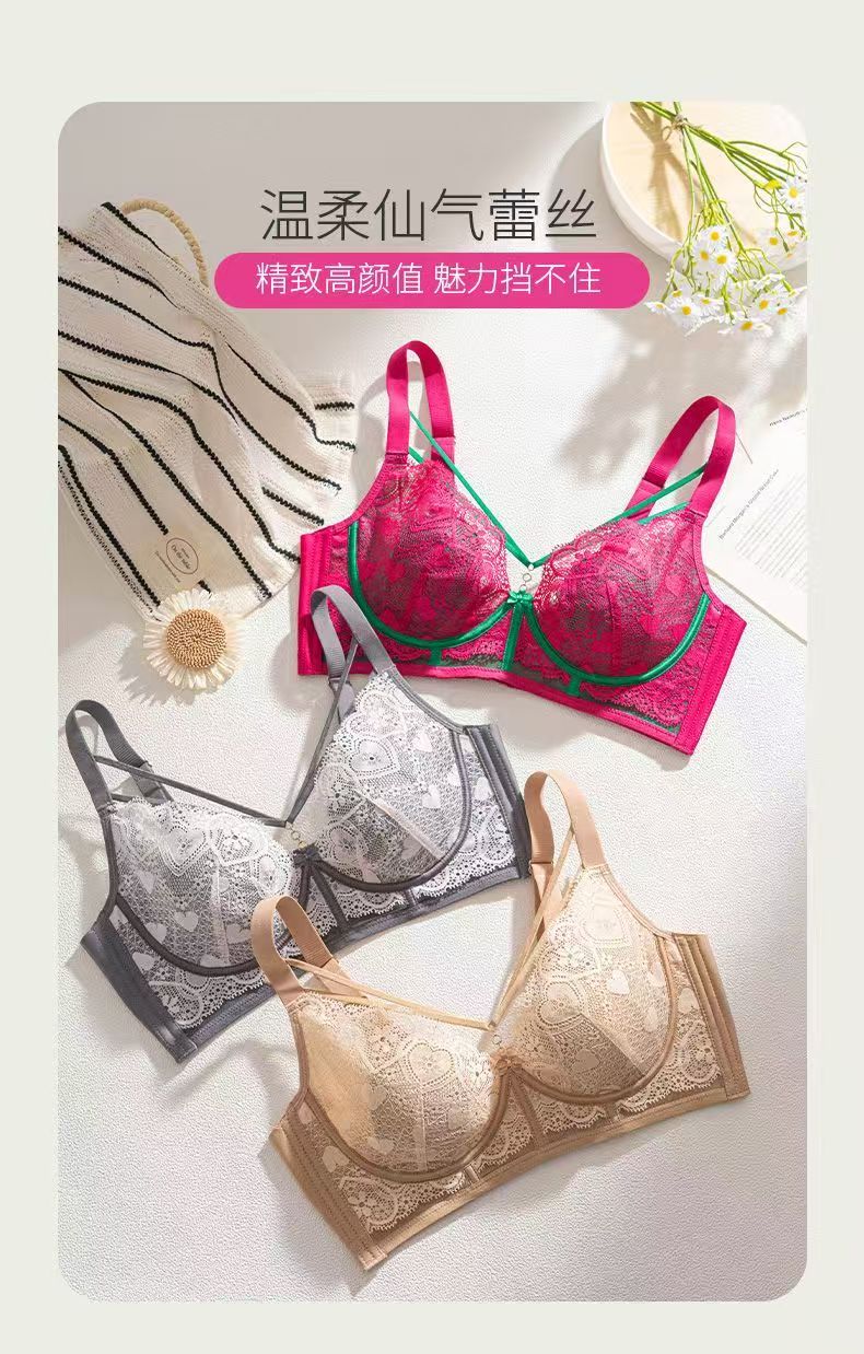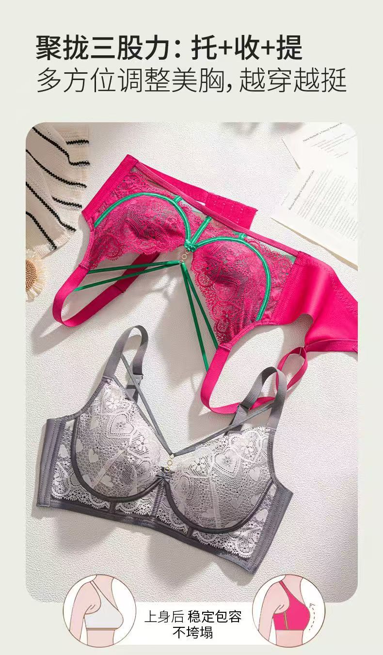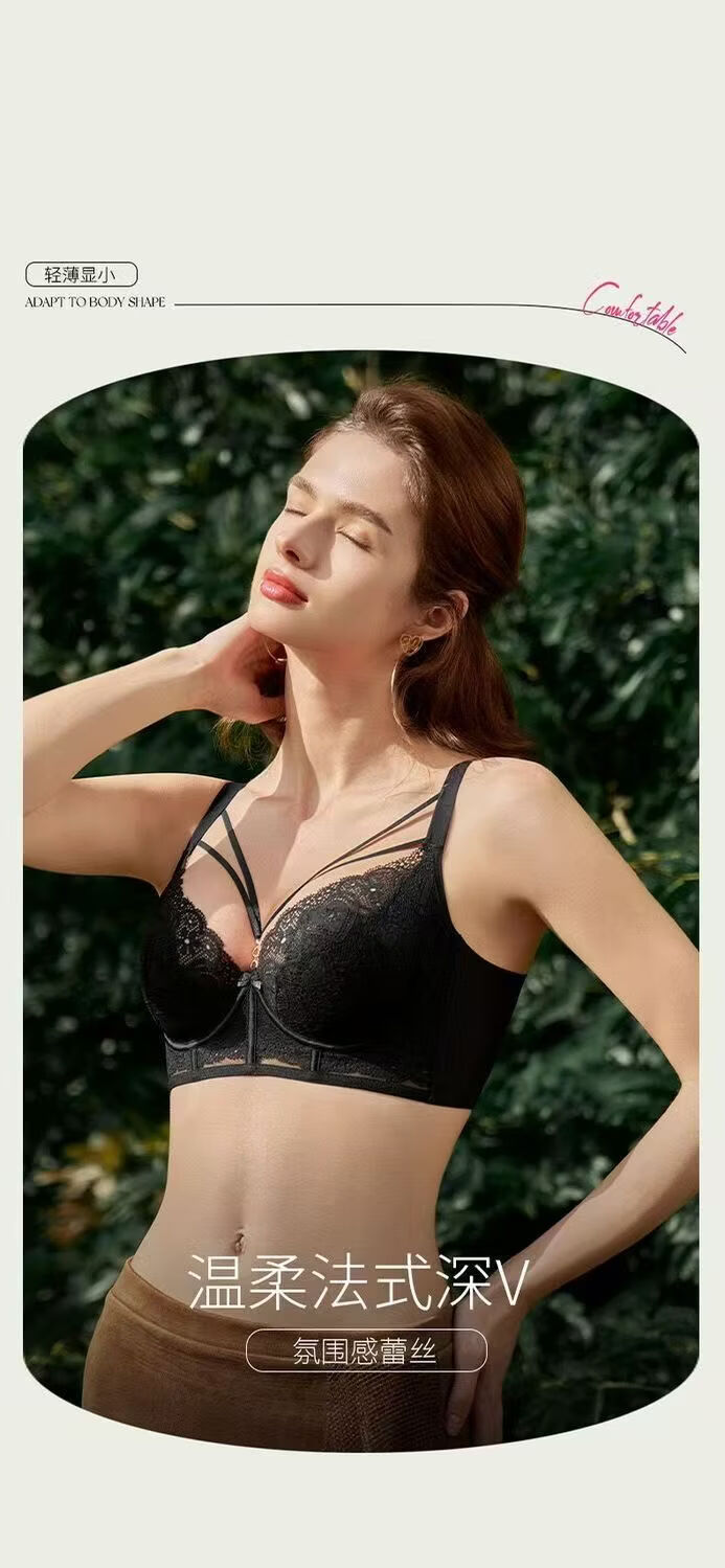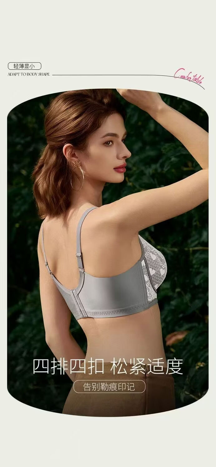 超薄文胸免耳杯大胸显小性感纯欲撞色蕾丝聚拢上托防下垂文胸内衣 米色+浅灰 (水晶蓝色) 95B 42/95B