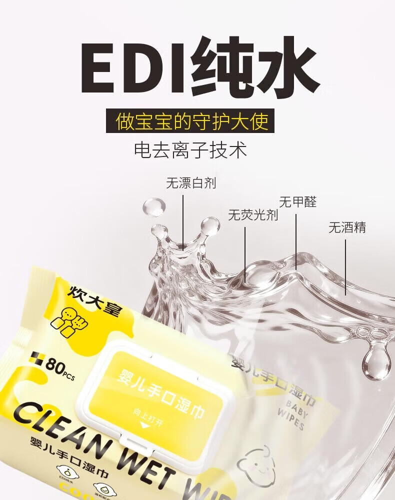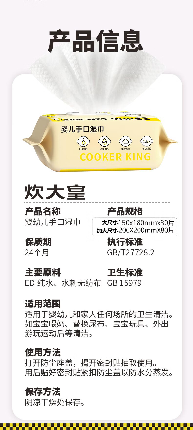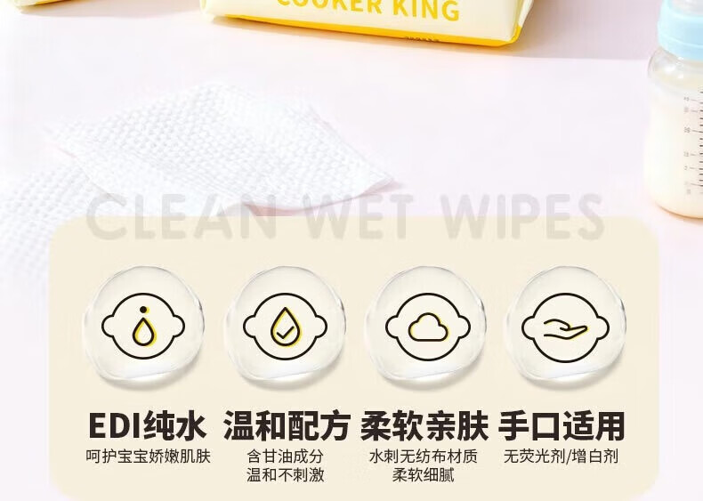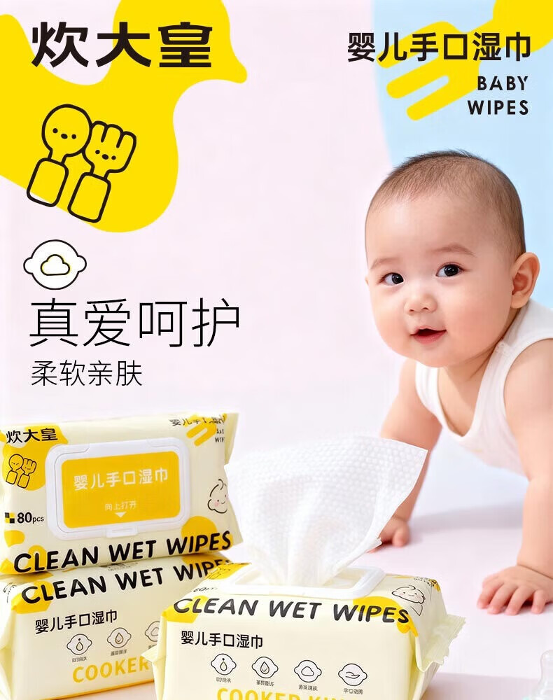 炊大皇纯水湿巾纸家用大包实惠装婴儿手口专用清洁湿纸巾去污无香无酒精 150x180MM大片装4包320抽(常规厚度55g纸)