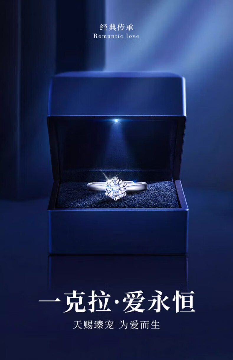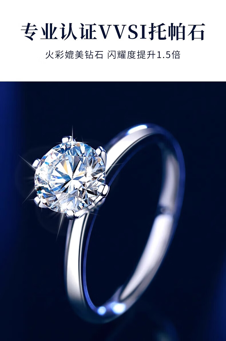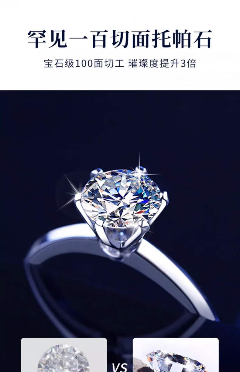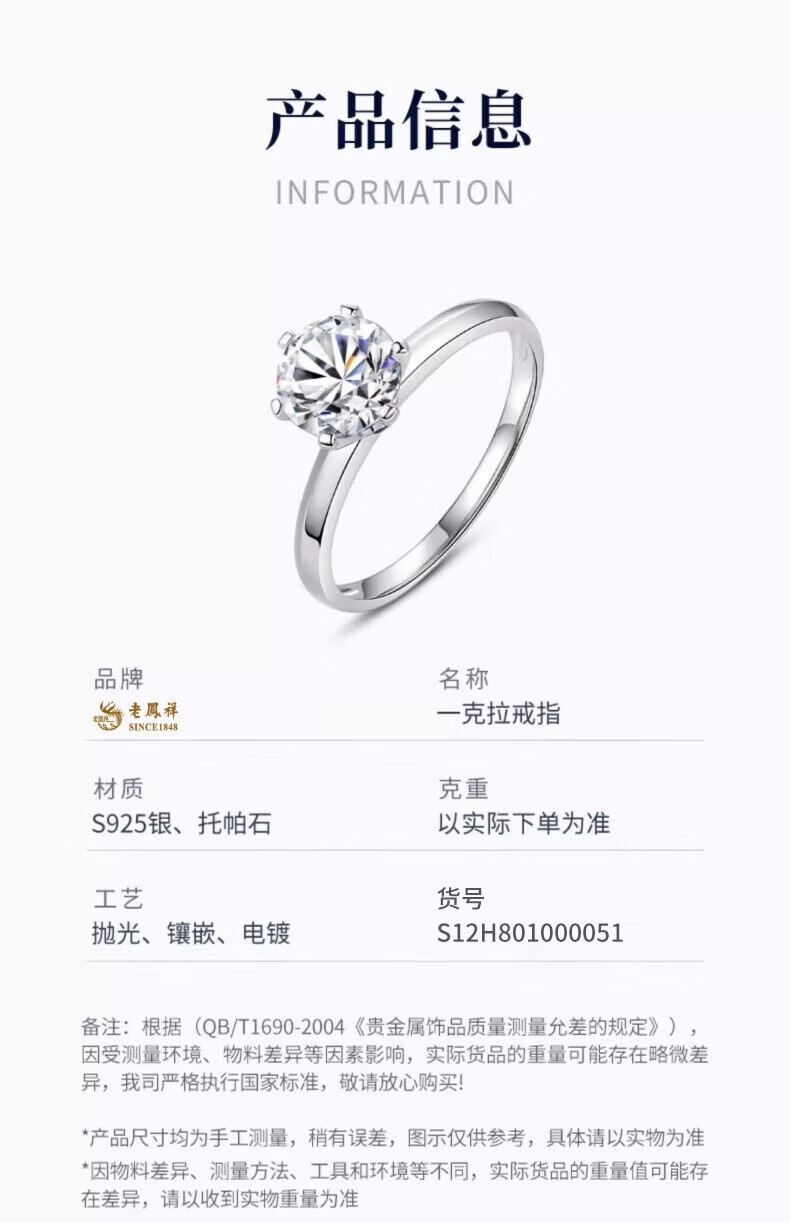 老凤祥一克拉托帕石钻石戒指纯银求婚情侣对戒纪念日情人节礼物送女朋友 一克拉戒指-925银*刻字/代写贺卡