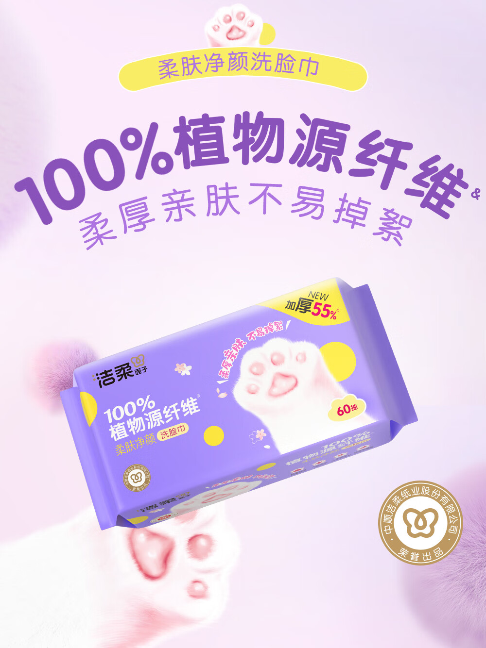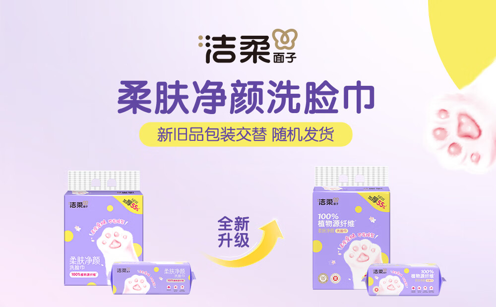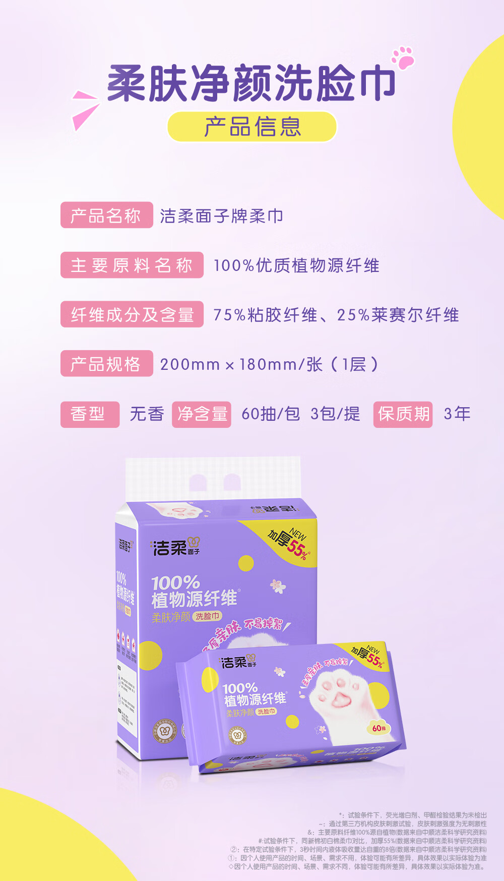 洁柔洗脸巾60抽*3包柔肤净颜母婴可用 大规格加大加厚干湿两用擦脸巾