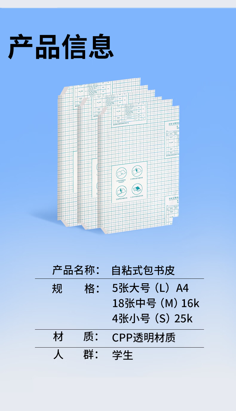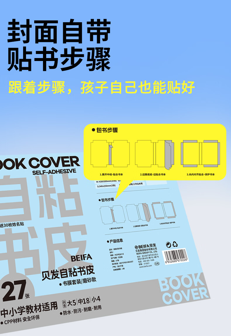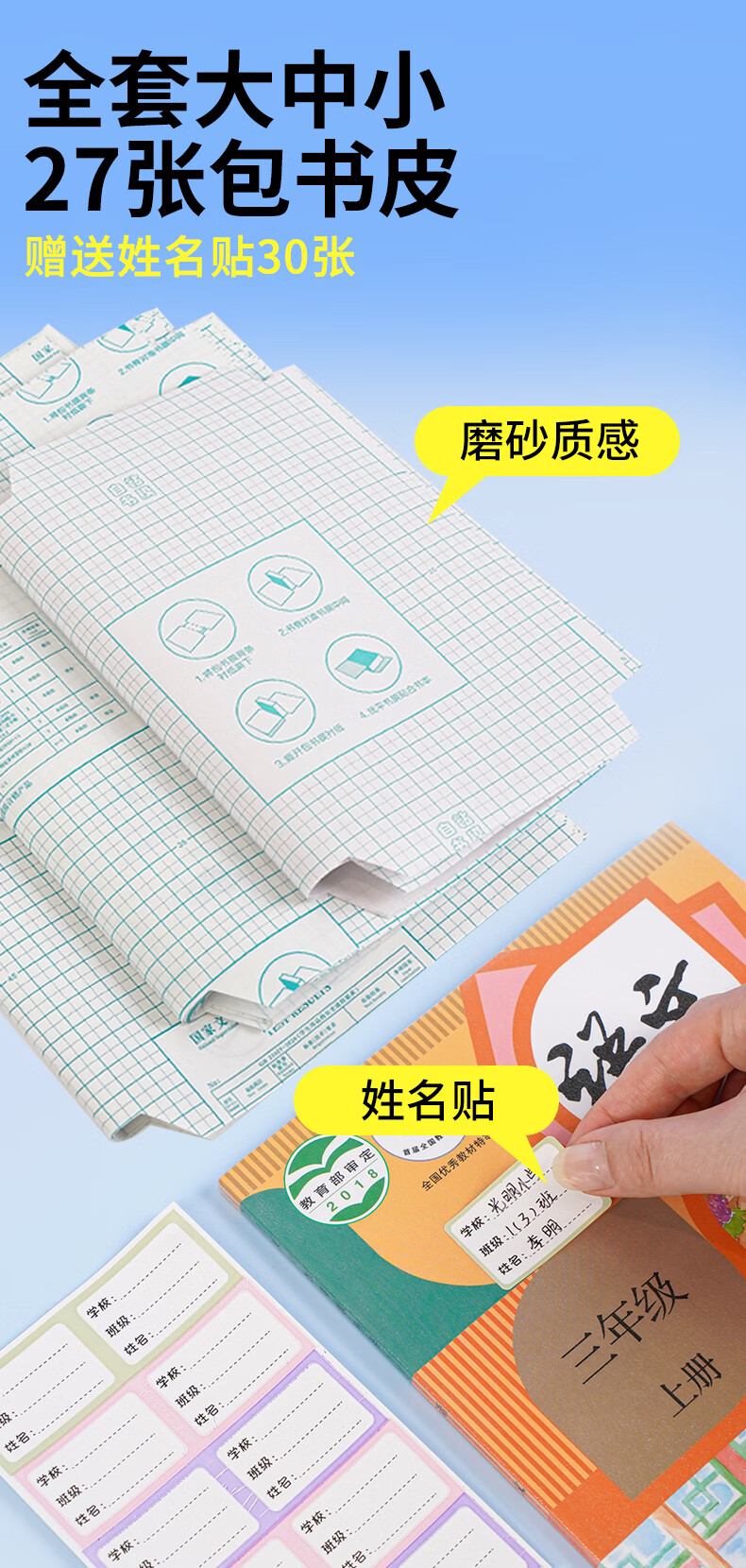 BEIFA自粘磨砂加厚透明自粘包书皮保护套小学生课本书皮包书膜16K/A4开学文具 27张(大号5张+中号18张+小号34张)