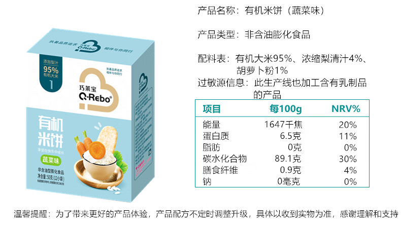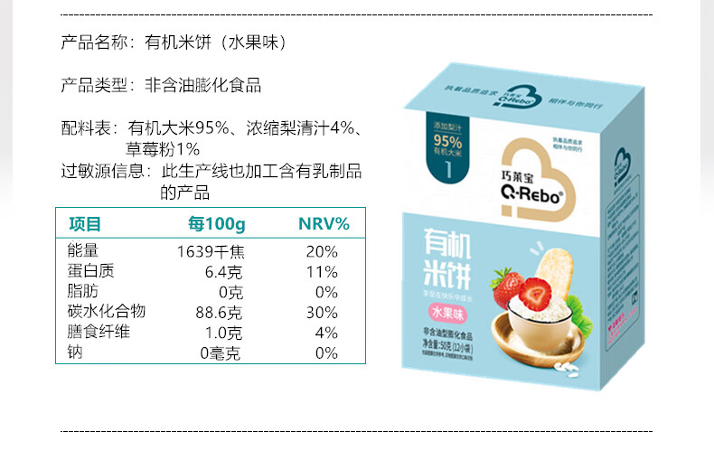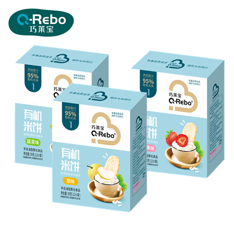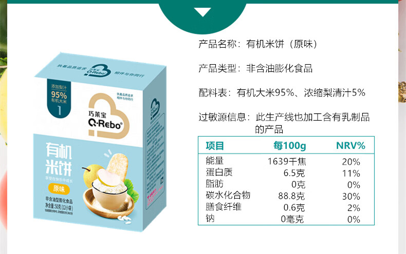 巧莱宝有机米饼50g 入口易化 原味水果蔬菜味儿童小零食 磨牙饼干 水果味*1盒