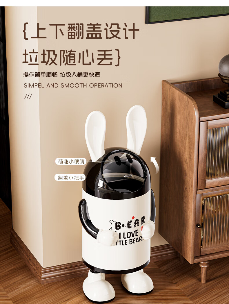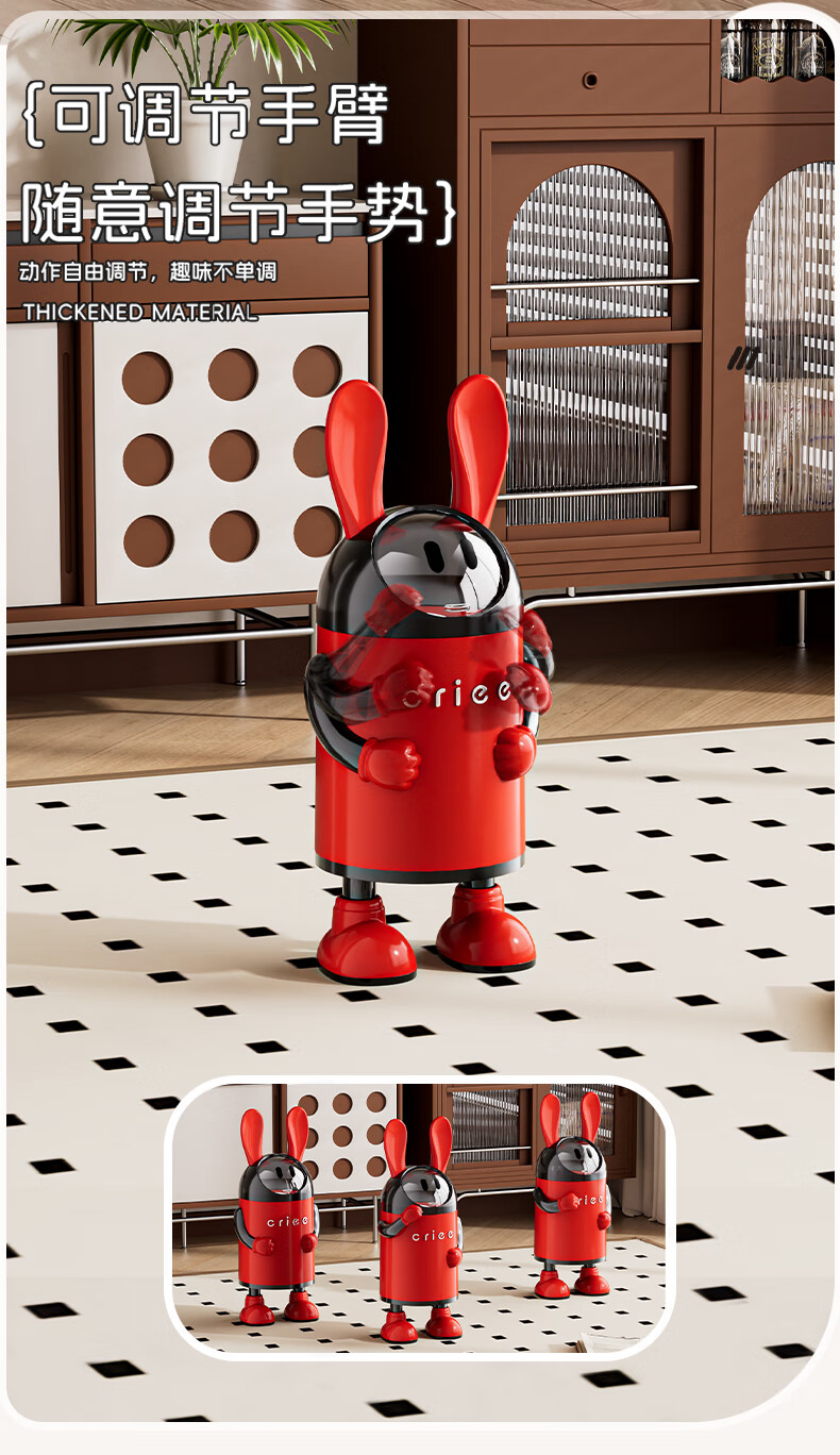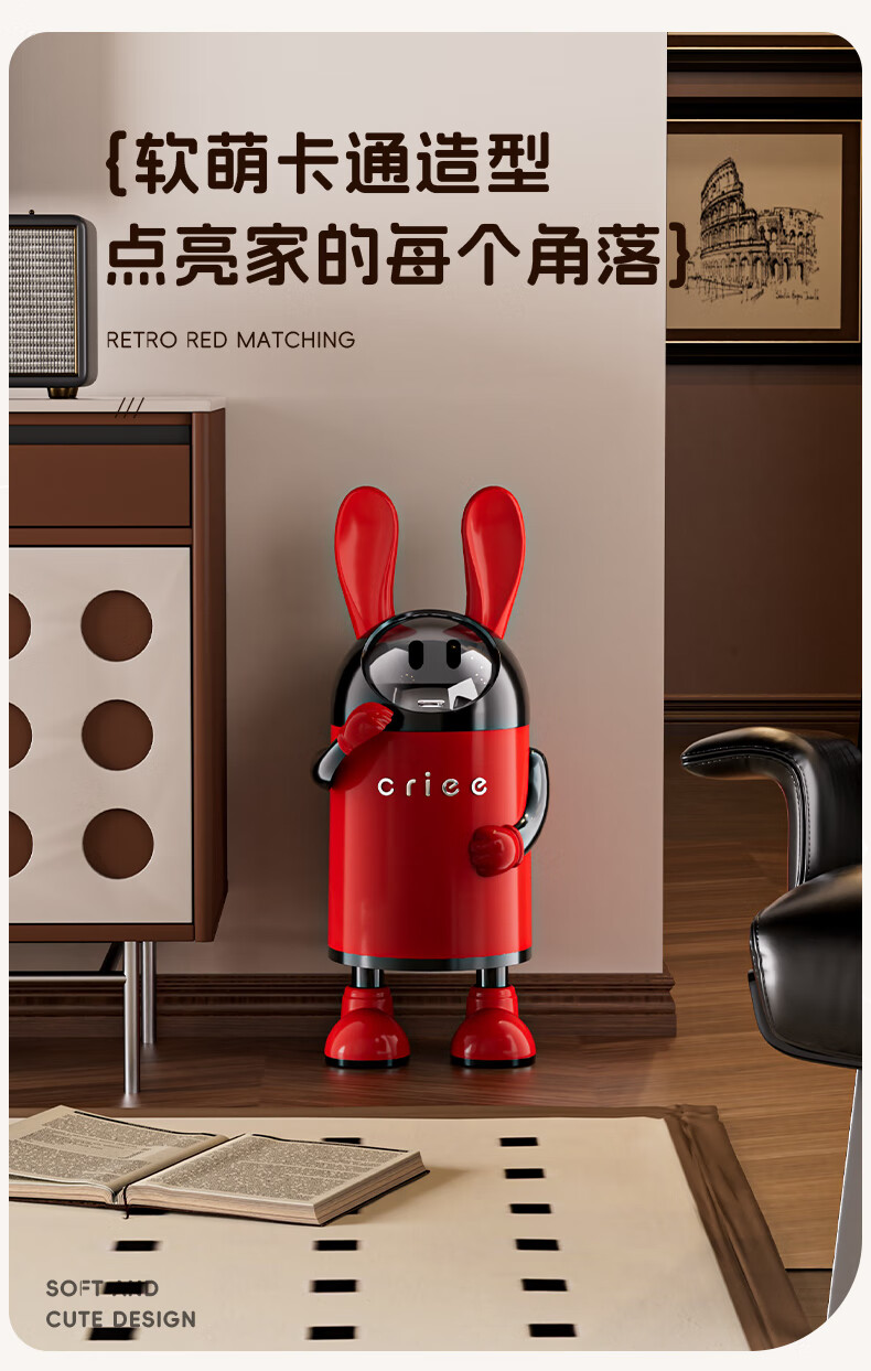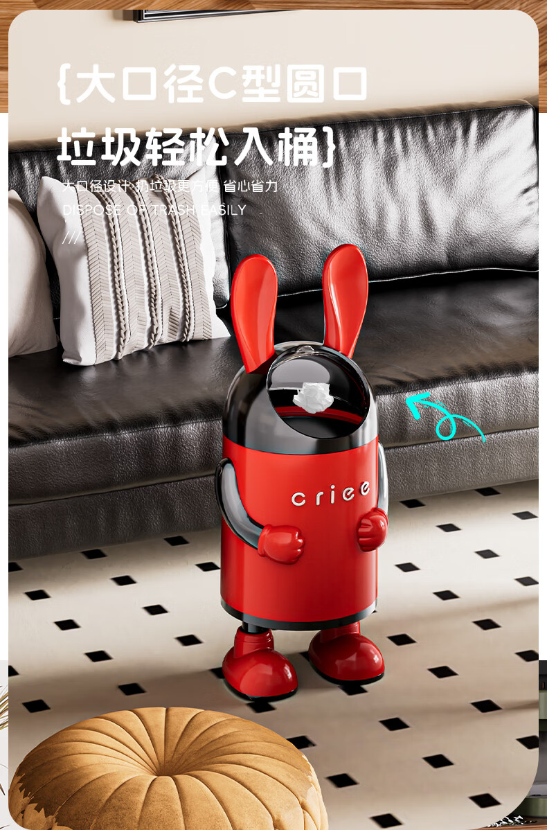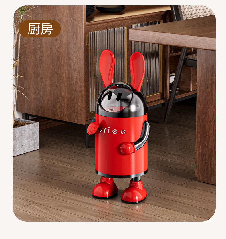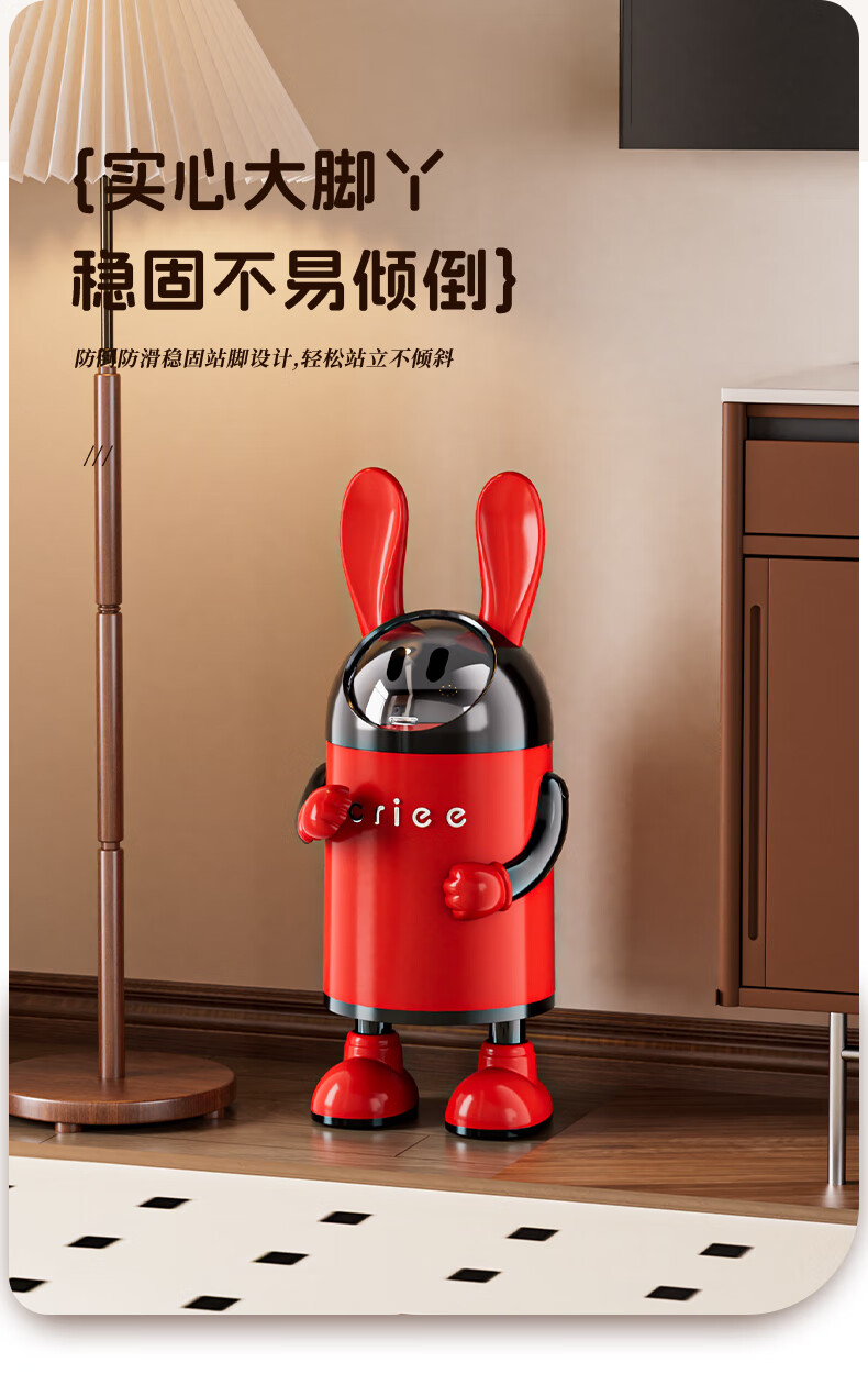 艾仕可(ASCOR)2026新款垃圾桶家用卧室客厅专用可爱轻奢高档带盖大容量创意纸篓 嘻哈兔-复古红【大容量手臂可调】 揭盖式 16L
