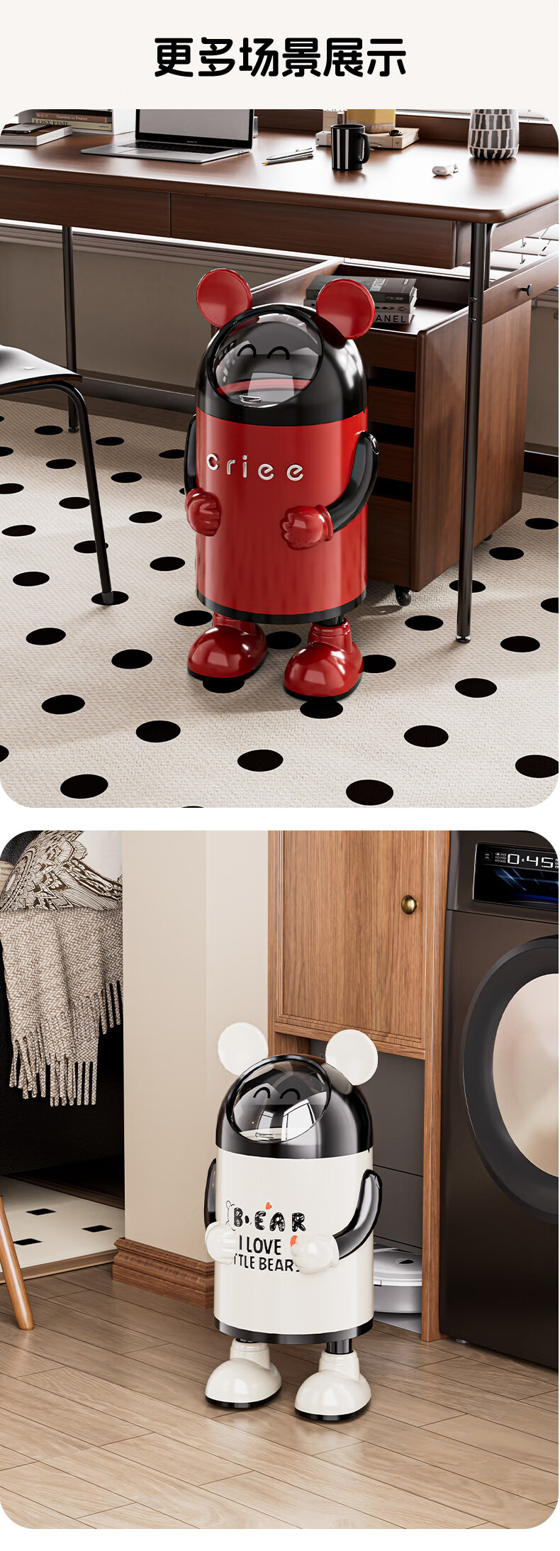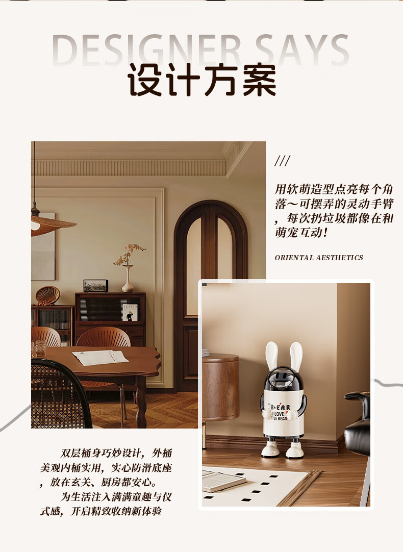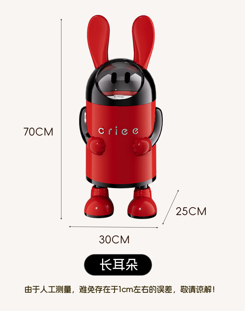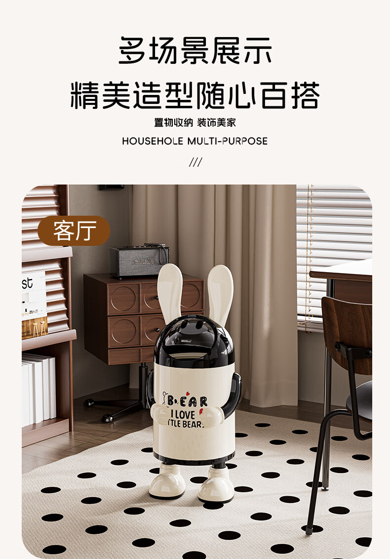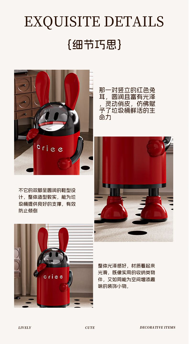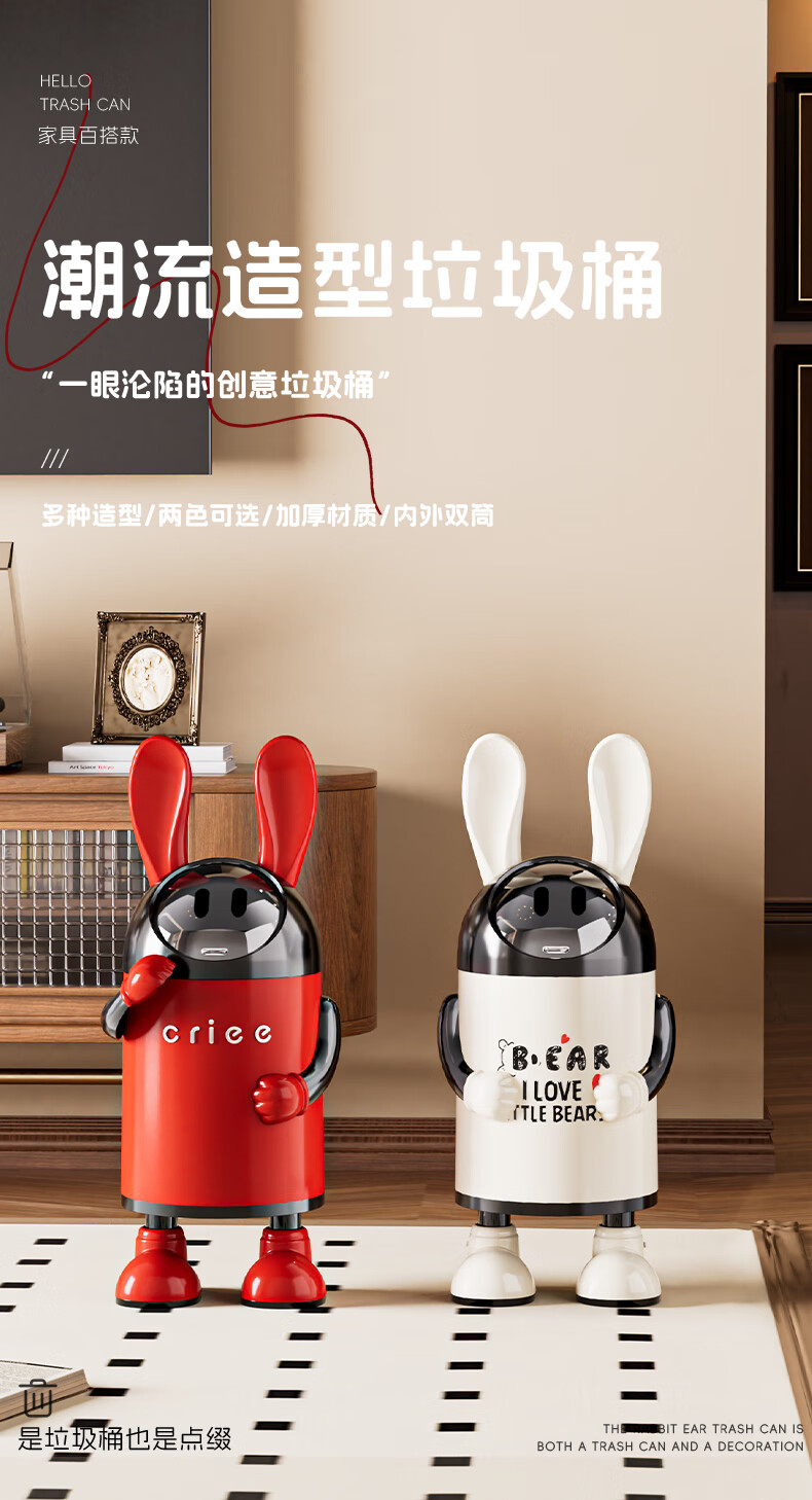 艾仕可(ASCOR)2026新款垃圾桶家用卧室客厅专用可爱轻奢高档带盖大容量创意纸篓 嘻哈兔-复古红【大容量手臂可调】 揭盖式 16L