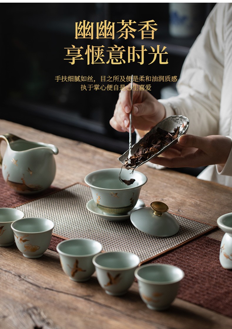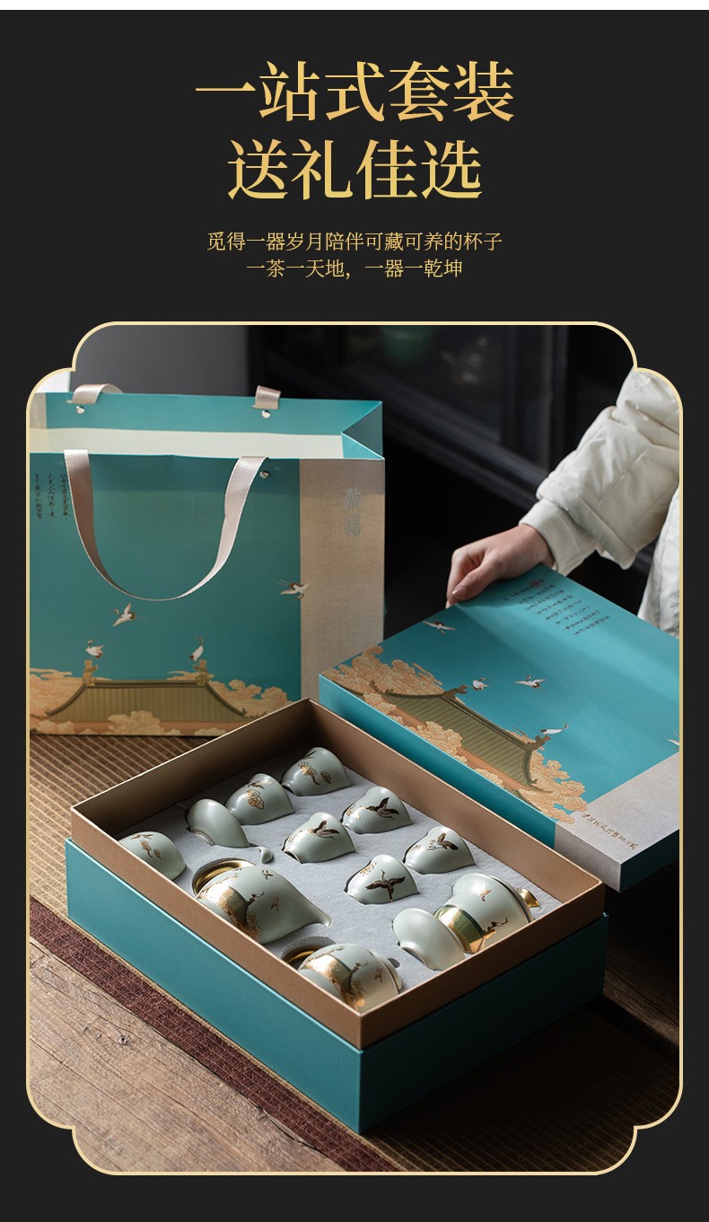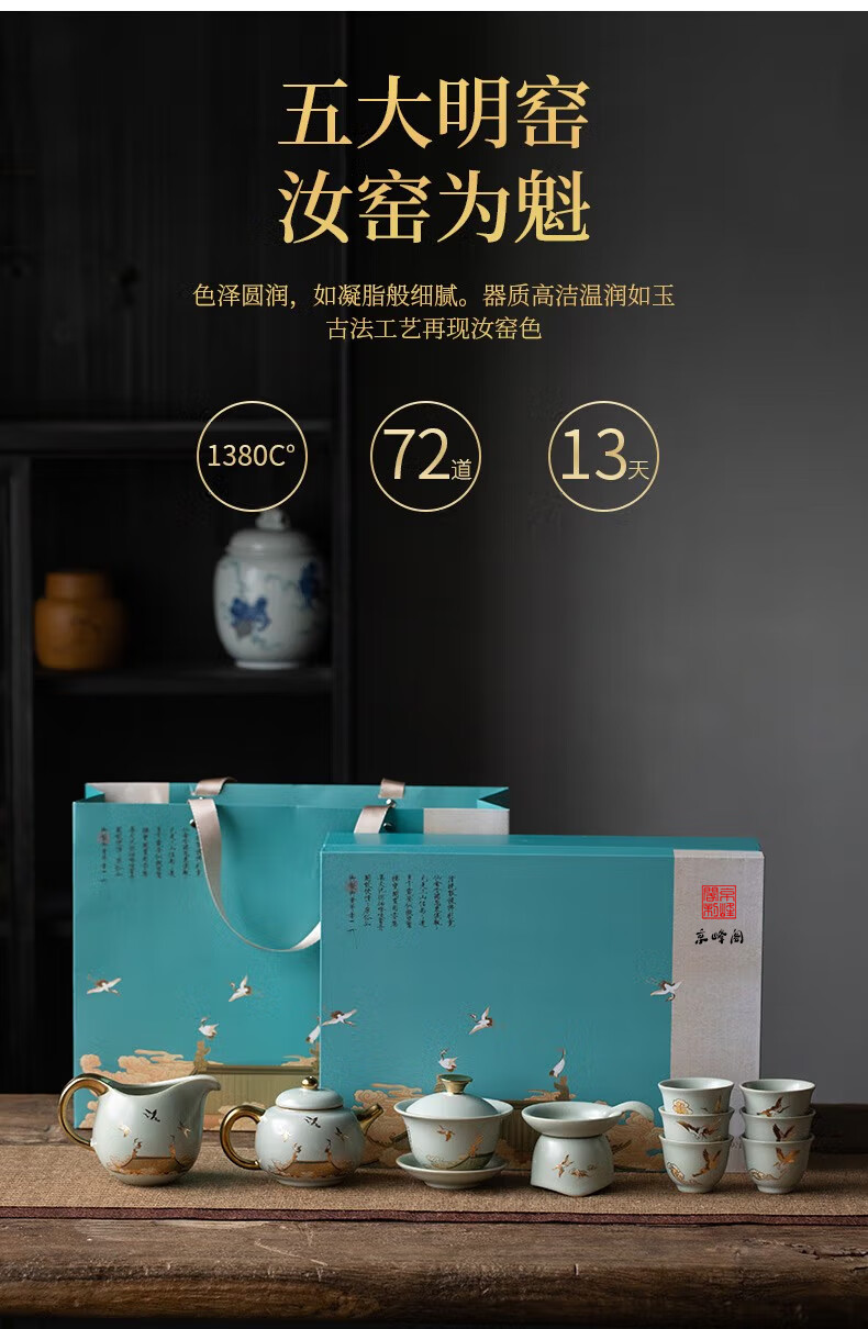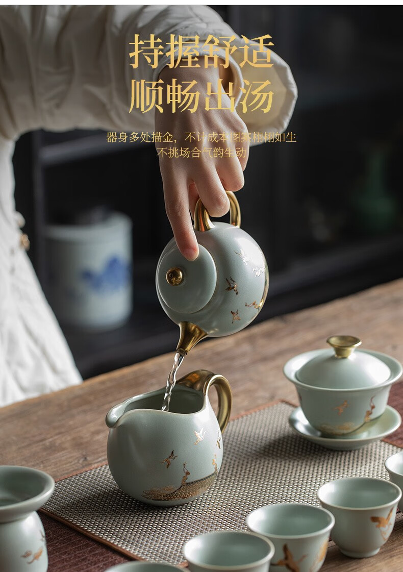 京峰阁 功夫茶具套装 茶壶汝窑瑞鹤呈祥盖碗茶杯可开片高档轻奢家用送礼 瑞鹤呈祥贵妃壶套装 6人饮 11件