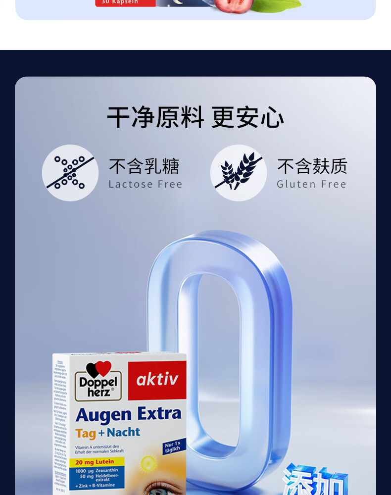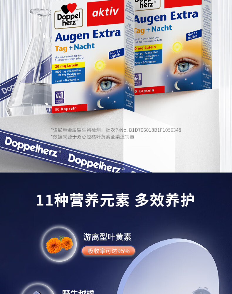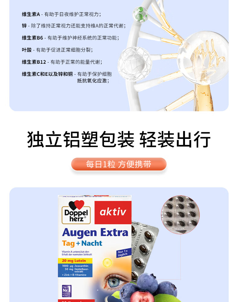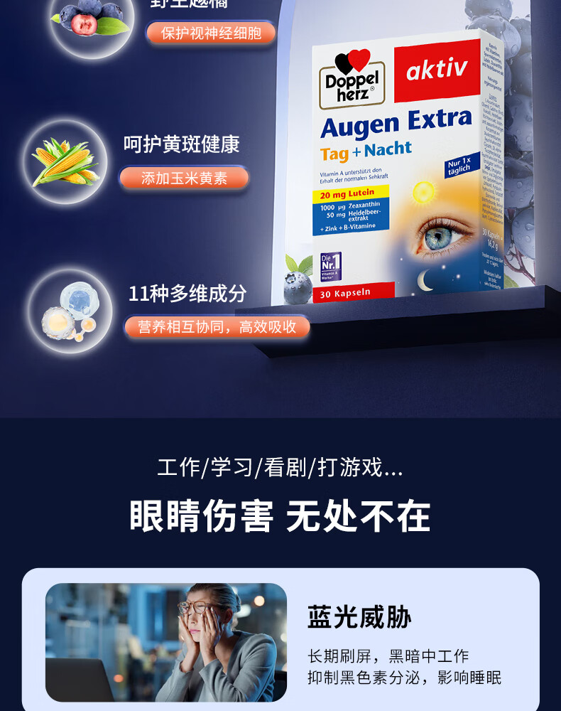 双心(Doppel herz)德国蓝莓叶黄素升级越橘成人玉米黄质维生素B多维配方护眼胶囊 【周期装】 30粒*3盒