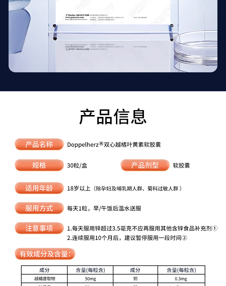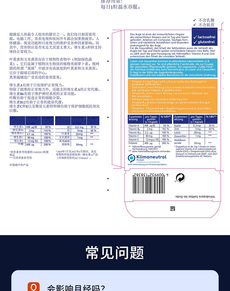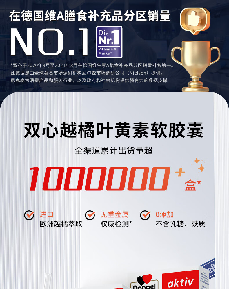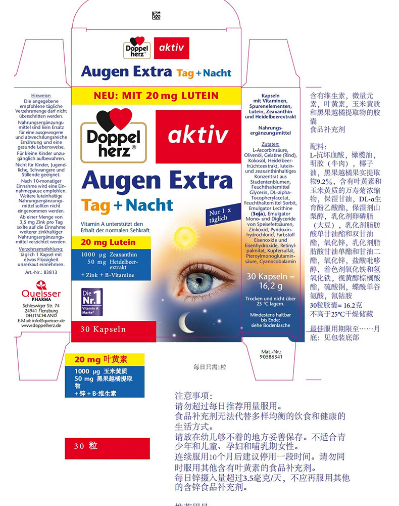 双心(Doppel herz)德国蓝莓叶黄素升级越橘成人玉米黄质维生素B多维配方护眼胶囊 【周期装】 30粒*3盒