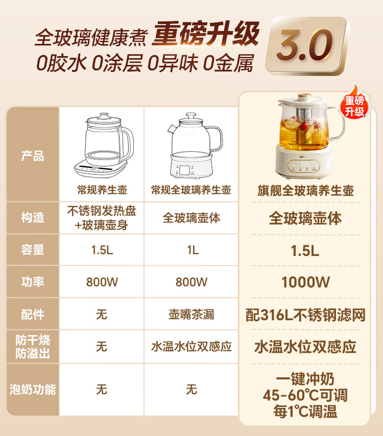 小熊(Bear)全玻璃养生壶 纯玻璃煮茶壶恒温壶 多功能炖煮花茶壶 1.5L YSH-H15L2
