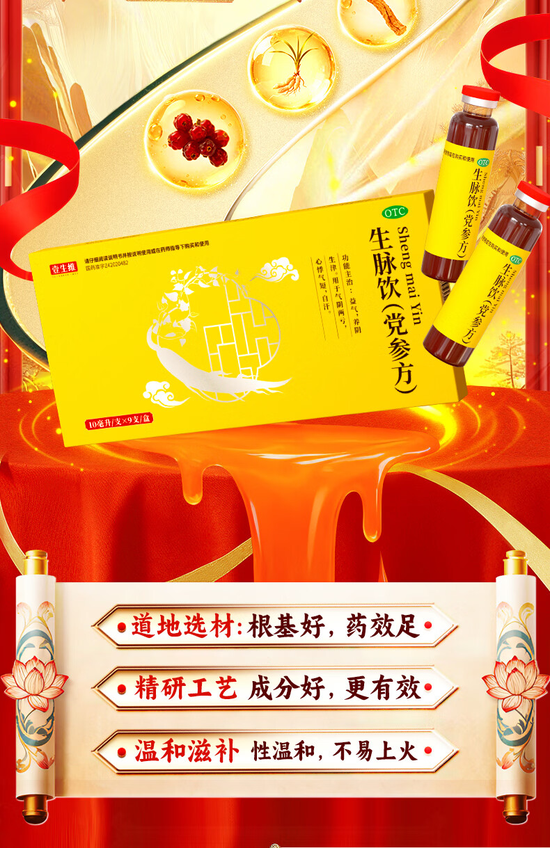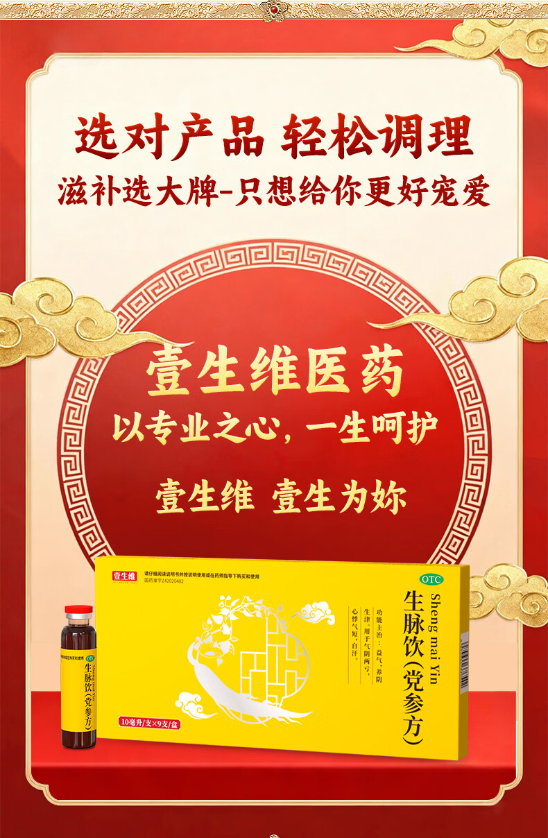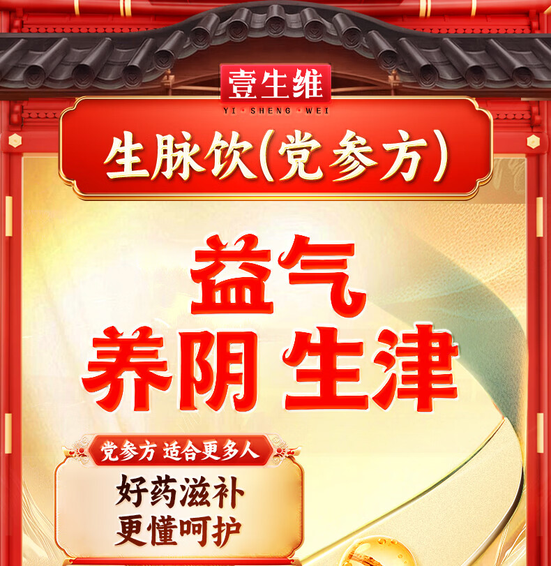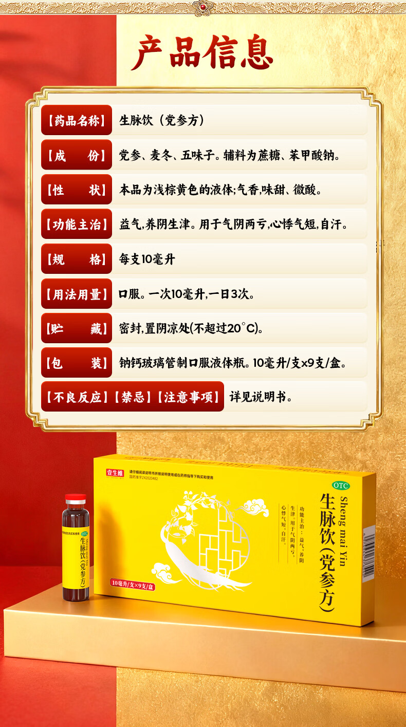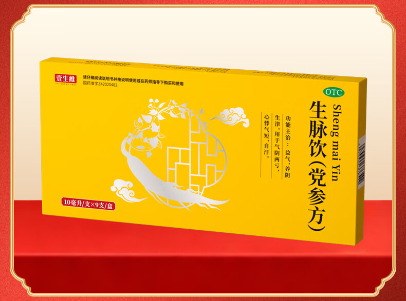 [壹生维]生脉饮(党参方) 10ml*9支 5盒装 益气养阴生津气阴两亏心悸气短自汗补气血口服液女滋补品国药准字年货礼品袋装 礼袋装 送礼佳选