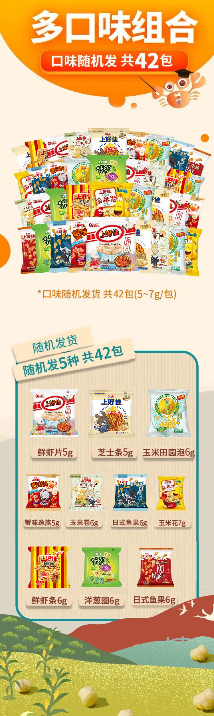 上好佳 薯片虾片膨化食品休闲零食随机口味5-7g小零食 42包