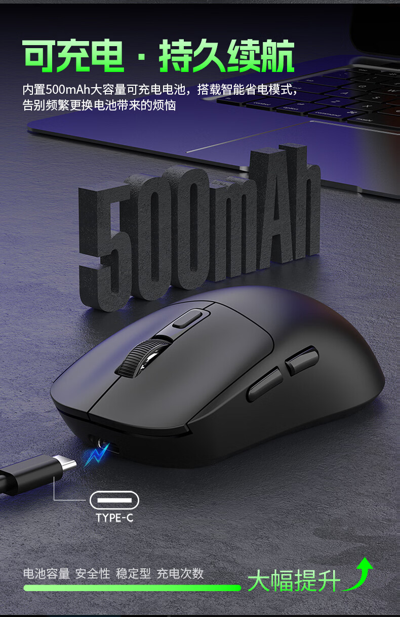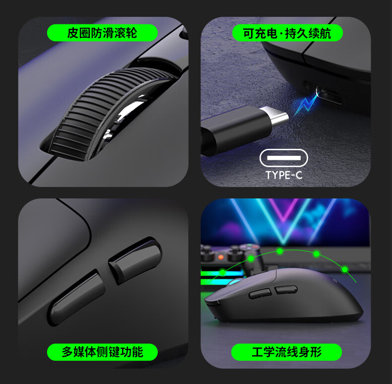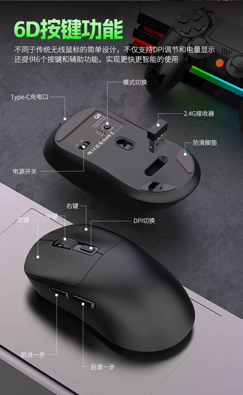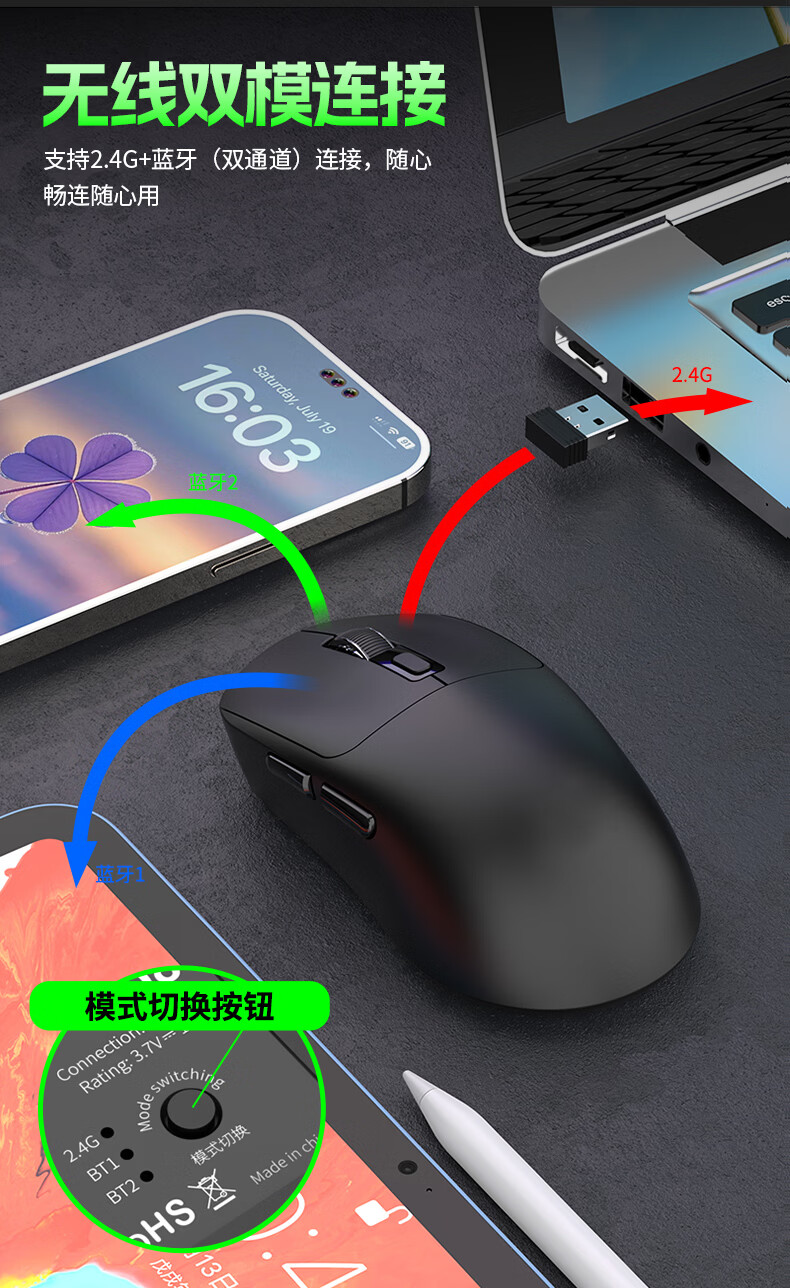 DCOMA轻量化无线鼠标家用办公游戏充电双模蓝牙静音LED笔记本台式电脑 轻量化可充电三模蓝牙静音无线鼠标-黑色+送鼠标垫