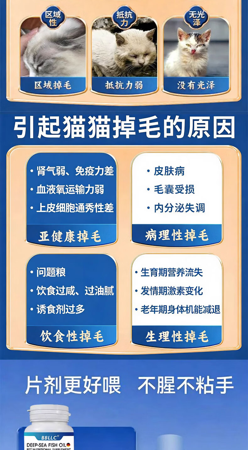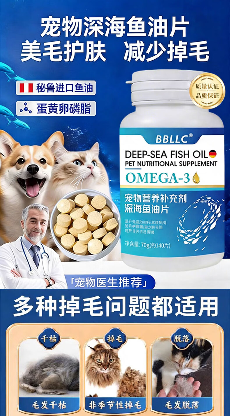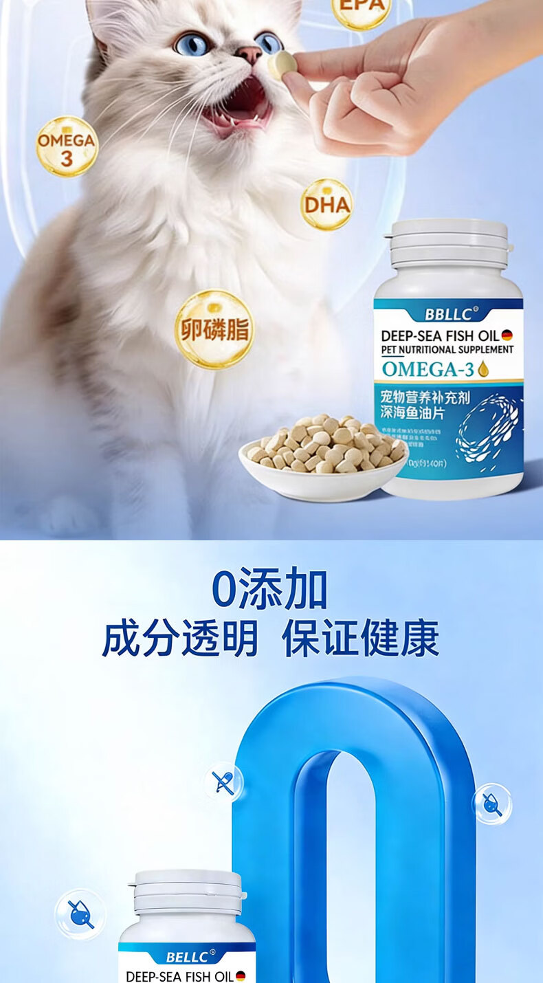 BBLAB猫掉毛严重吃什么防止脱毛深海鱼油片猫用宠物鱼油猫咪专用防掉毛 1瓶【140片】