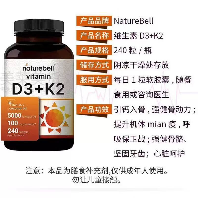 NATUREBELLNatureBell维生素5000IU D3 K2软胶囊240粒 含初榨椰子油 NATUREBELL维生素D3 240粒*1瓶