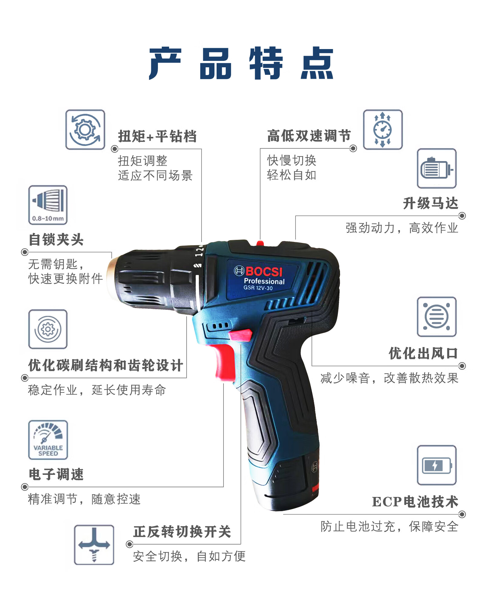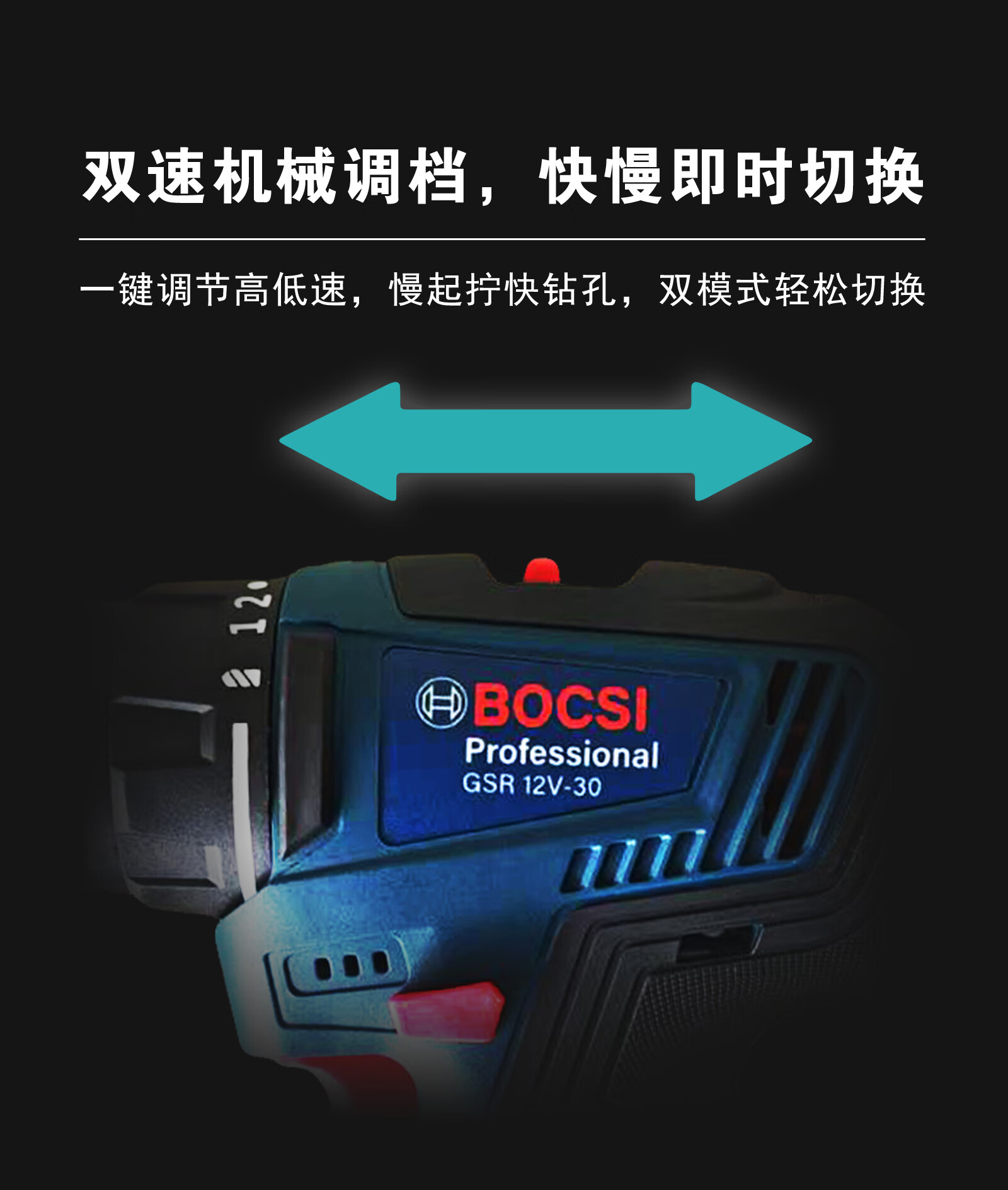 BOCSI博士GSR12V-30无刷锂电钻三用家用充电钻电动螺丝刀起子机手电钻 2.0两电一充【工具组合】