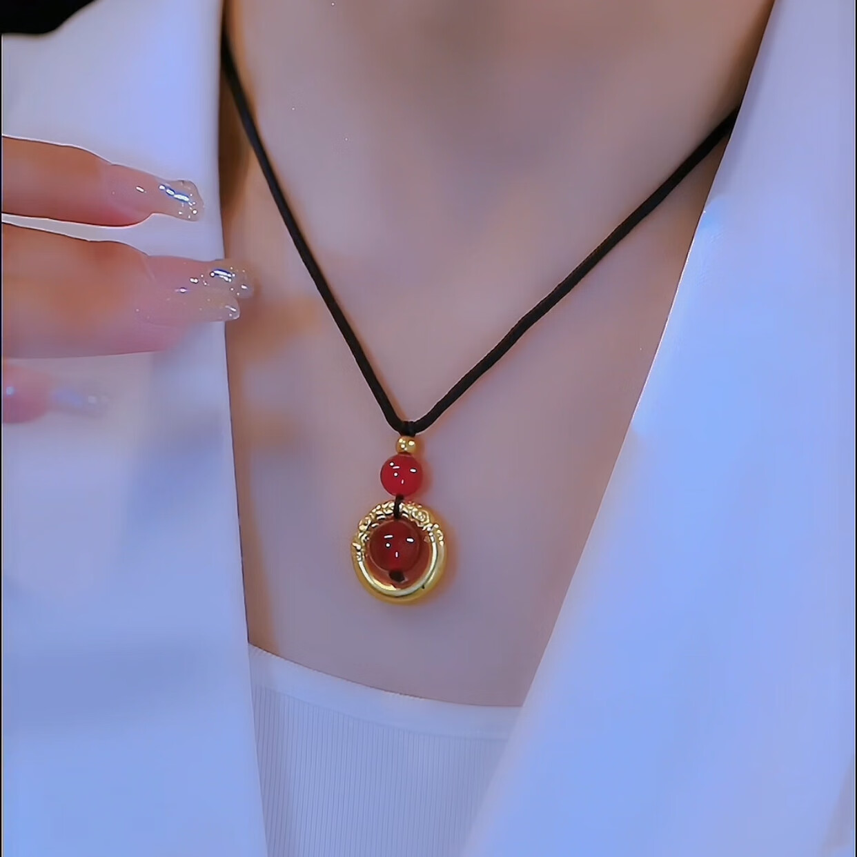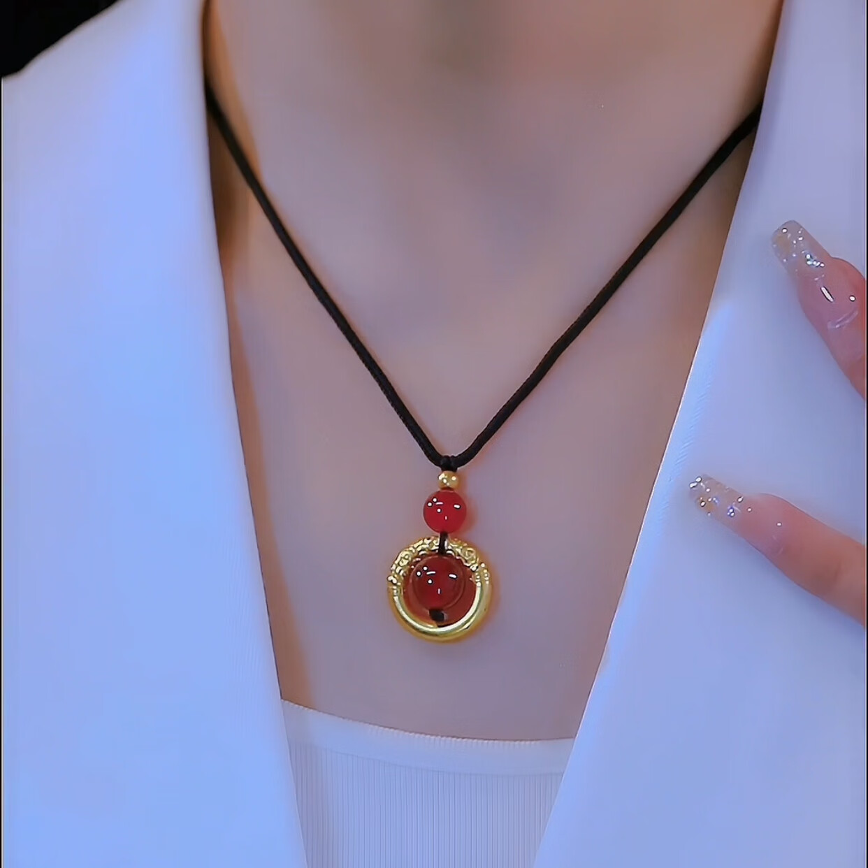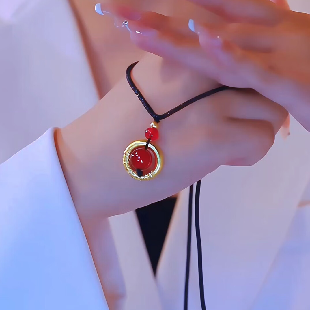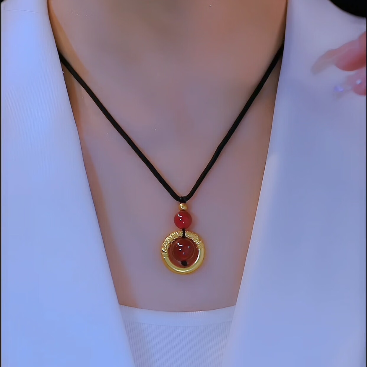 24k仿黄金平安扣吊坠金箍圈转运珠编织绳项链红玛瑙相思红豆情侣 相思豆红豆黑绳项链