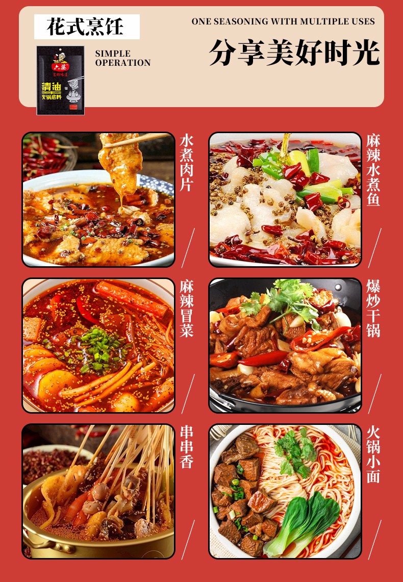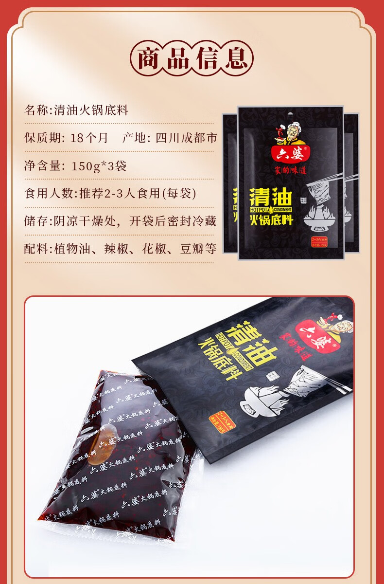 六婆清油火锅底料150g*3袋四川麻辣火锅植物油火锅调味料麻辣烫调料 清油火锅150g*3袋+香辣蘸料2g*10袋