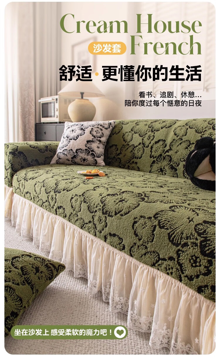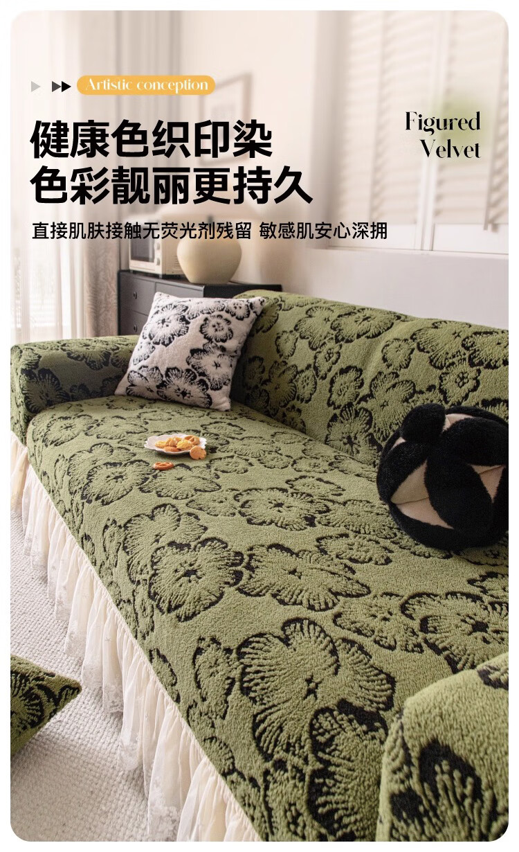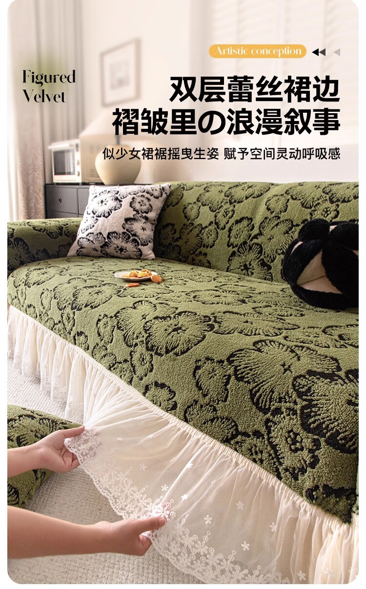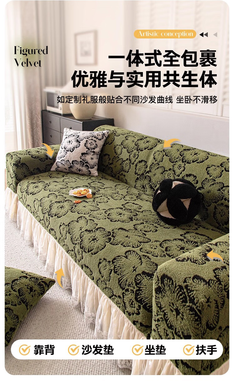金拾美月复古轻奢沙发全包套秋冬季防猫抓2026新款加厚毛绒沙发坐垫盖布 墨织裙边-绿色 全包单人/适用90-140cm建议拍大一码