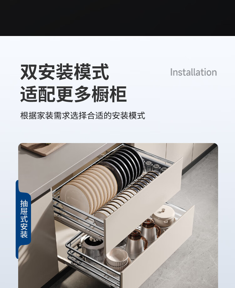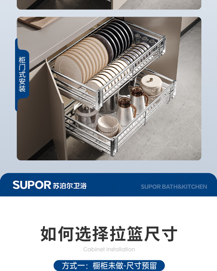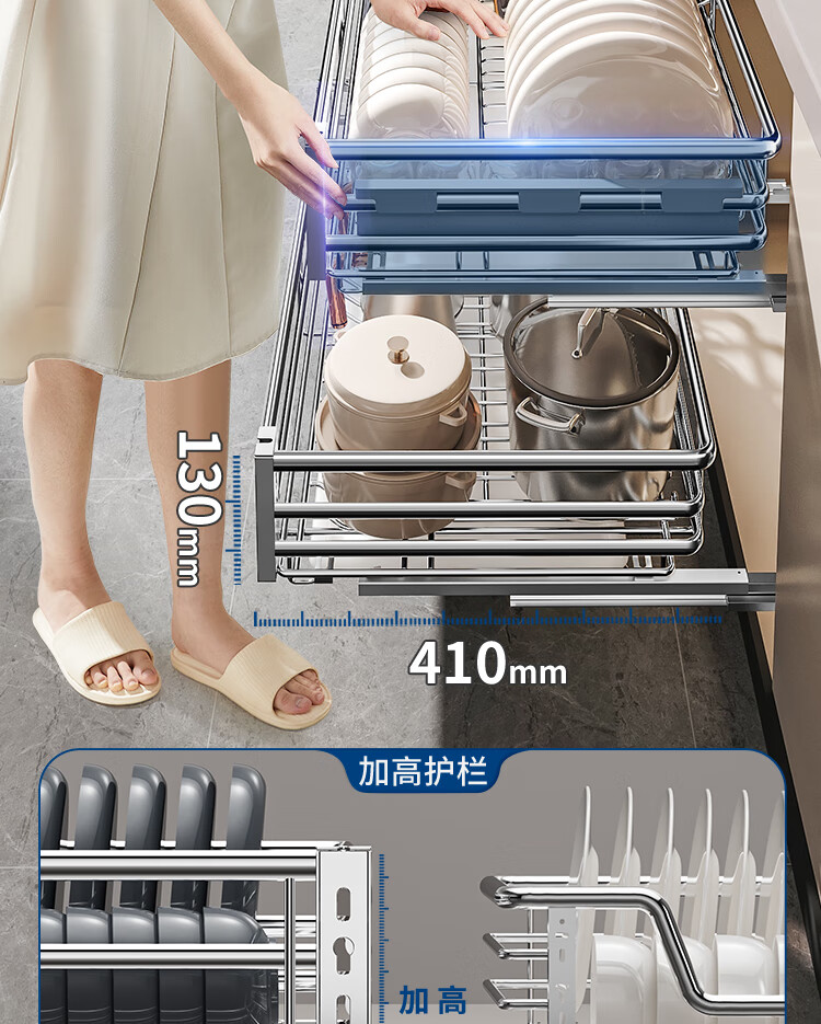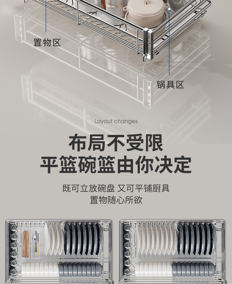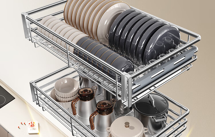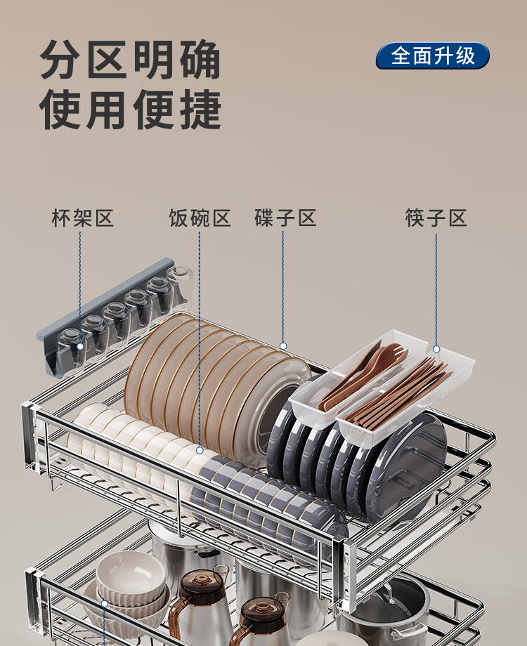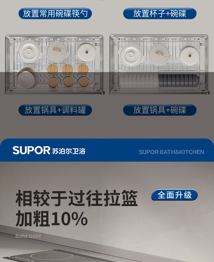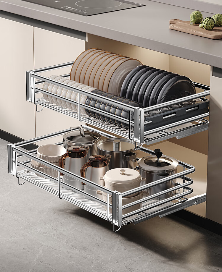 苏泊尔拉篮抽屉式厨房橱柜不锈钢碗碟置物架碗筷盘子收纳架碗篮收纳柜 【本色双层600柜】适用550-590mm